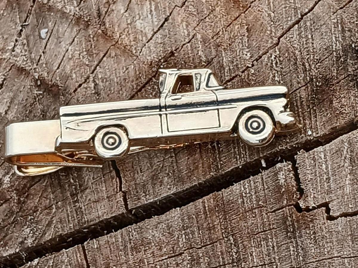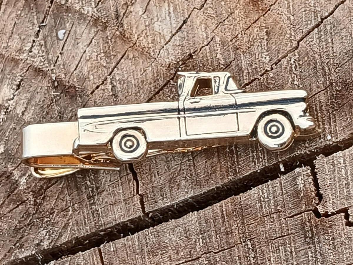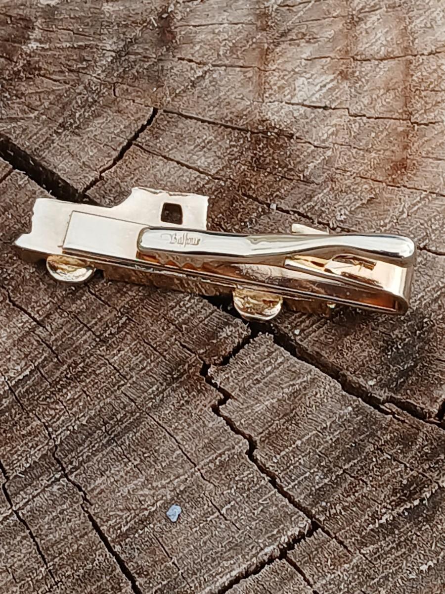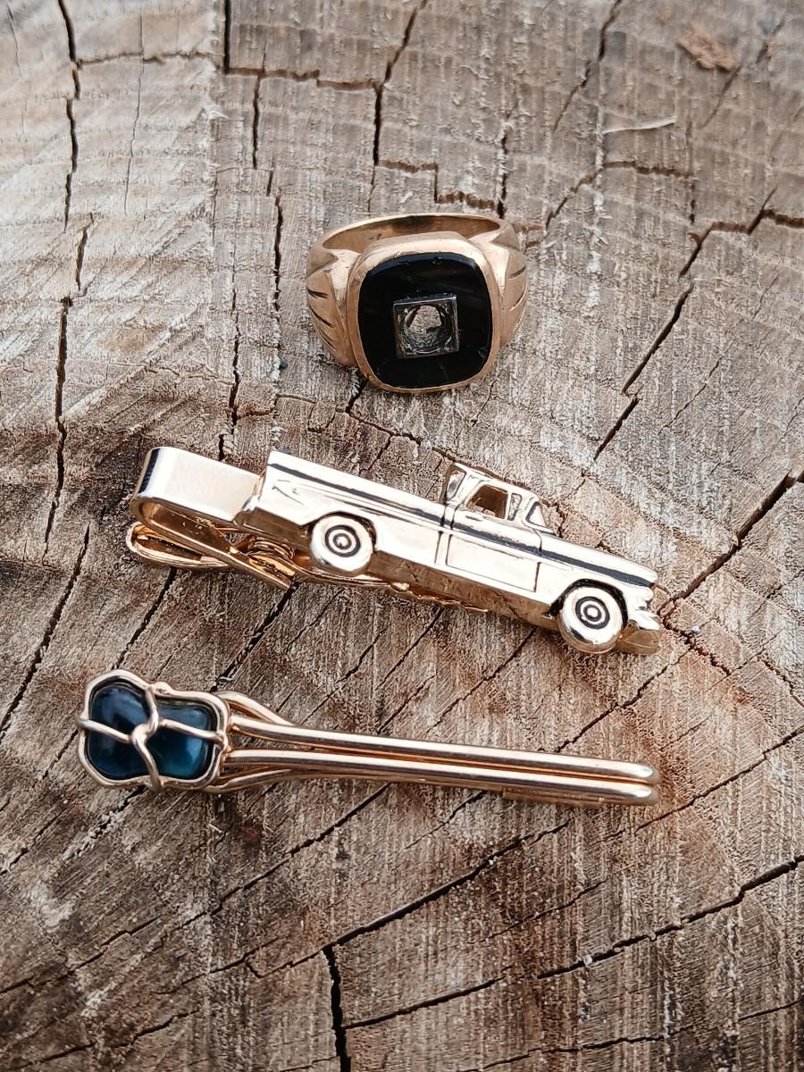 Vintage Size 7.5 men's Onyx ring marked 12 - and two vintage collectible tie clips - Balfour pickup truck & Swank blue gemstone