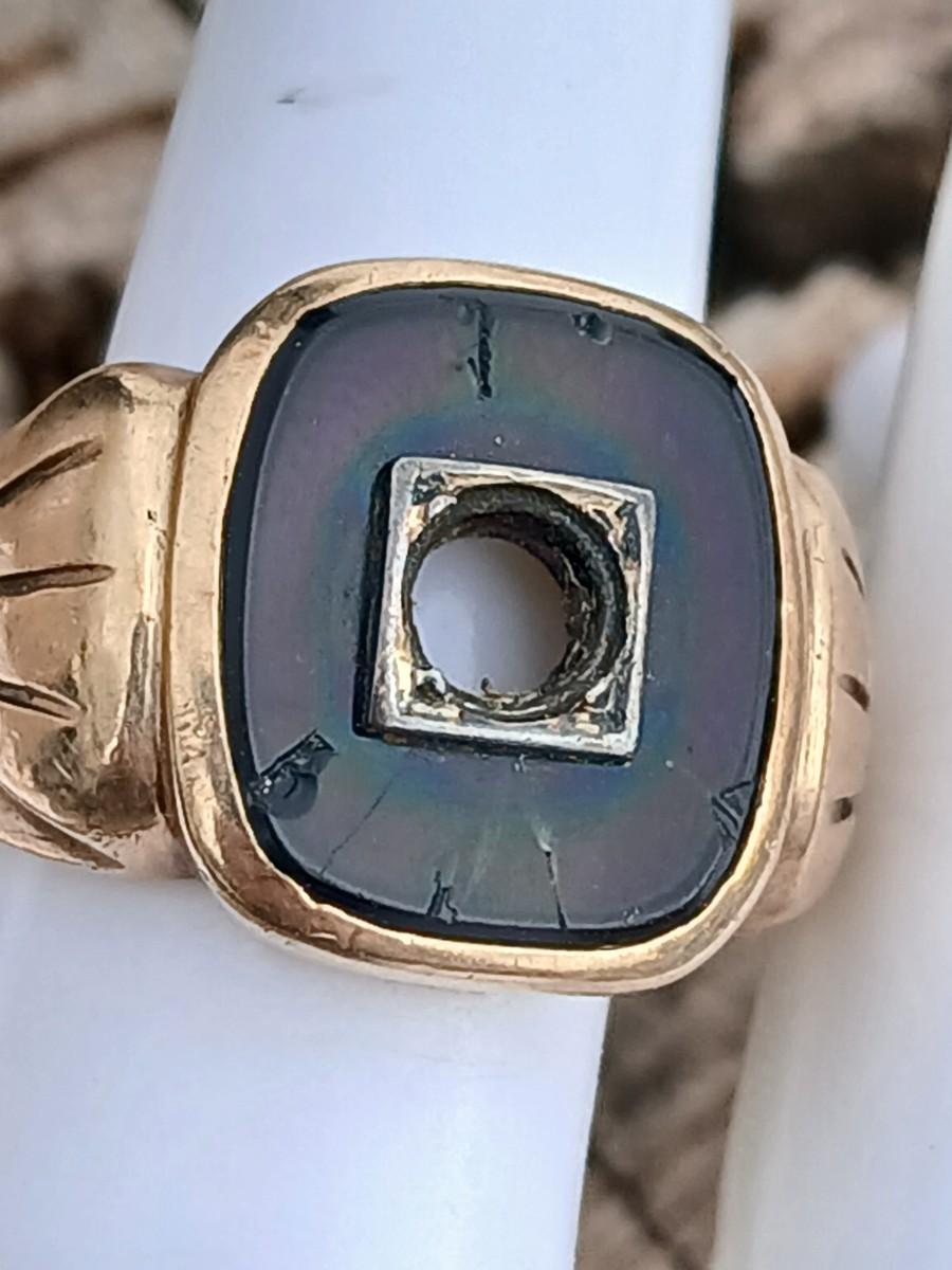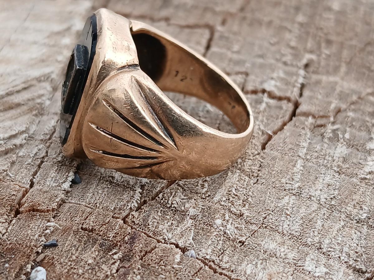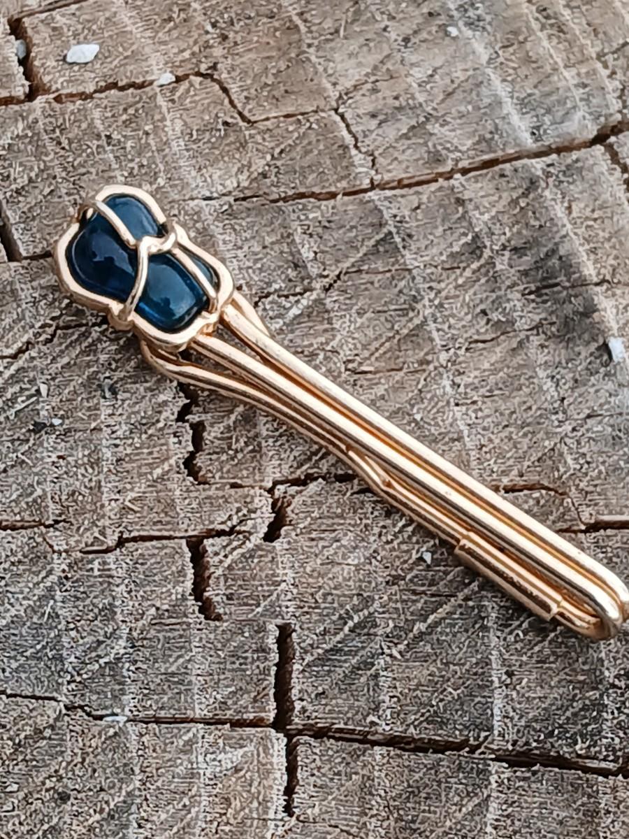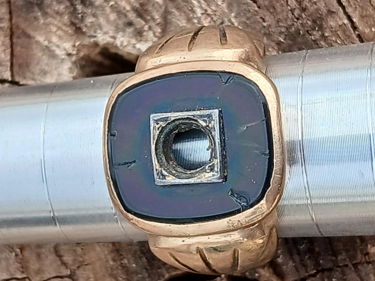 Vintage Size 7.5 men's Onyx ring marked 12 - and two vintage collectible tie clips - Balfour pickup truck & Swank blue gemstone