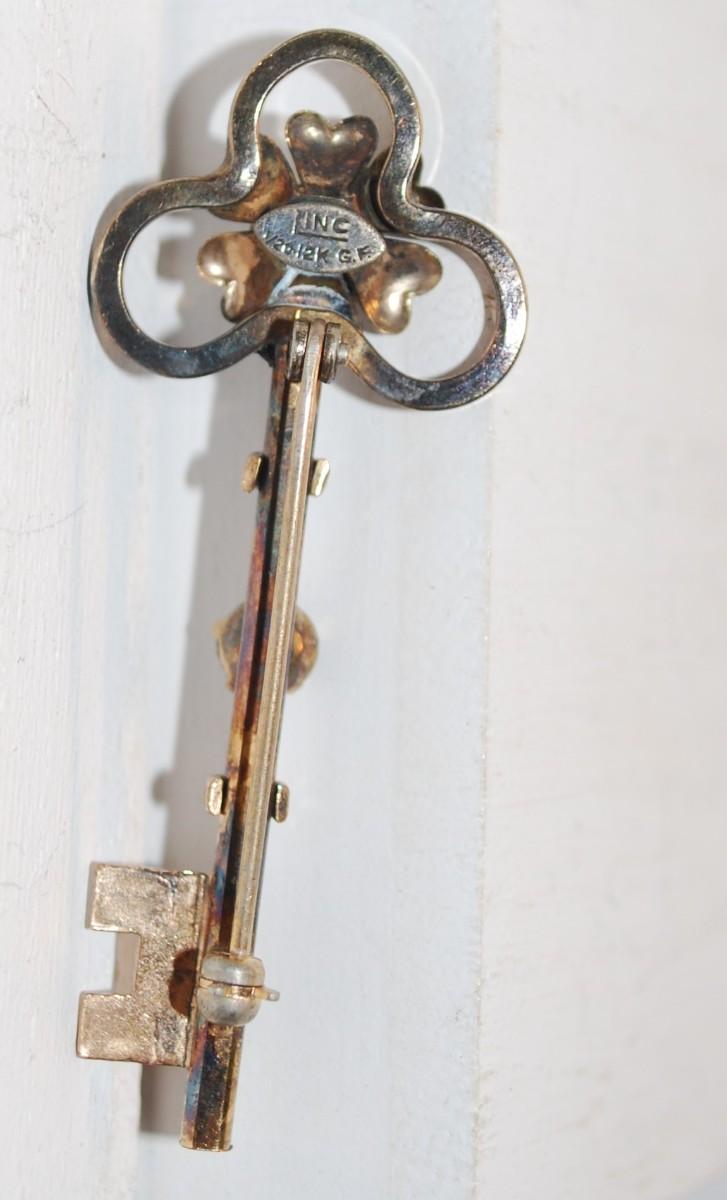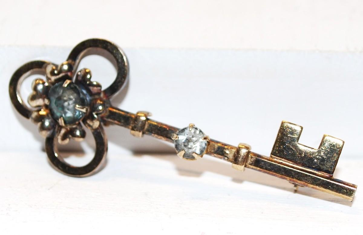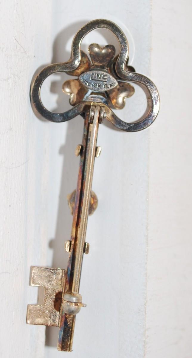 VINTAGE "Skeleton Key & Stones" Very Stylish BROOCH Marked "Linc 1/20 12k G.F." 2¼" L