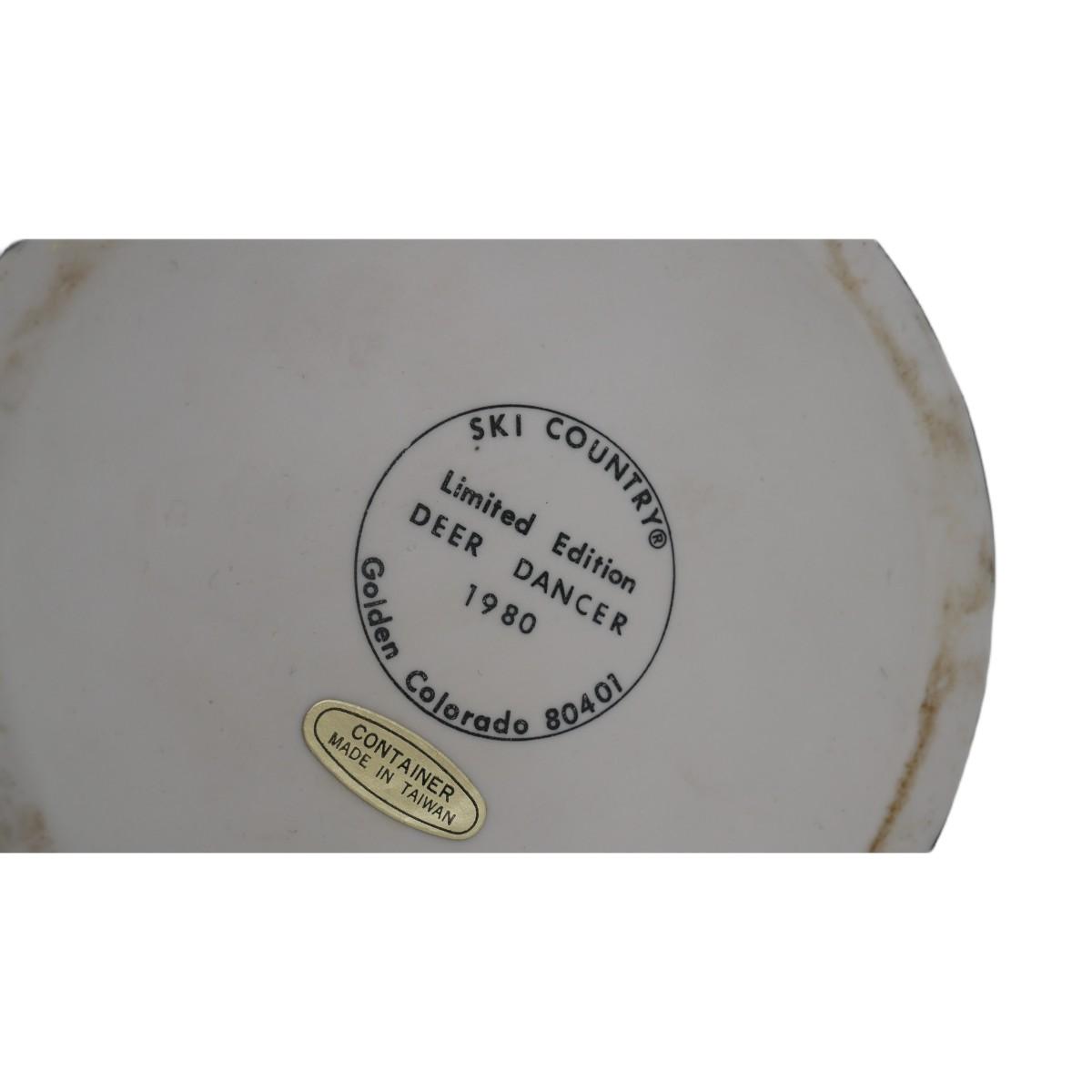 Vintage limited edition Native American "Deer Dancer" 1980 Ski Country Kentucky straight bourbon whiskey ceramic decanter. Bottle is empty and lid is sealed shut. This piece is for decorative purposes only. Measures L 5" x H 13.5". Weighs 2 lb 8 oz. (C89)