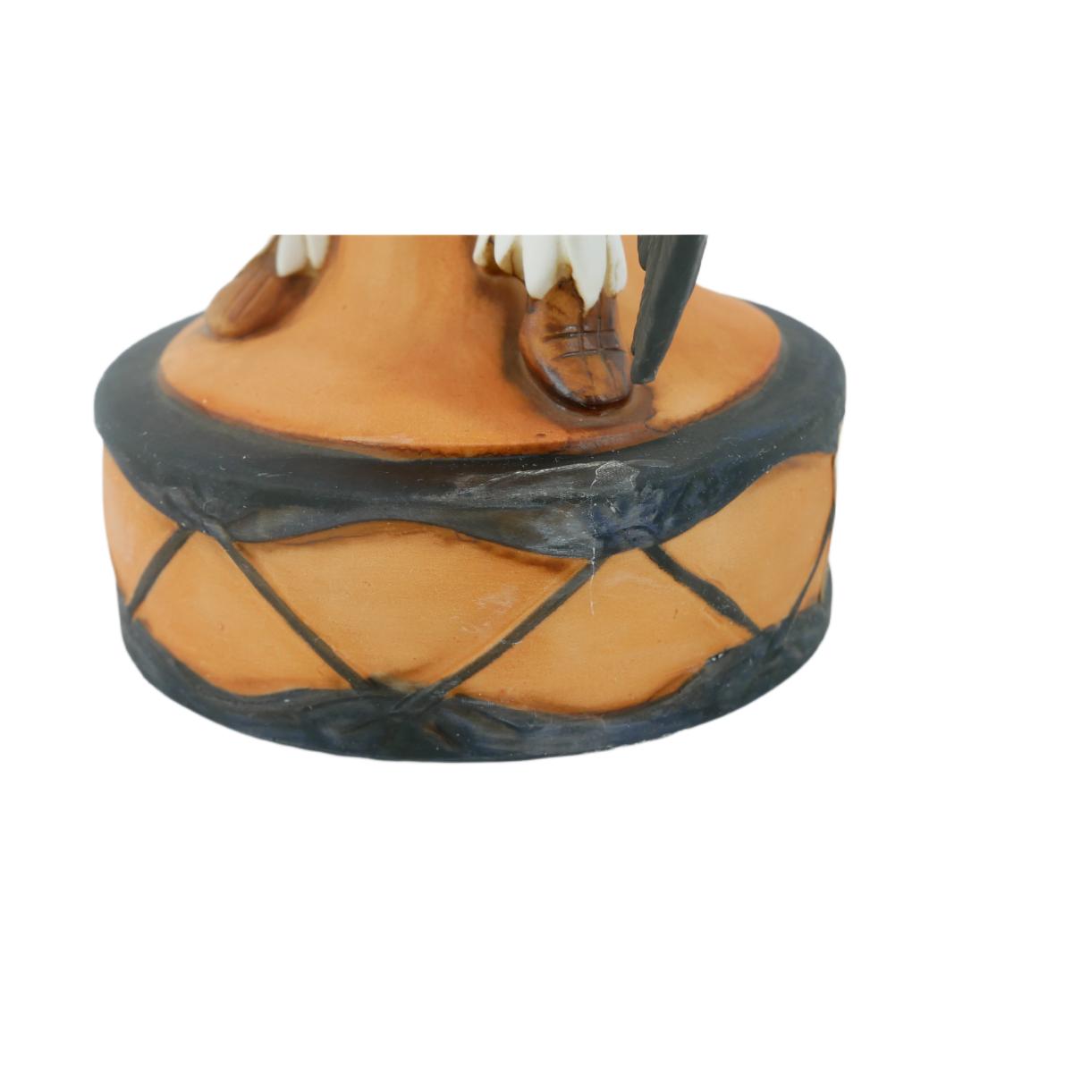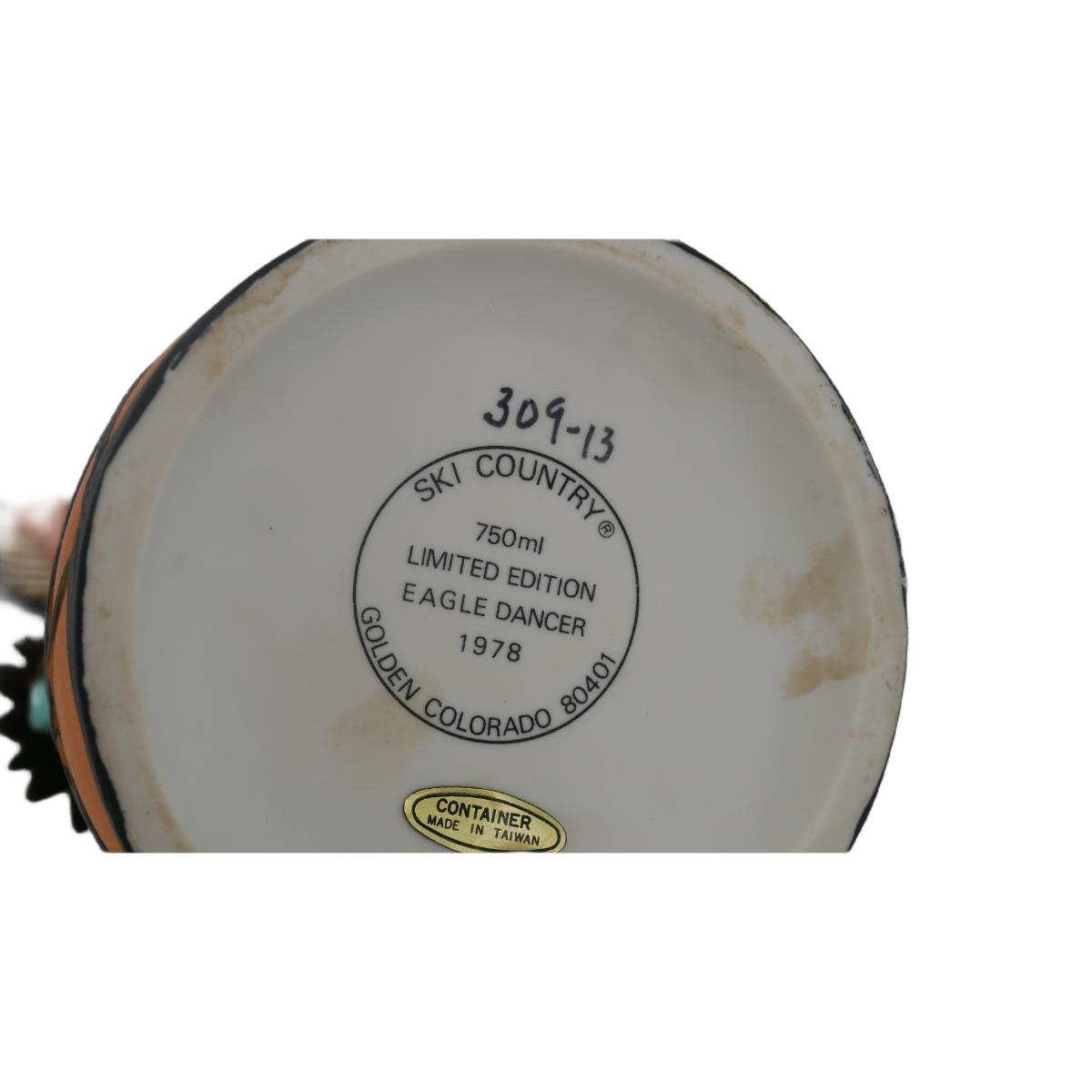 Vintage limited edition Native American "Eagle Dancer" 1978 Ski Country Kentucky straight bourbon whiskey ceramic decanter, signed "Barbara F. Foss" on bottom. Bottle is empty and lid is sealed shut. This piece is for decorative purposes only. Defect in paint on bottom (see photo). Measures L 5" x H 15.5". Weighs 2 lb 4 oz. (C90)