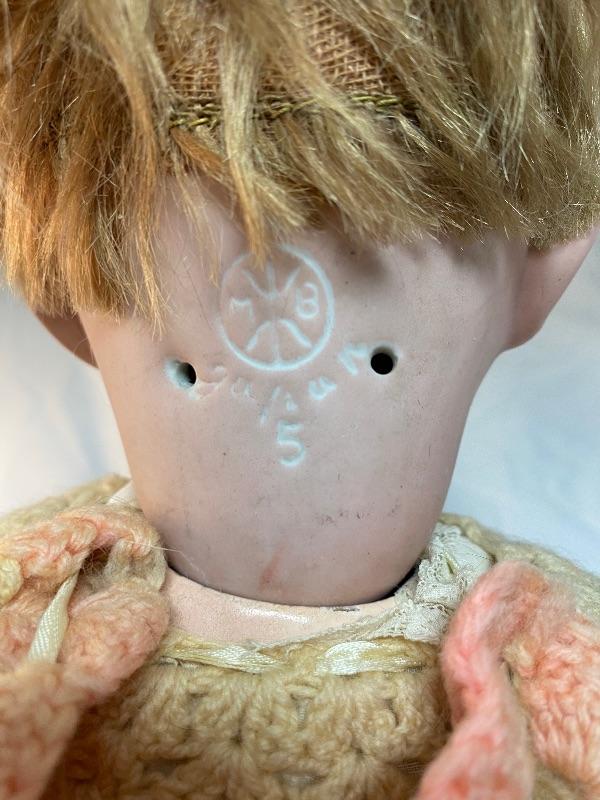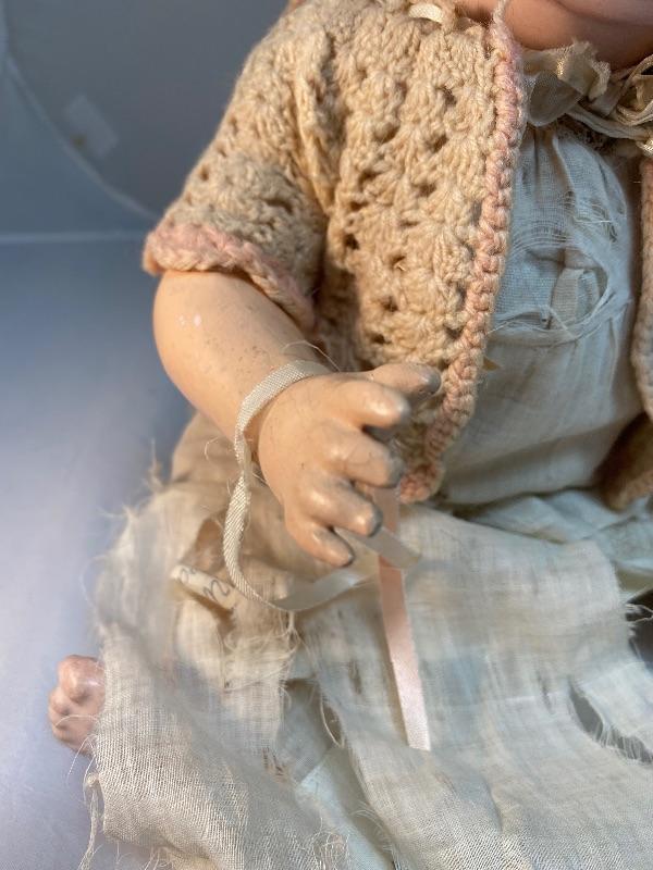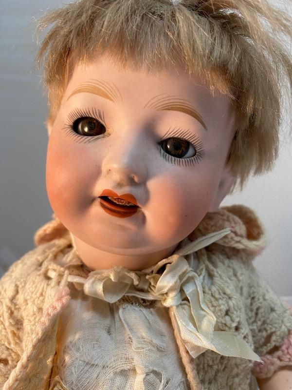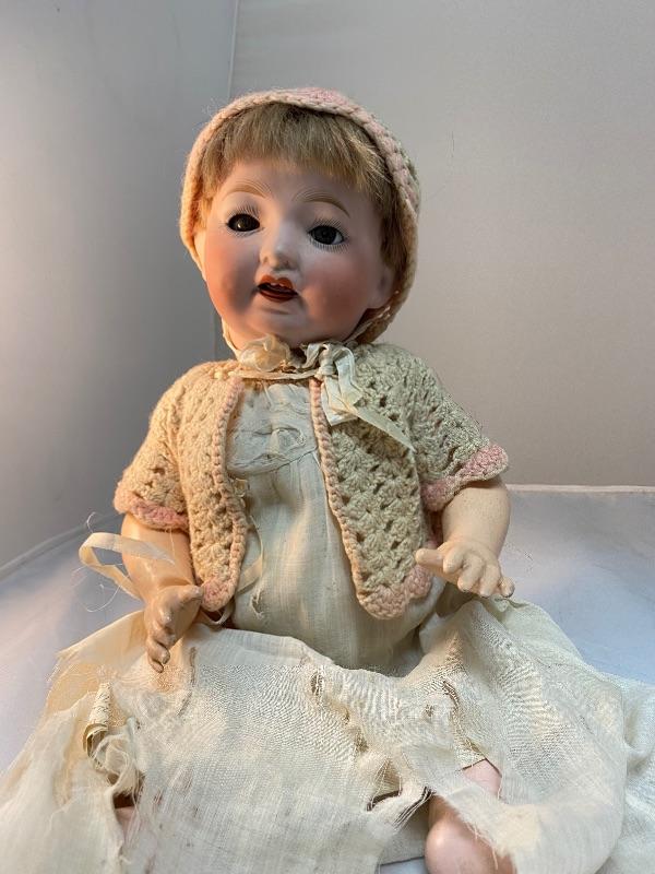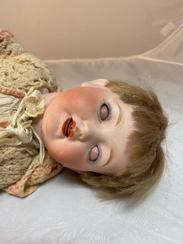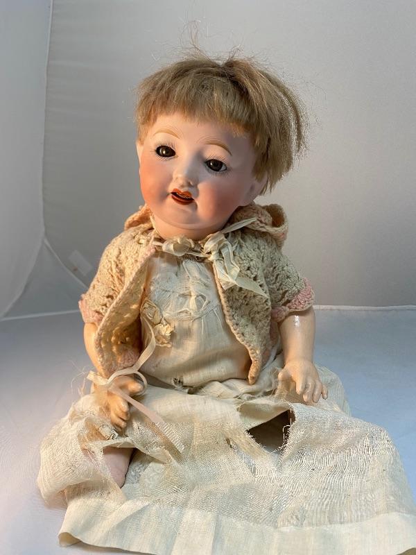 Vintage Doll. Porcelain head with a jointed composite body. Sleep eyes, open mouth. Dusty and dirty from age and display. No cracks in porcelain, but some cracks in composite.