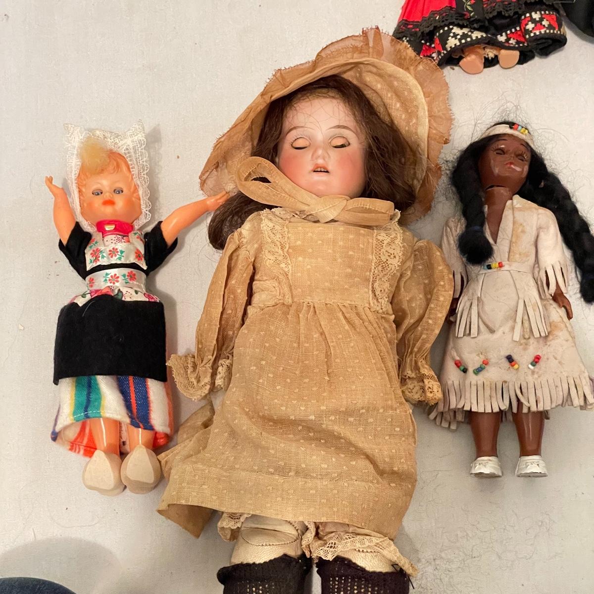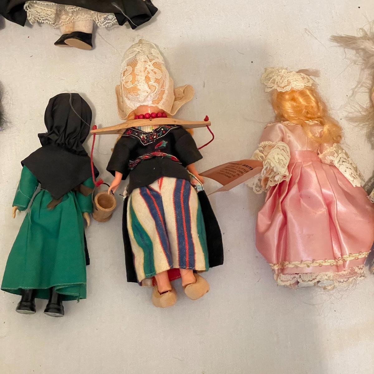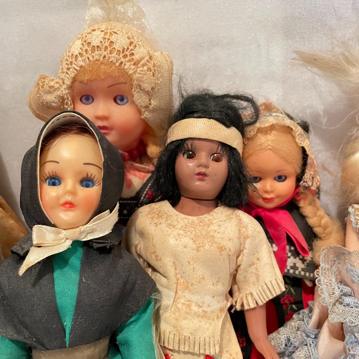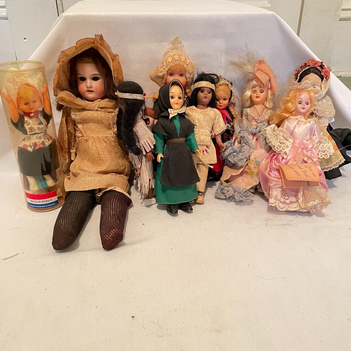 Ten sleepy eyed dolls, most are plastic with a variety of clothing. The largest doll is about 13.5” long with markings on her porcelain top. See images. The doll with the Dutch Doll package arms are detaching and package does not have a lid. Shipping available.