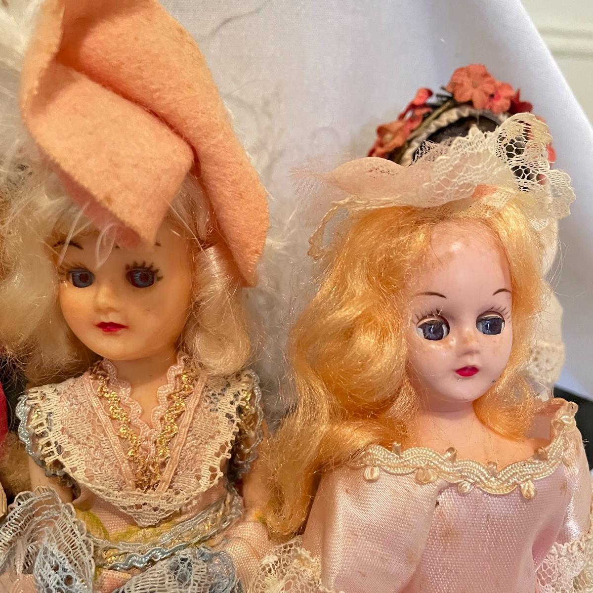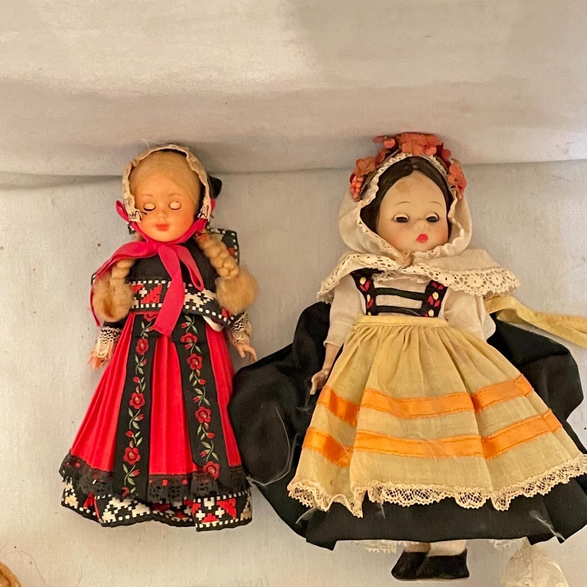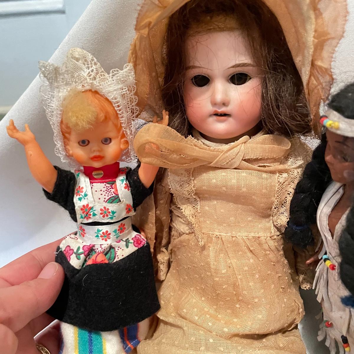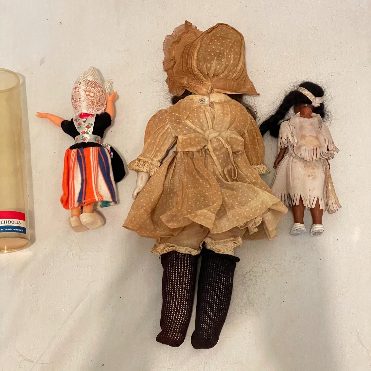 Ten sleepy eyed dolls, most are plastic with a variety of clothing. The largest doll is about 13.5” long with markings on her porcelain top. See images. The doll with the Dutch Doll package arms are detaching and package does not have a lid. Shipping available.