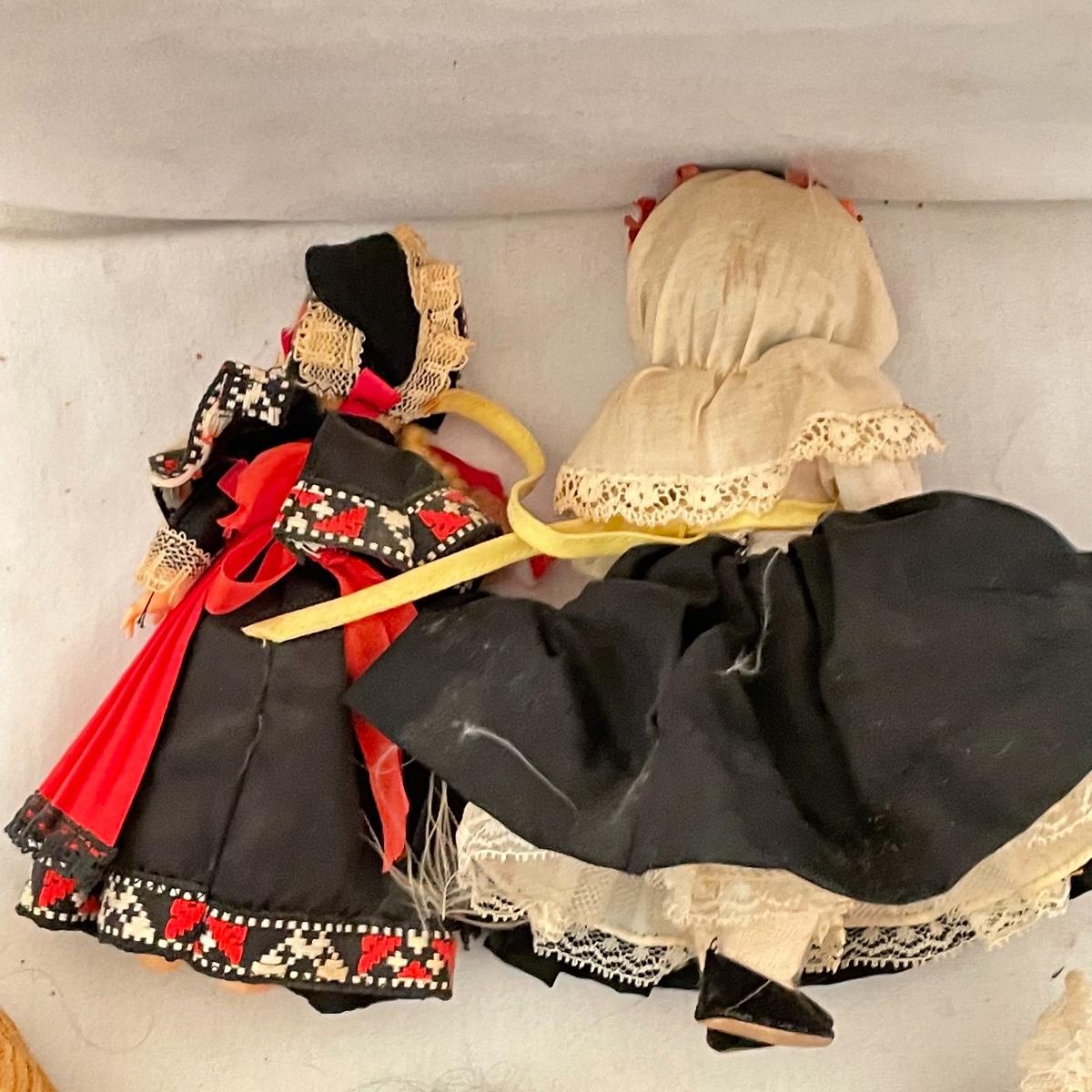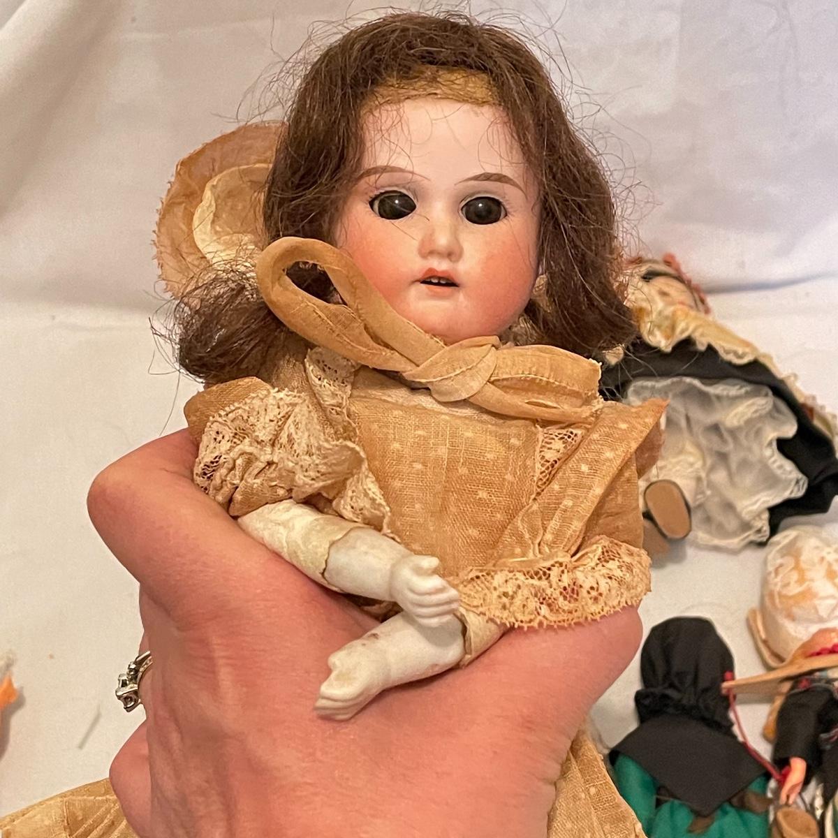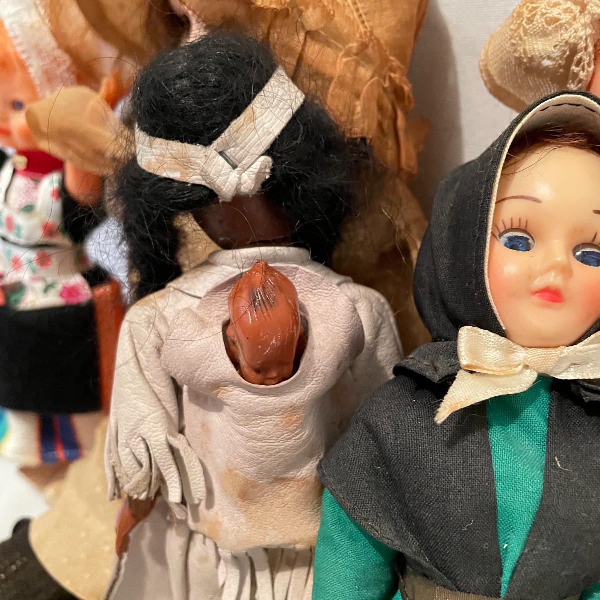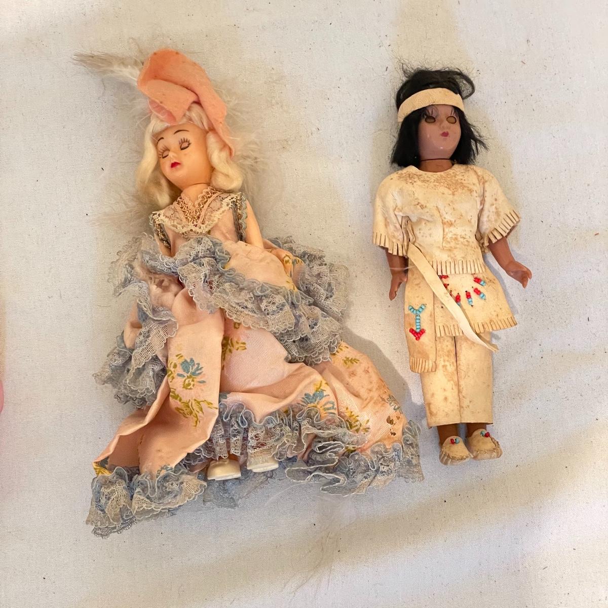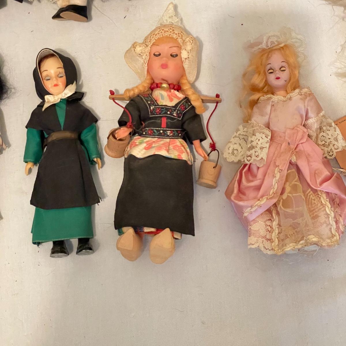 Ten sleepy eyed dolls, most are plastic with a variety of clothing. The largest doll is about 13.5” long with markings on her porcelain top. See images. The doll with the Dutch Doll package arms are detaching and package does not have a lid. Shipping available.