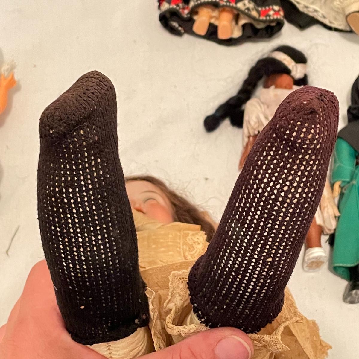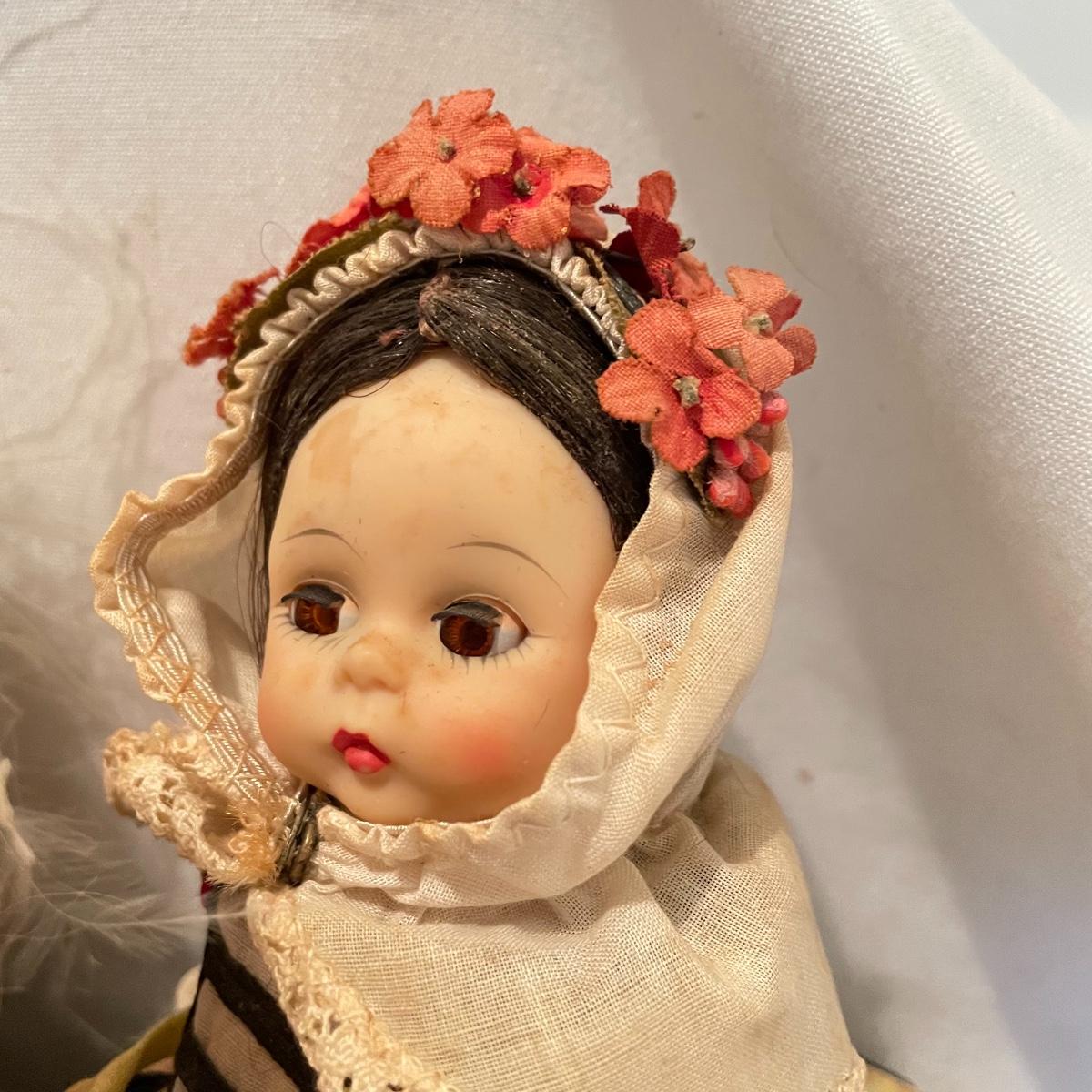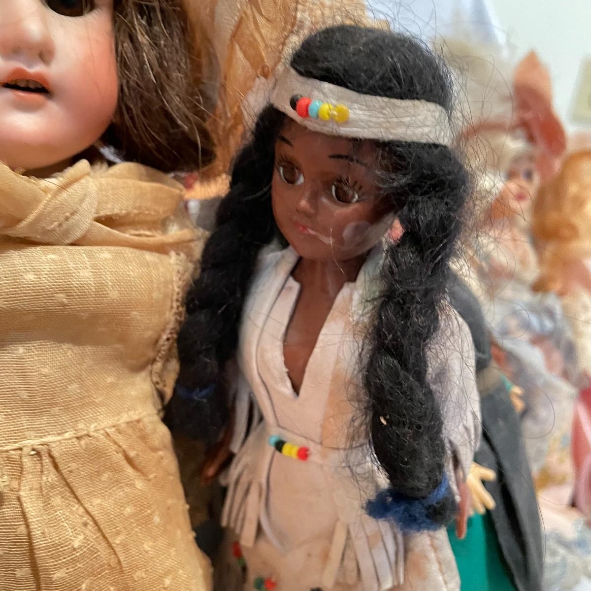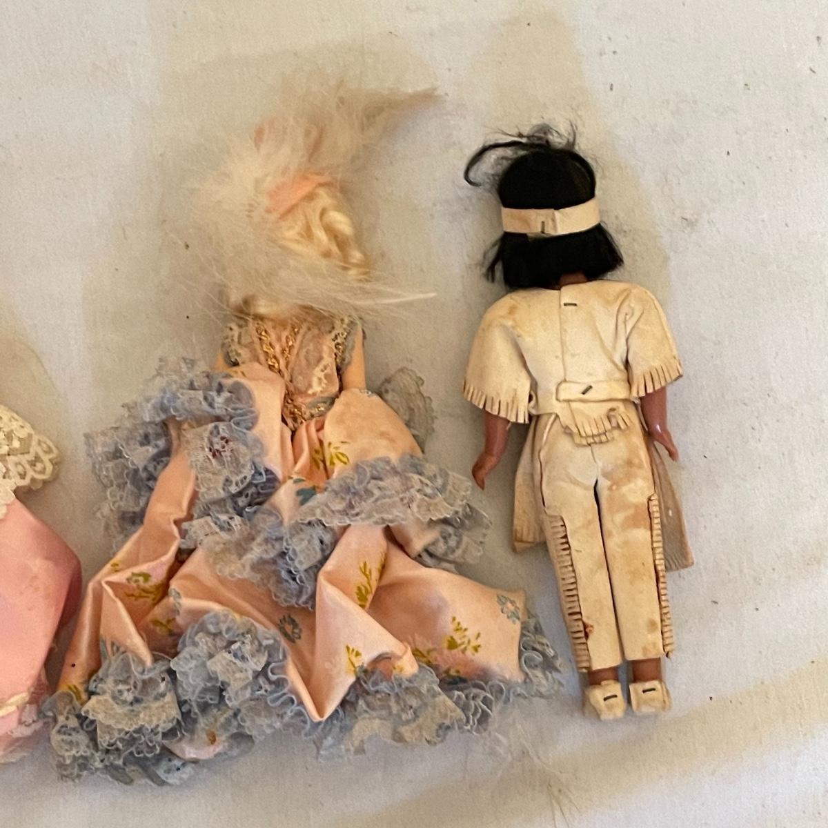 Ten sleepy eyed dolls, most are plastic with a variety of clothing. The largest doll is about 13.5” long with markings on her porcelain top. See images. The doll with the Dutch Doll package arms are detaching and package does not have a lid. Shipping available.
