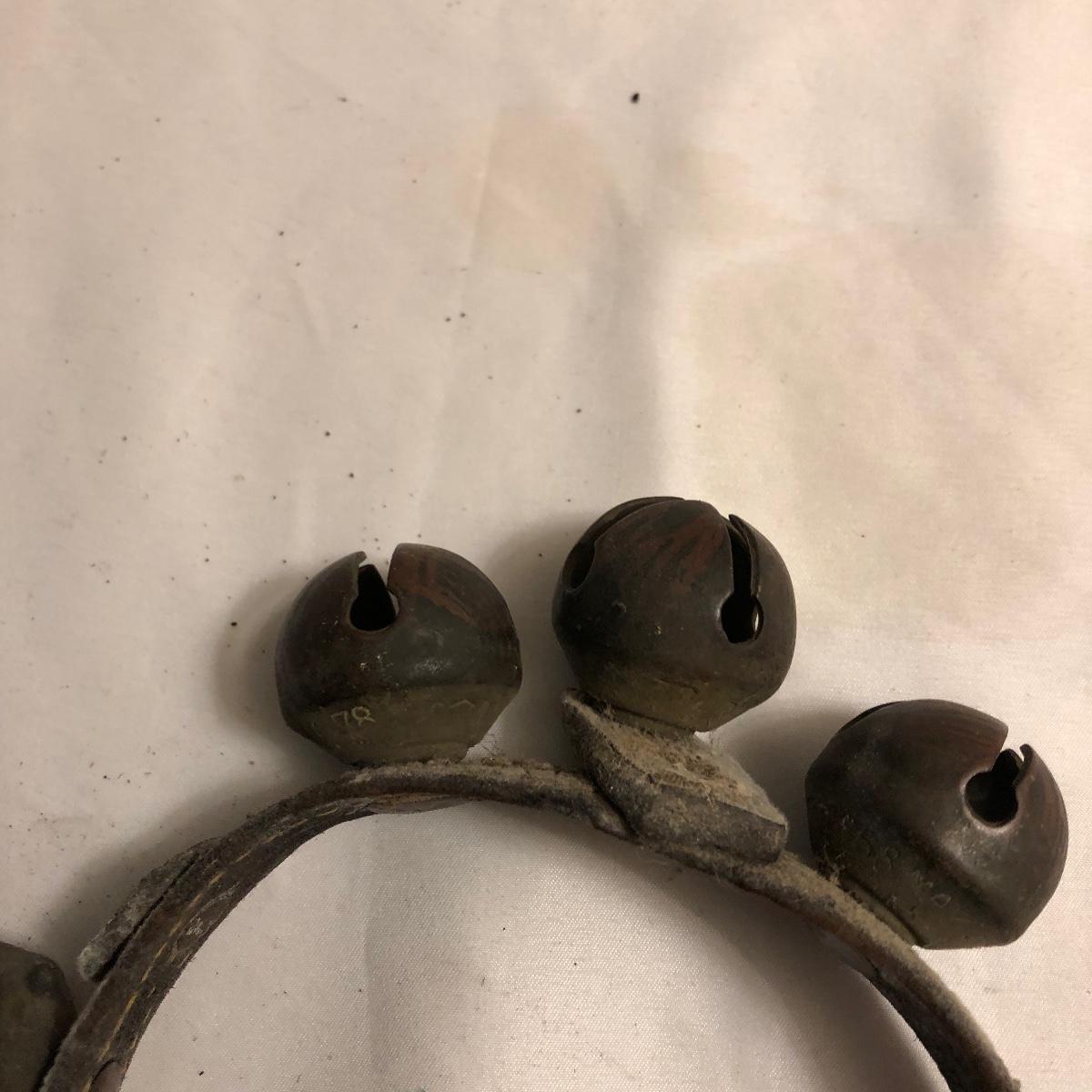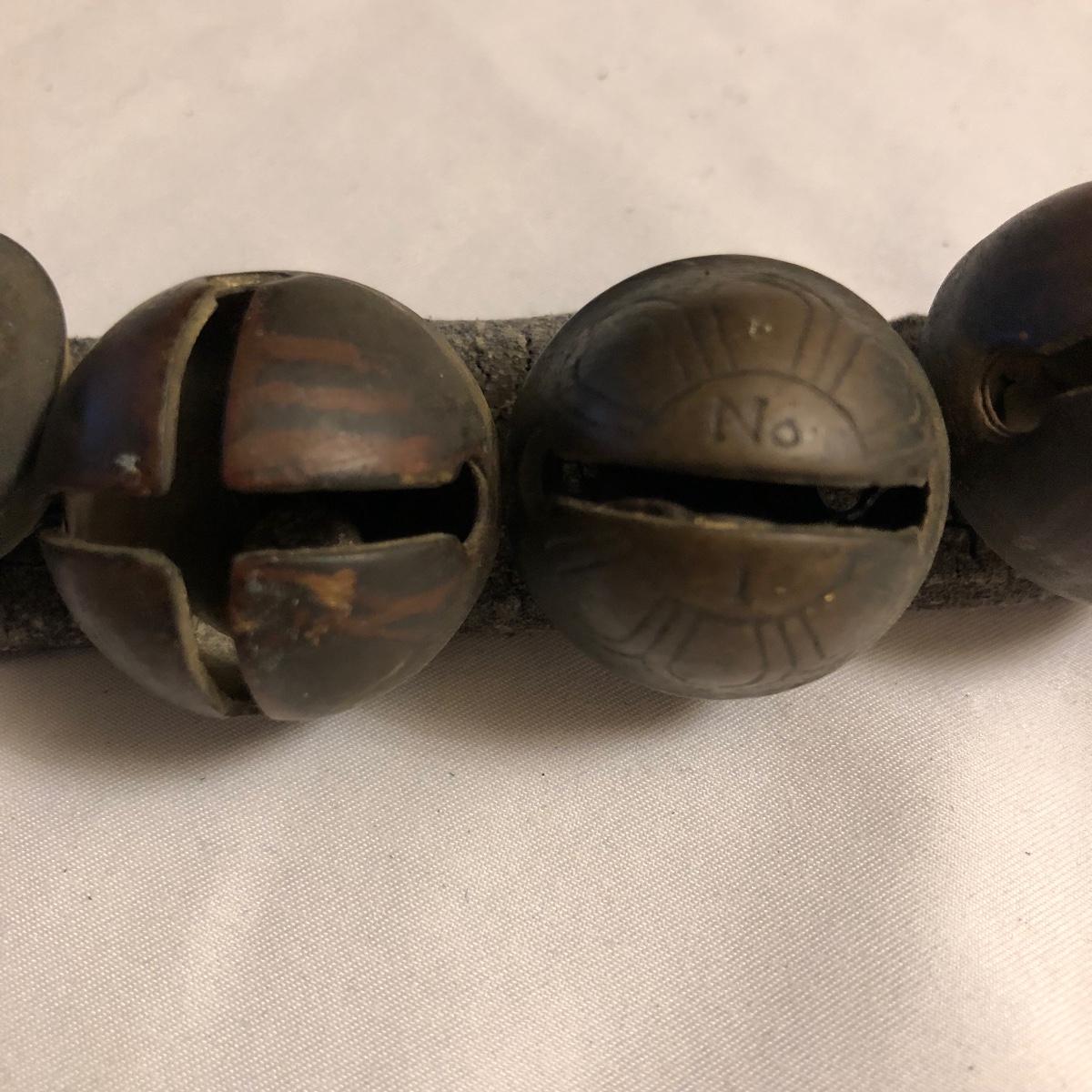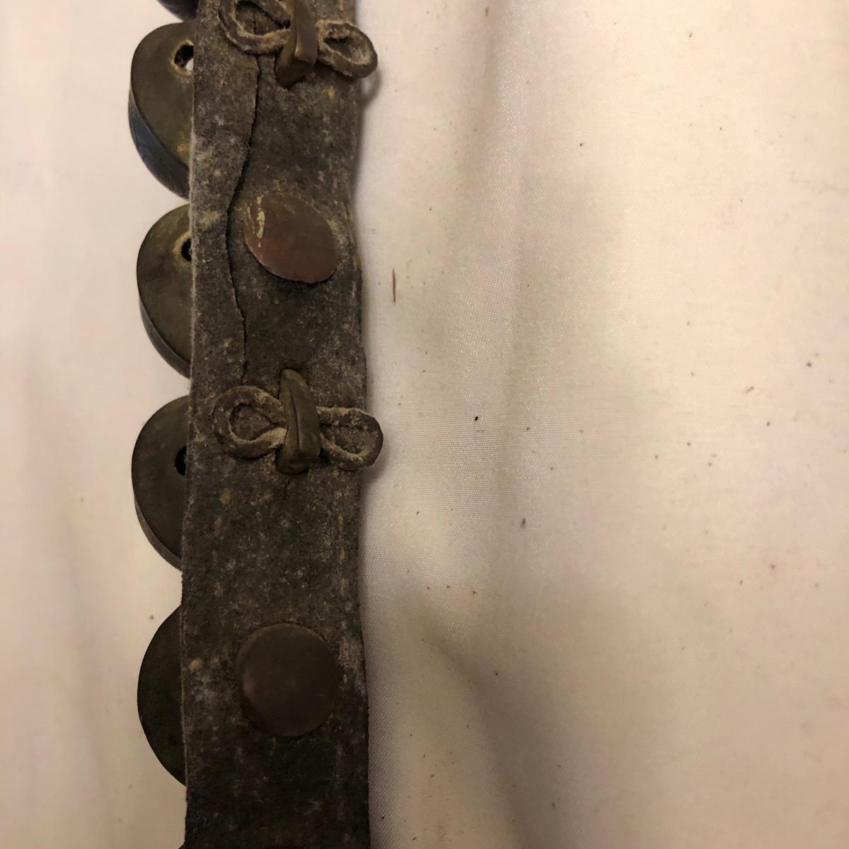 Lot includes nineteen bells on a vintage piece of leather. Leather has cracks, rips and is broken in a few places. Bells measure 1.25”D on a 34” long piece of leather.