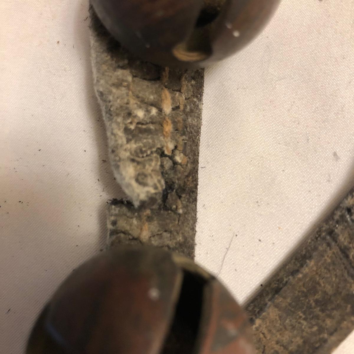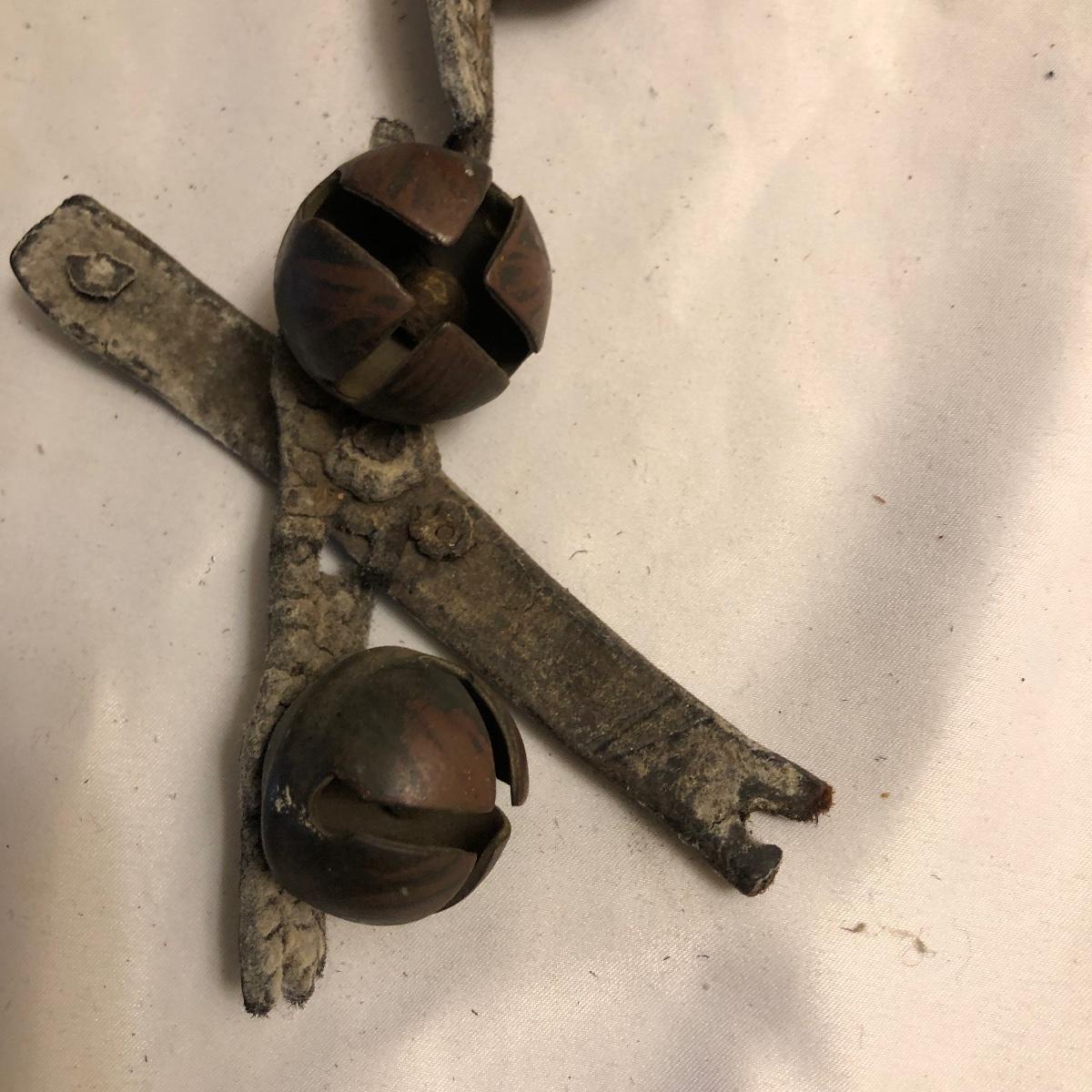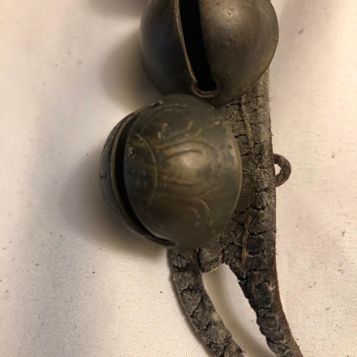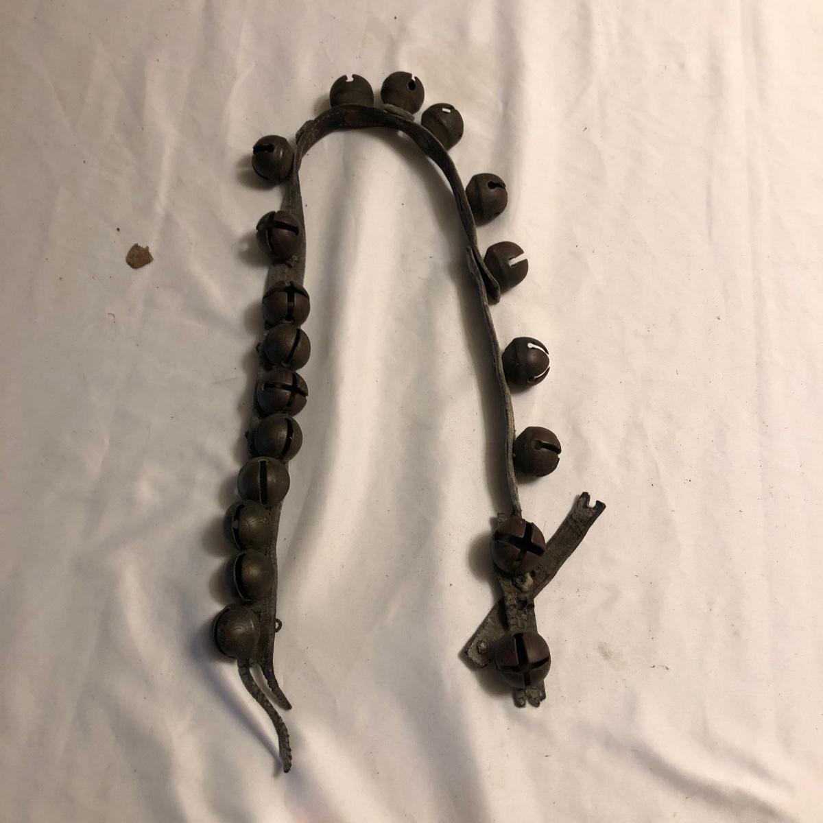 Lot includes nineteen bells on a vintage piece of leather. Leather has cracks, rips and is broken in a few places. Bells measure 1.25”D on a 34” long piece of leather.