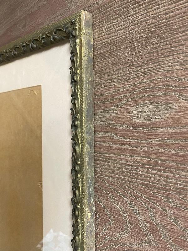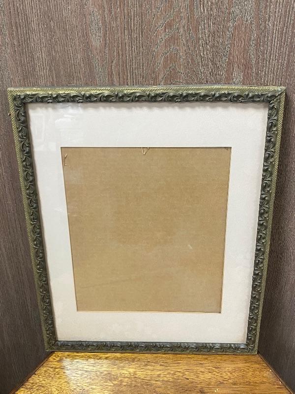 Detailed slim wood picture frame. Carved filigree design. Has the glass. A bit rough around the outside.