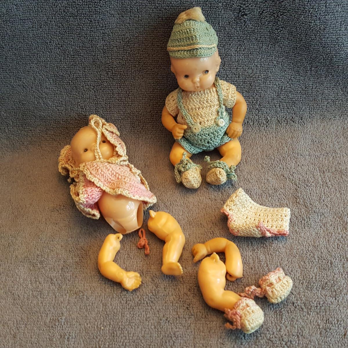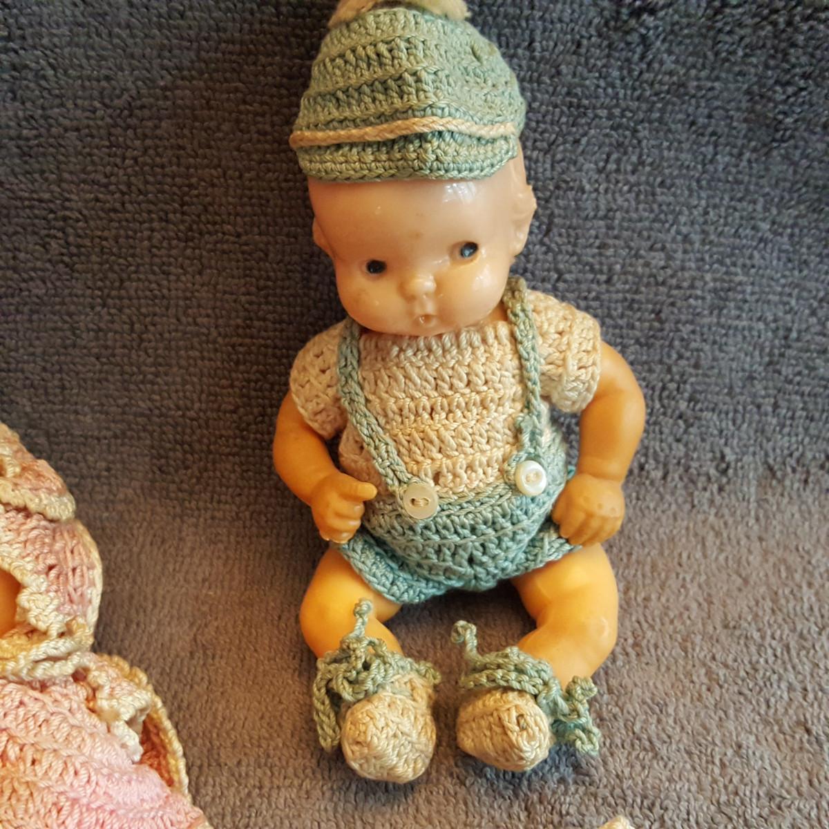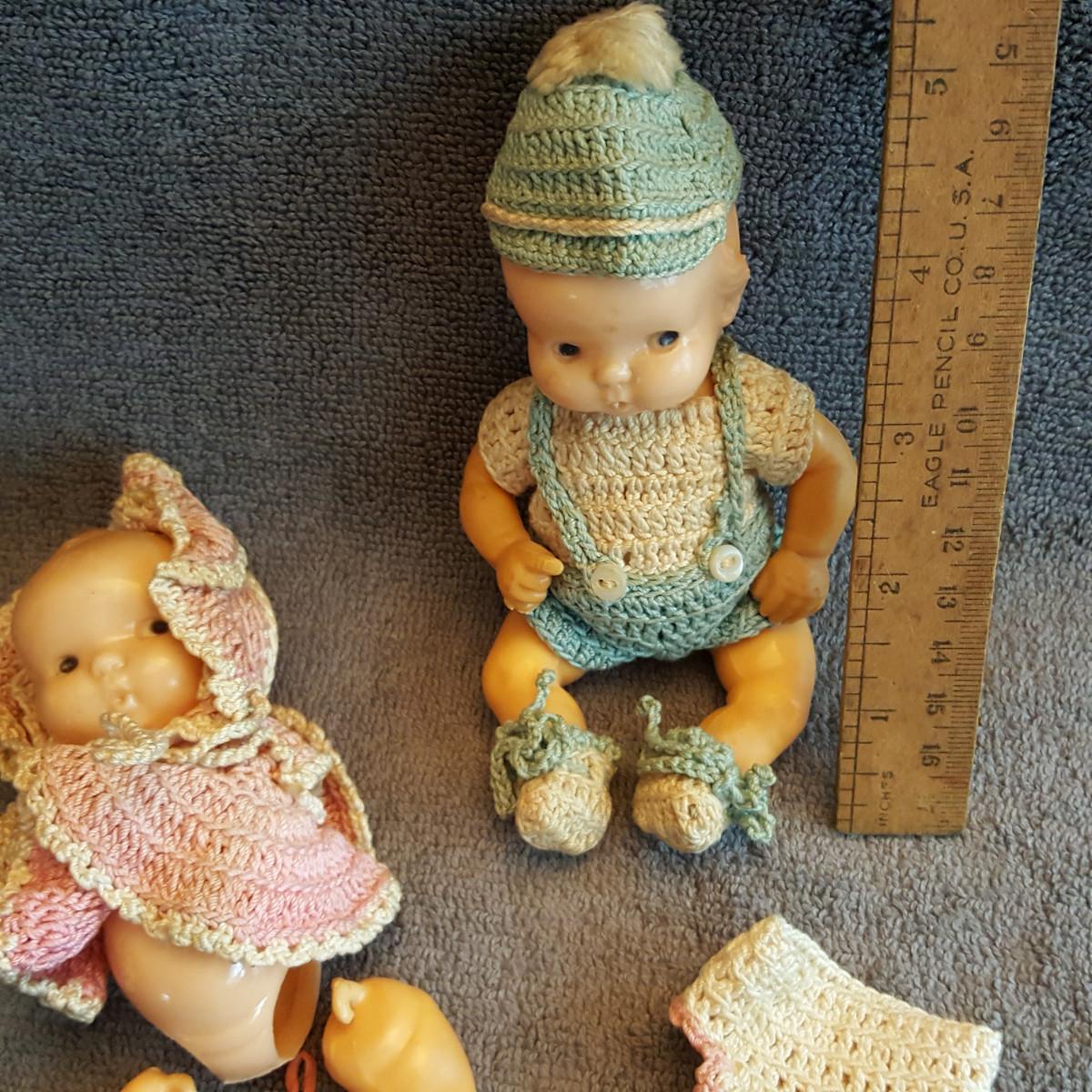 This auction lot is for two Vintage Small Baby Dolls. The boy doll is altogether, but that poor little girl needs some attention - it seems all the parts and clothes are there. Marked "Irwin - made in USA" in a small circle on the top back of the hard plastic body. What a pair - they need to be adopted.