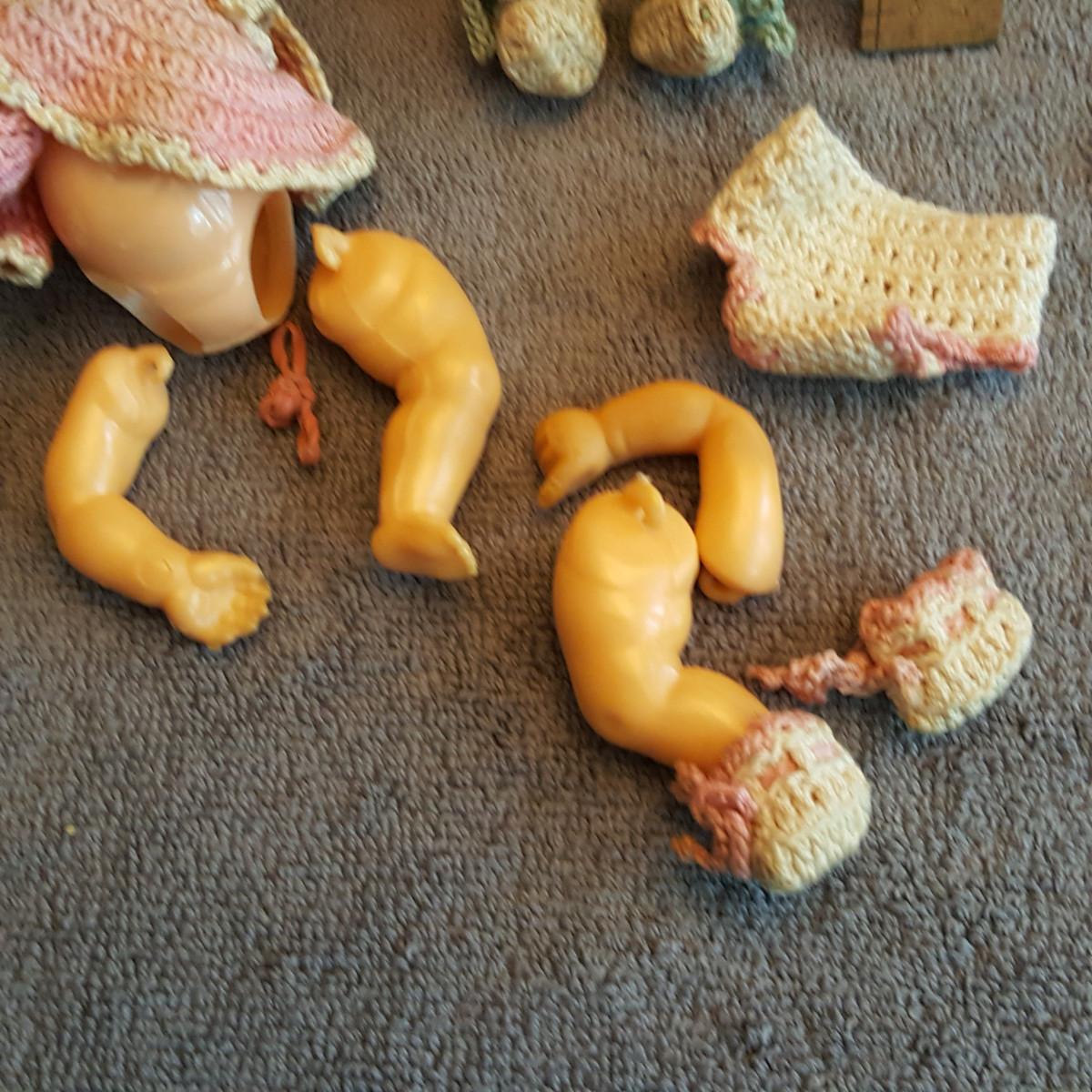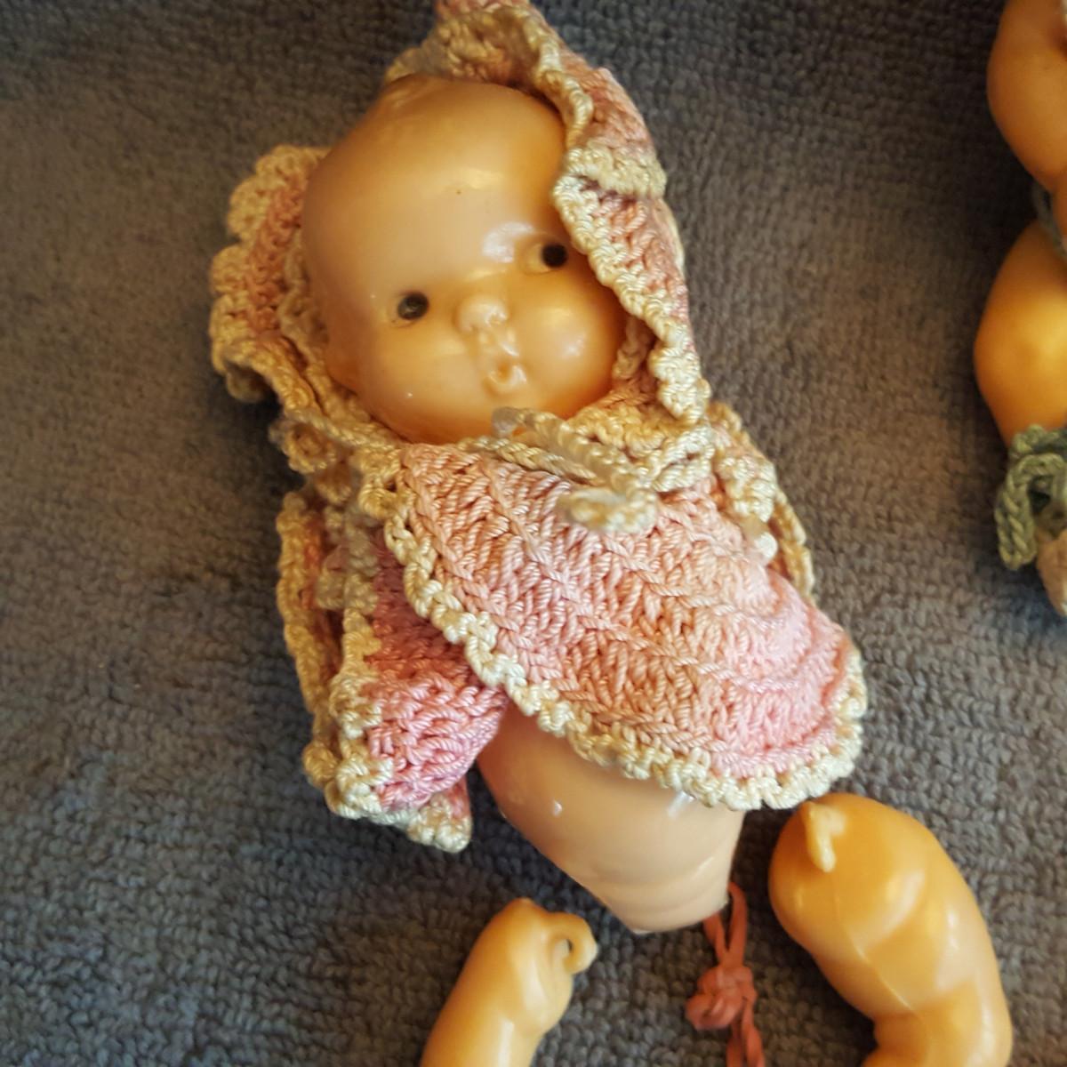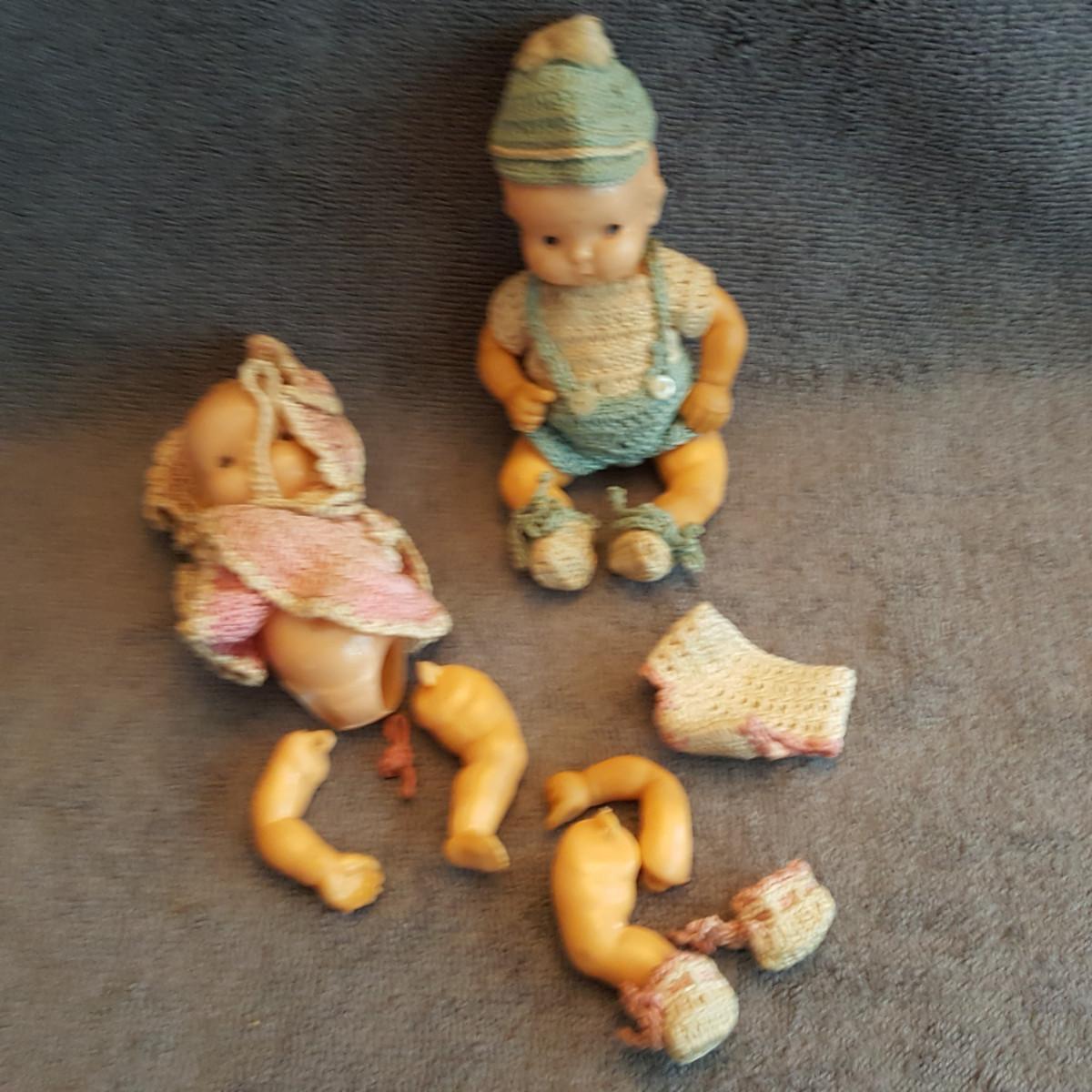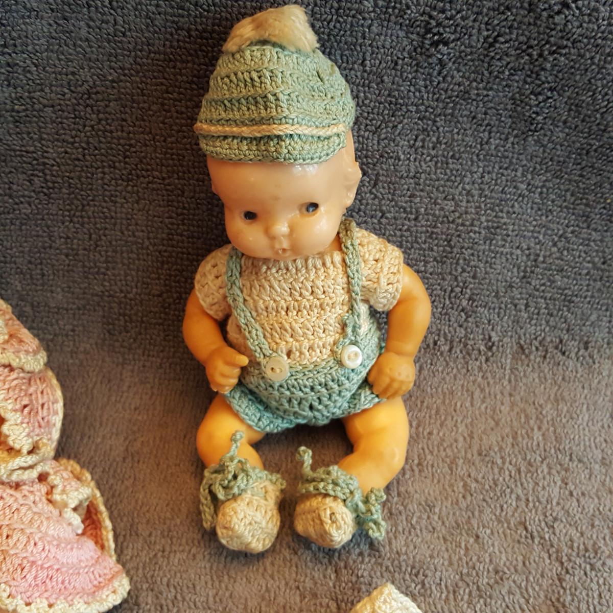 This auction lot is for two Vintage Small Baby Dolls. The boy doll is altogether, but that poor little girl needs some attention - it seems all the parts and clothes are there. Marked "Irwin - made in USA" in a small circle on the top back of the hard plastic body. What a pair - they need to be adopted.