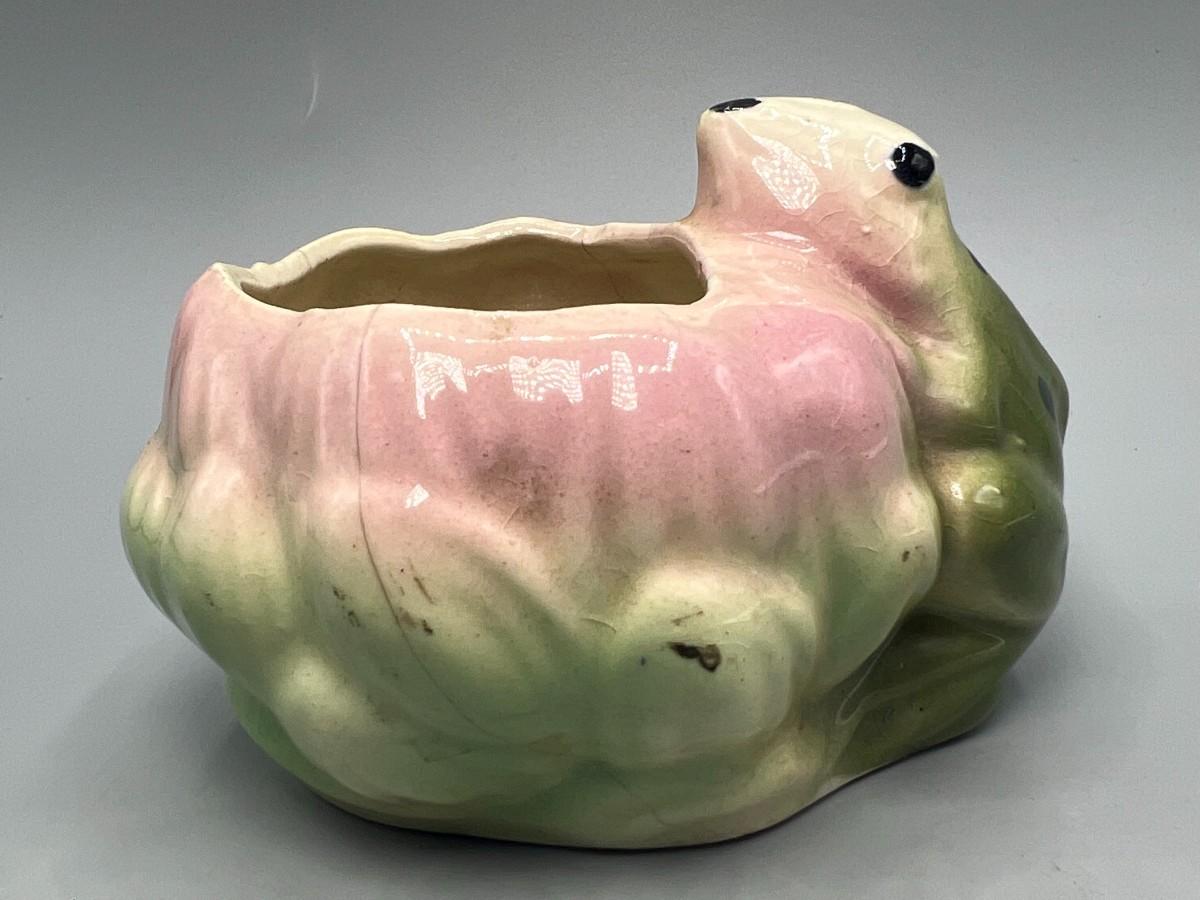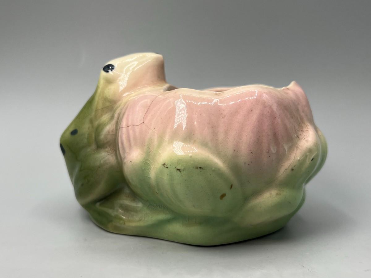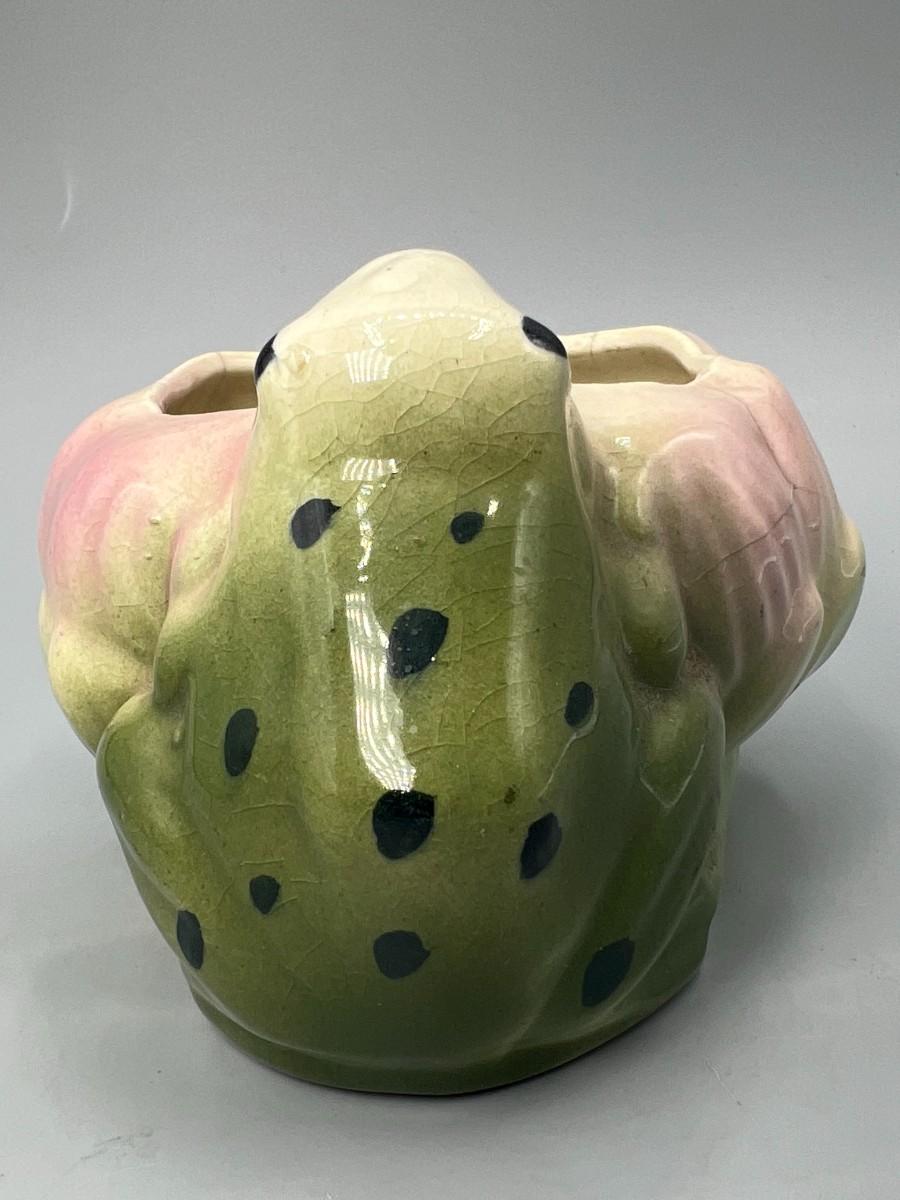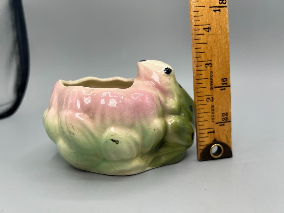 Vintage Small Ceramic Garden Art Spotted Frog Pink Lily Pad Flower Planter, there is some light vintage wear to the planter, but there is no significant damage and is in good collectible condition. Check pictures for more details and for sizing.