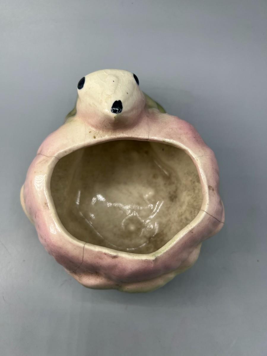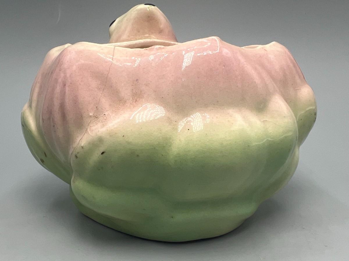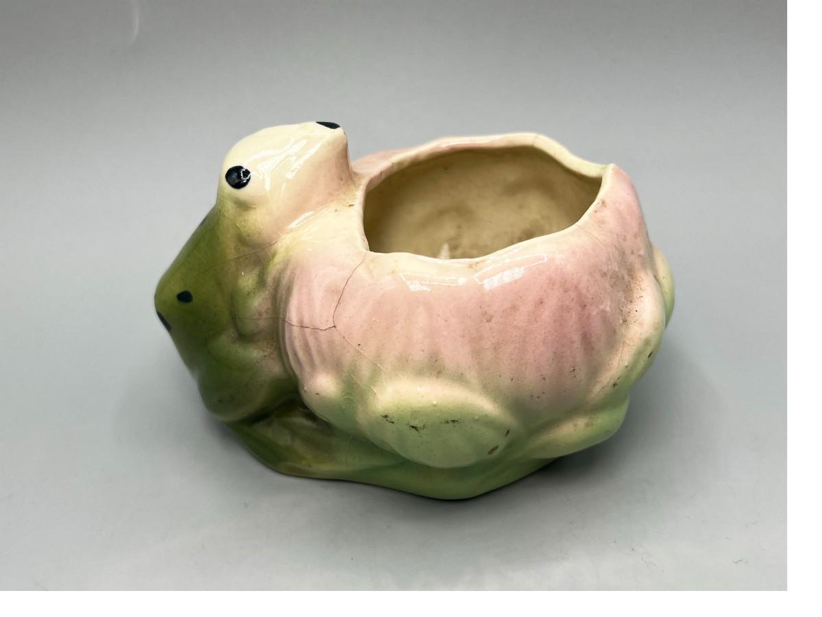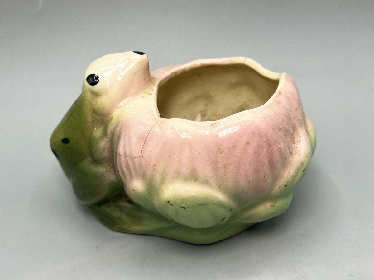 Vintage Small Ceramic Garden Art Spotted Frog Pink Lily Pad Flower Planter, there is some light vintage wear to the planter, but there is no significant damage and is in good collectible condition. Check pictures for more details and for sizing.