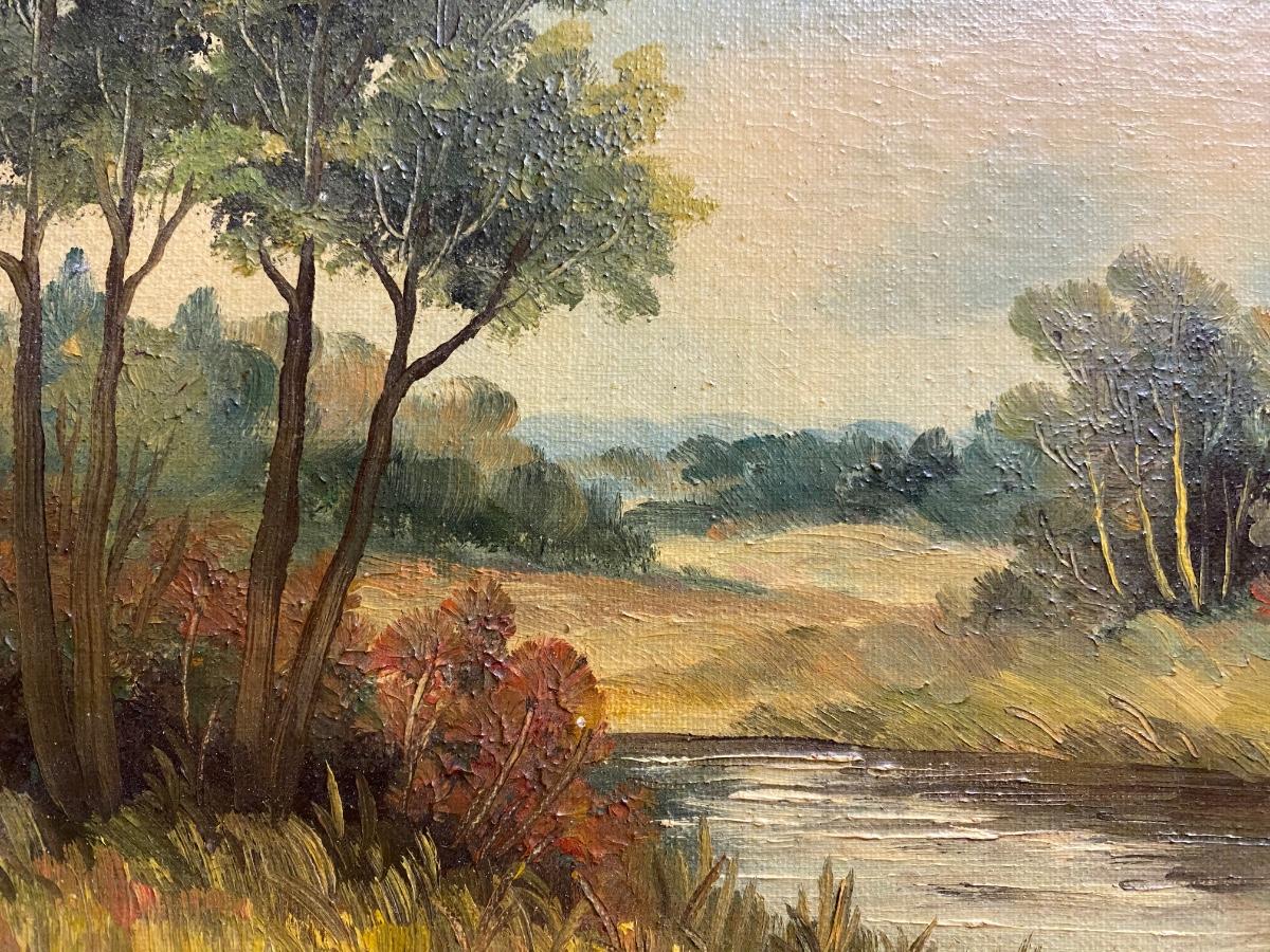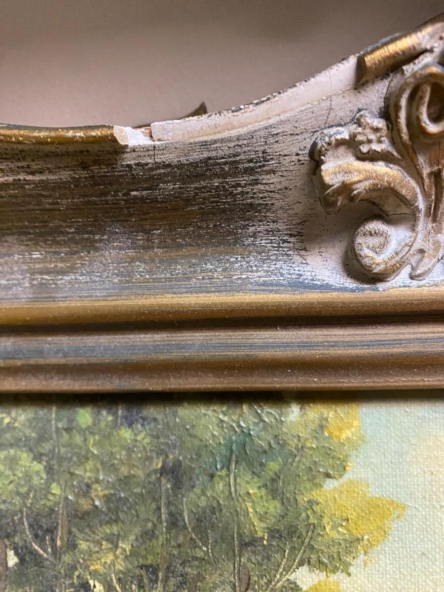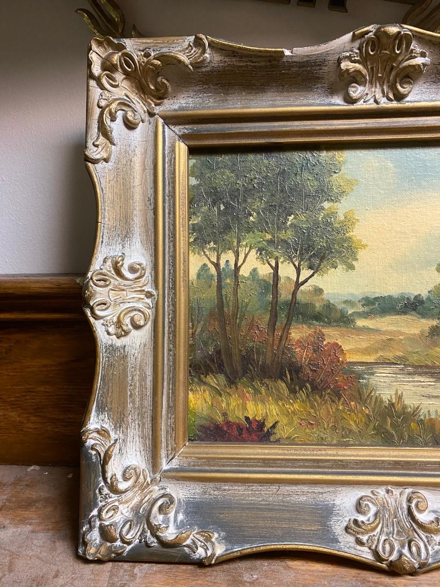 Ornately framed oil on canvas depicting a tranquil countryside scene with a river and a house signed DeCastro . There is small chip in upper frame, Approximately 12”x14”
