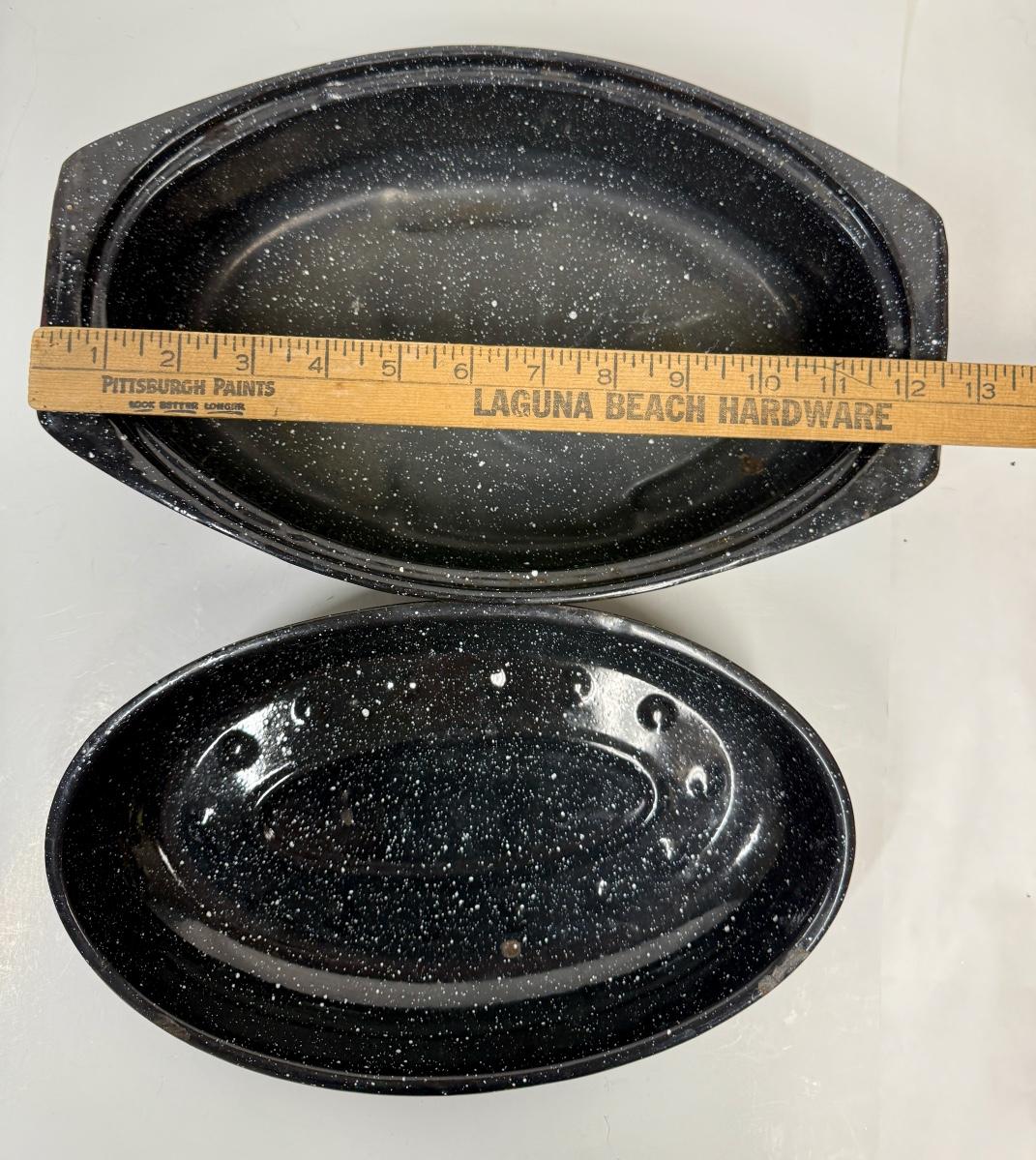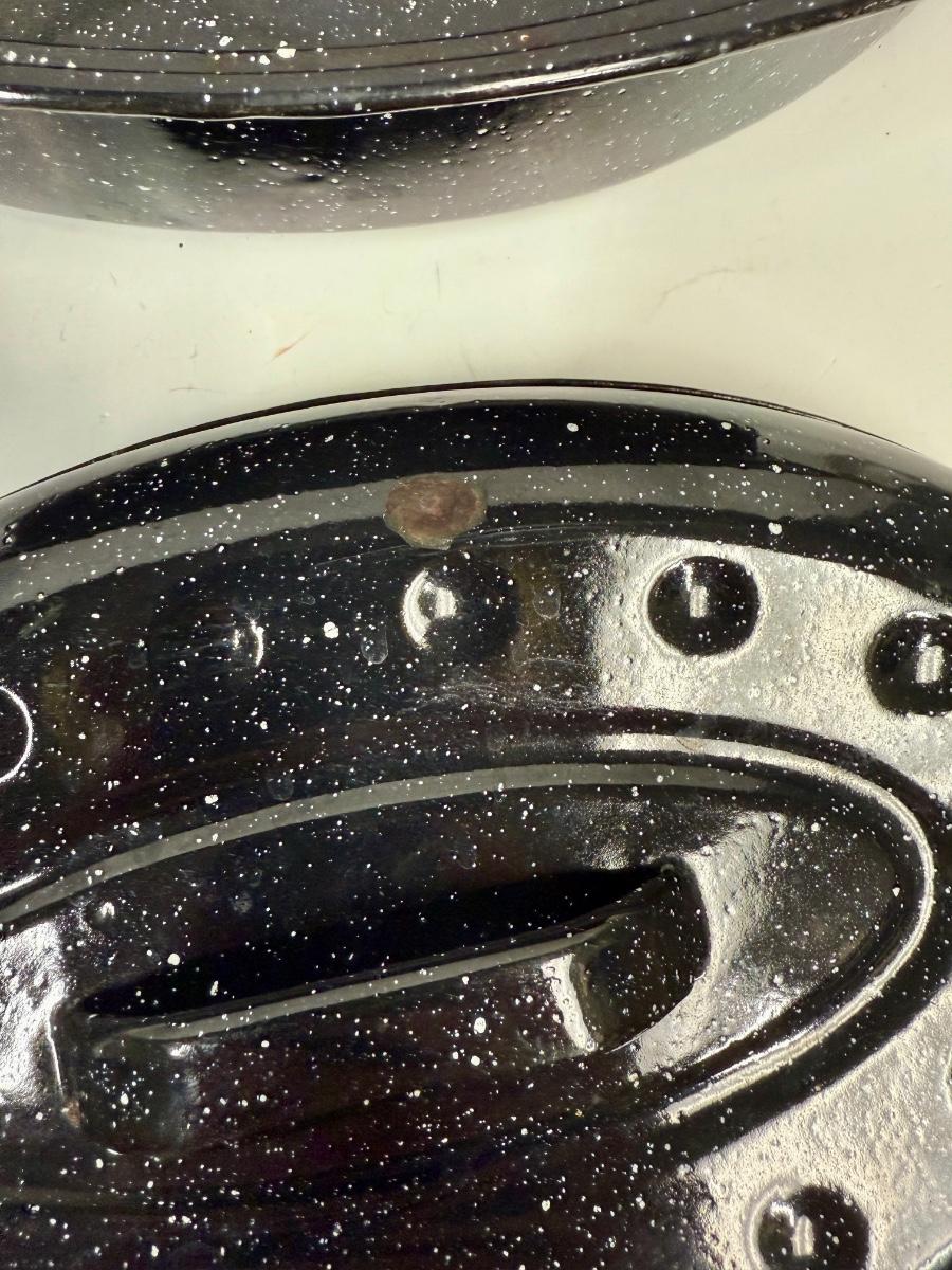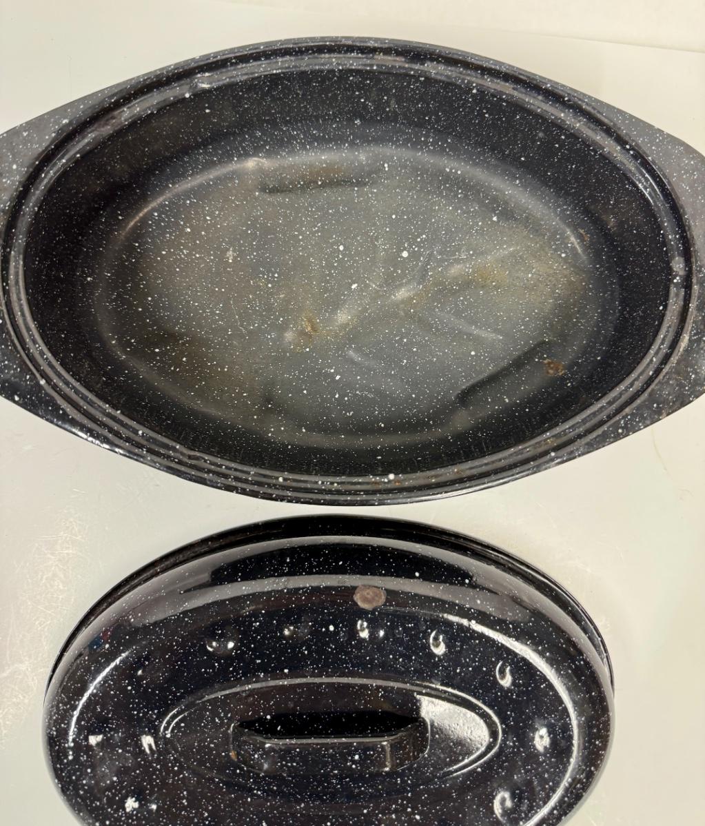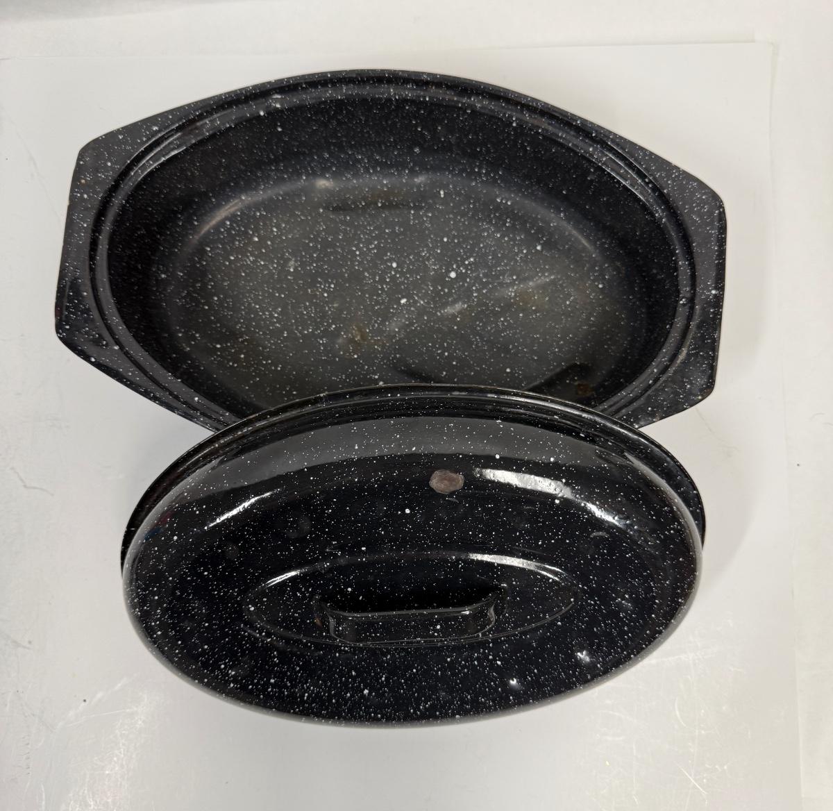 Vintage Small Granite ware Covered Oval Roaster USA speckled white on black