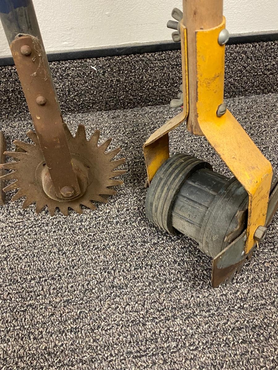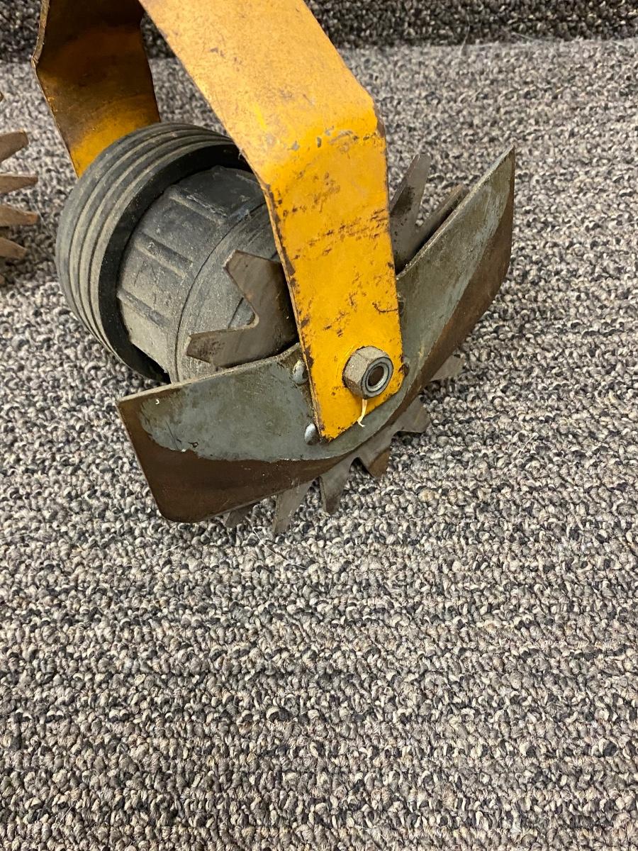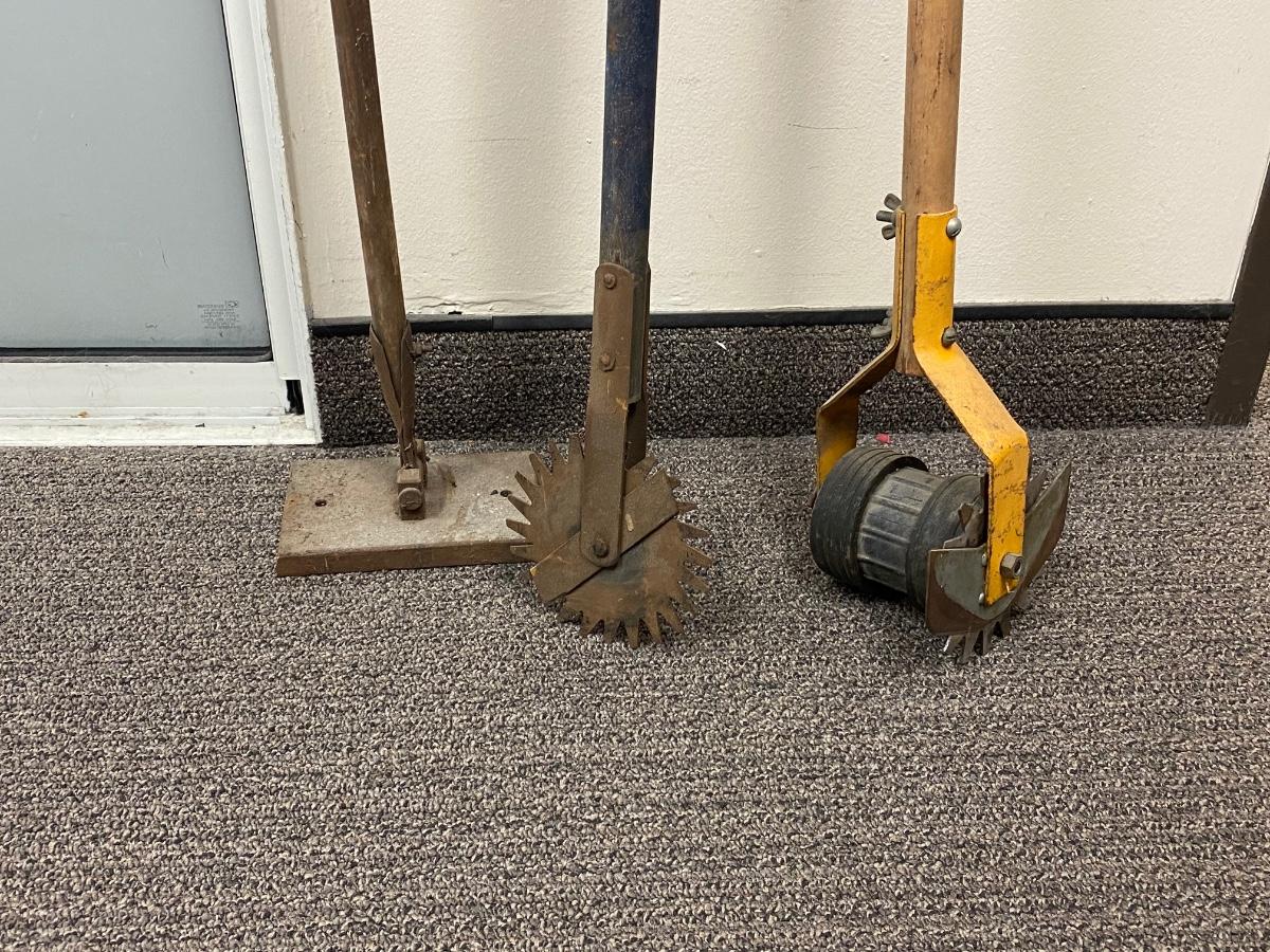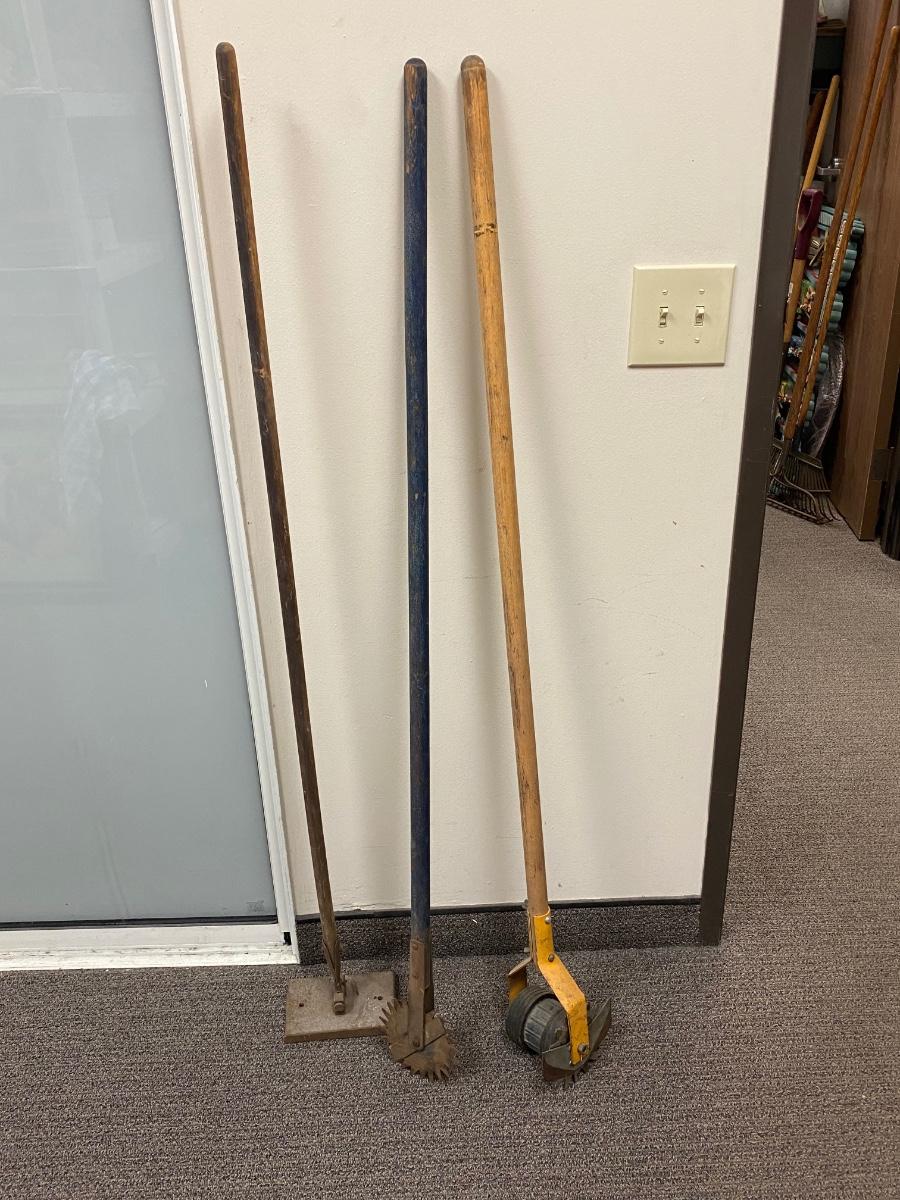Set of 3 vintage handheld garden tools. A small ground tamper and two edger tools. The older looking edger does not turn, in need of cleaning and oil. The other does turn.