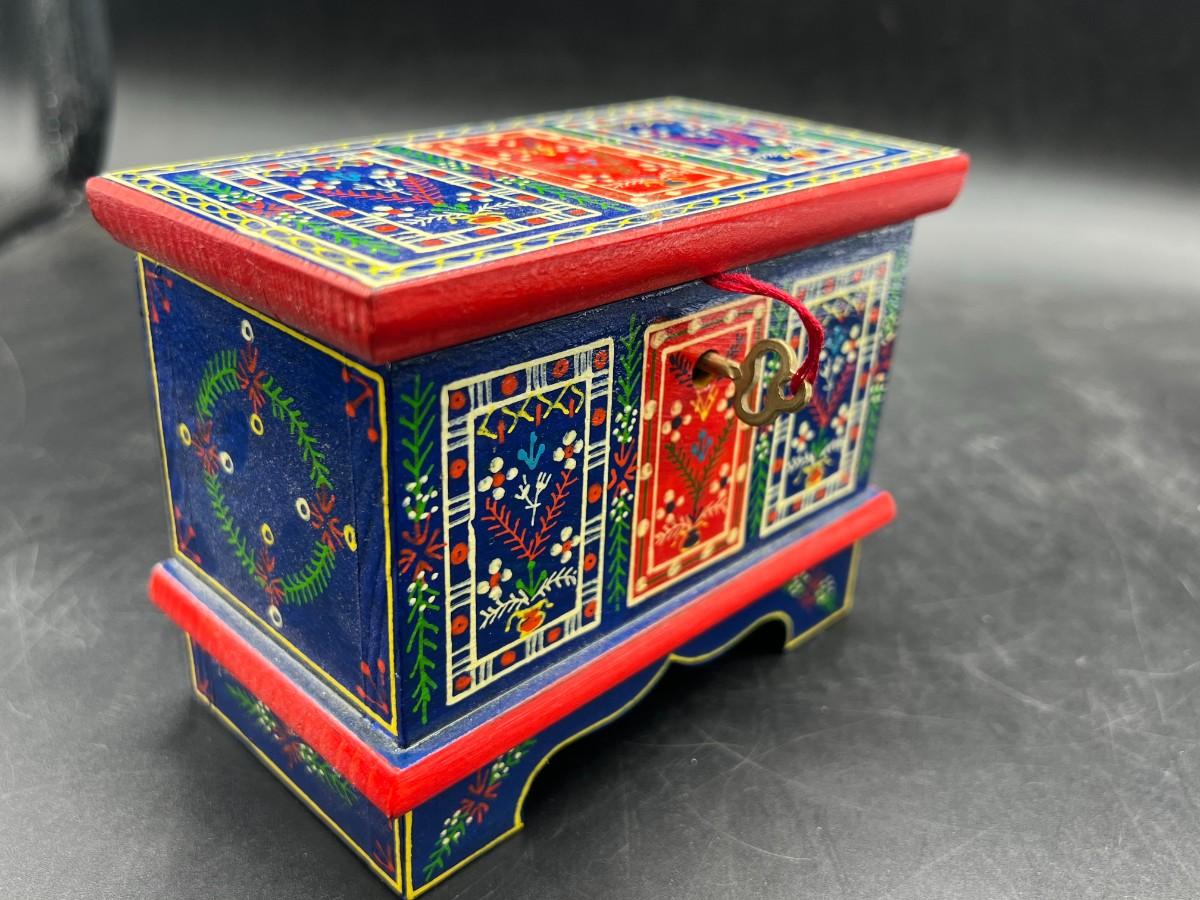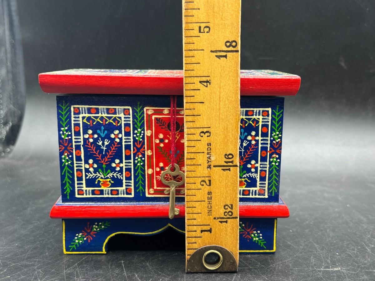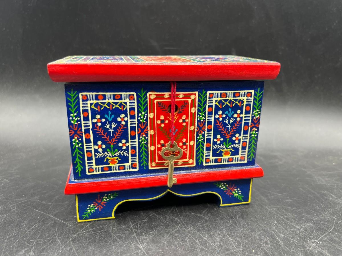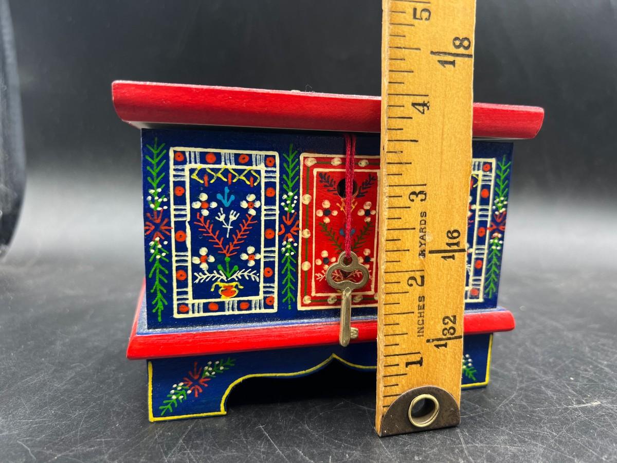 Vintage Small Hand Painted Krakow Locking Chest Polish Folk Art Jewelry Trinket Treasure Box, there is no significant damage to the wooden chest and is in good vintage condition. The key is tied to the lid of the box, check pictures for more details and for sizing.