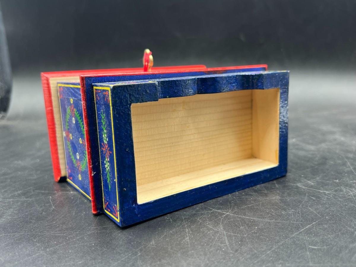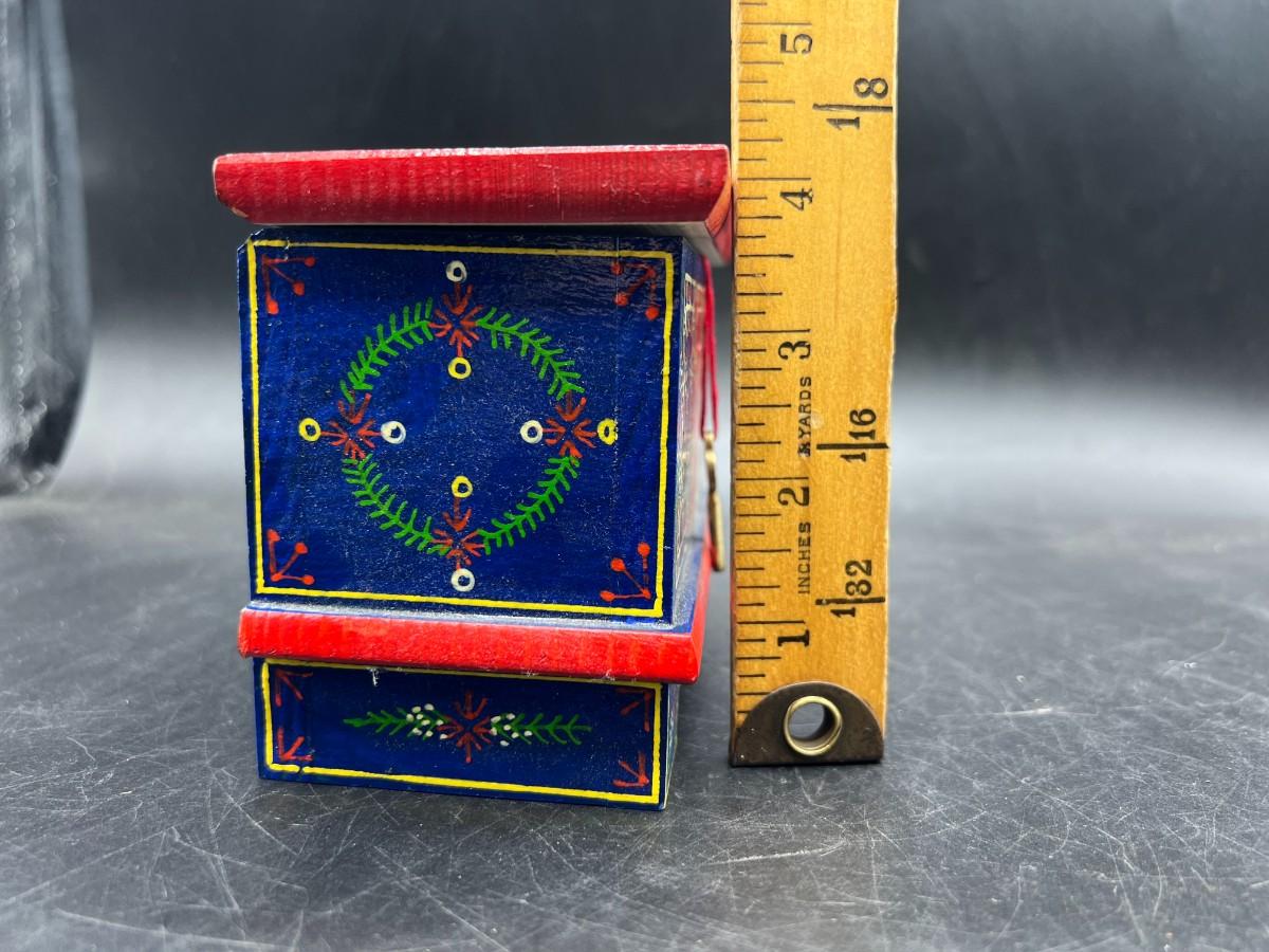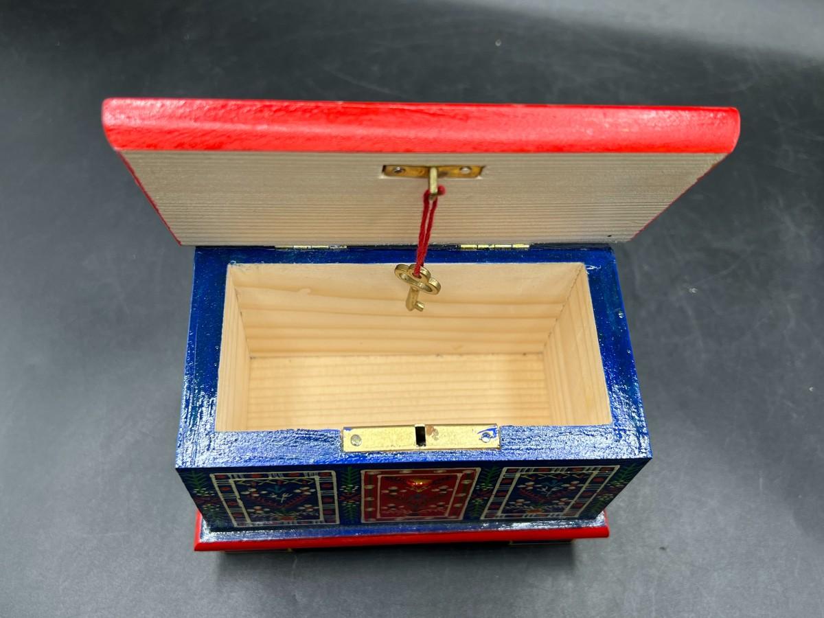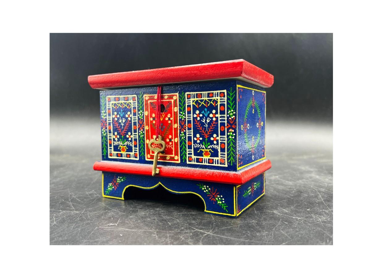 Vintage Small Hand Painted Krakow Locking Chest Polish Folk Art Jewelry Trinket Treasure Box, there is no significant damage to the wooden chest and is in good vintage condition. The key is tied to the lid of the box, check pictures for more details and for sizing.