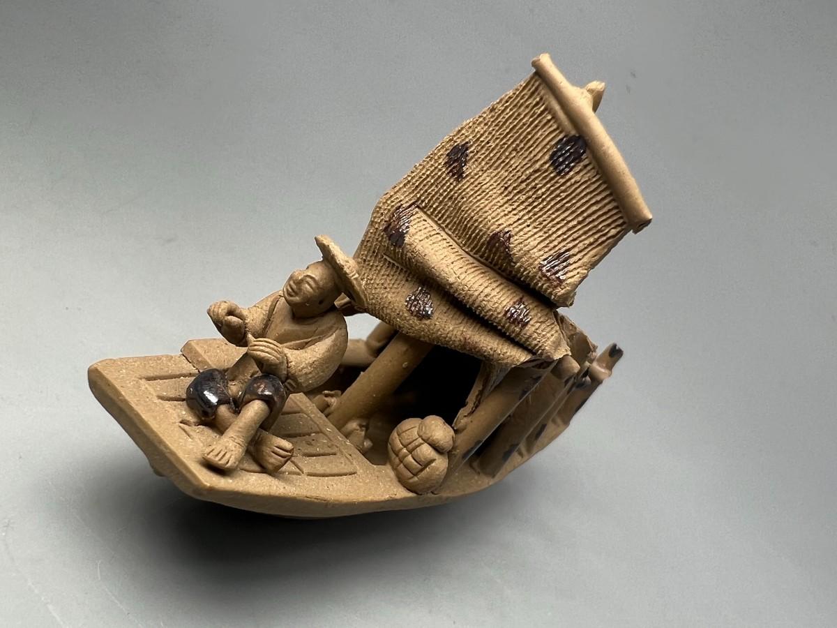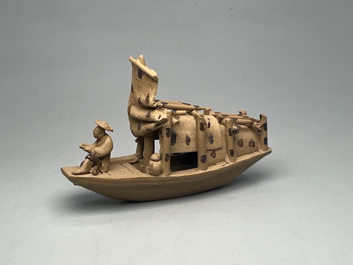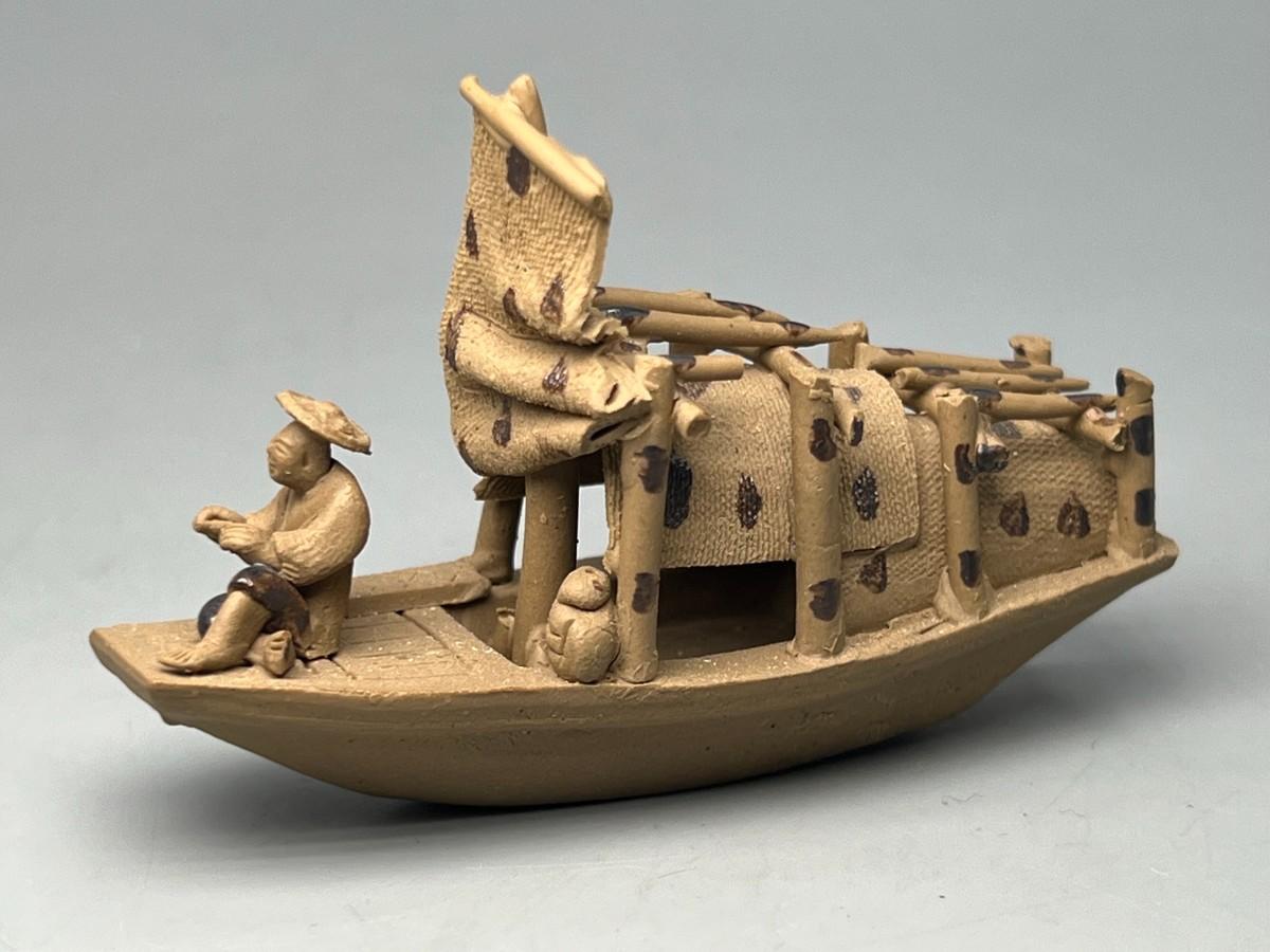 Vintage Small Handcrafted Clay Pottery Oriental Fishing Boat Miniature Figurine