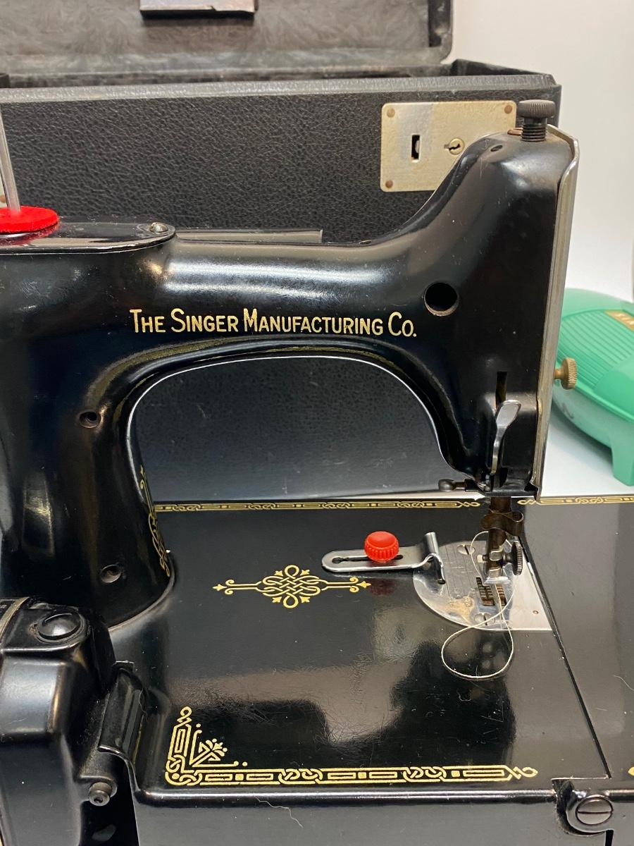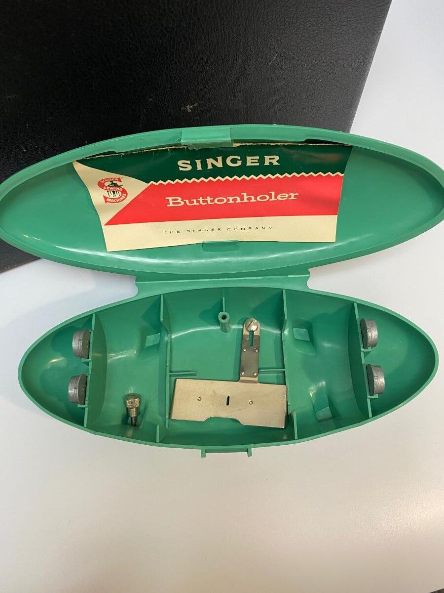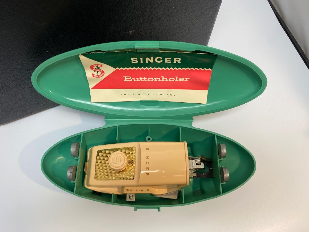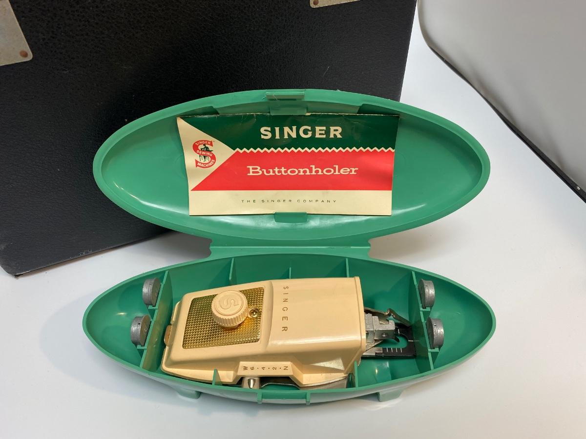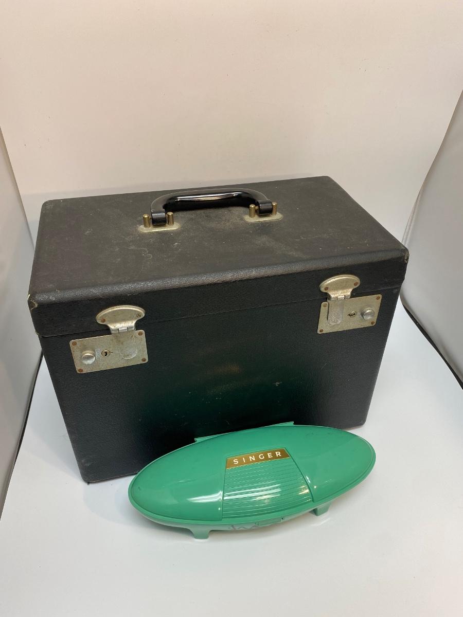 Vintage small electric Featherweight Singer Sewing Machine with carry case and buttonholer. Works! In very good condition. Front folds up to fit in box. Has spot on inside of case lid for foot pedal. Pedal has nice long cord. Has manual and oil, oil feels empty or close to empty. Buttonholer kit looks complete. See photos for condition. Runs smoothly, light comes on. Serial number on bottom is AL169276, putting the manufacture date of machine as December 1952.