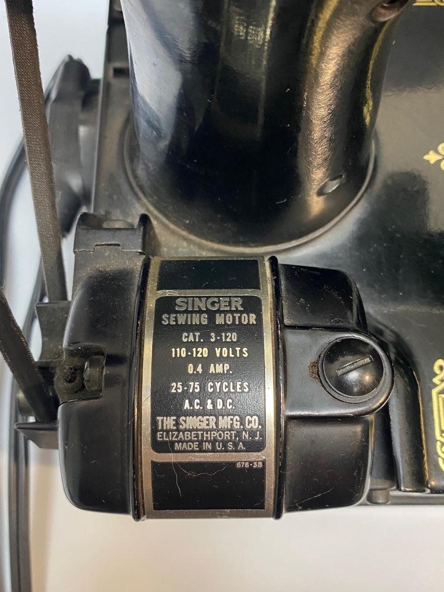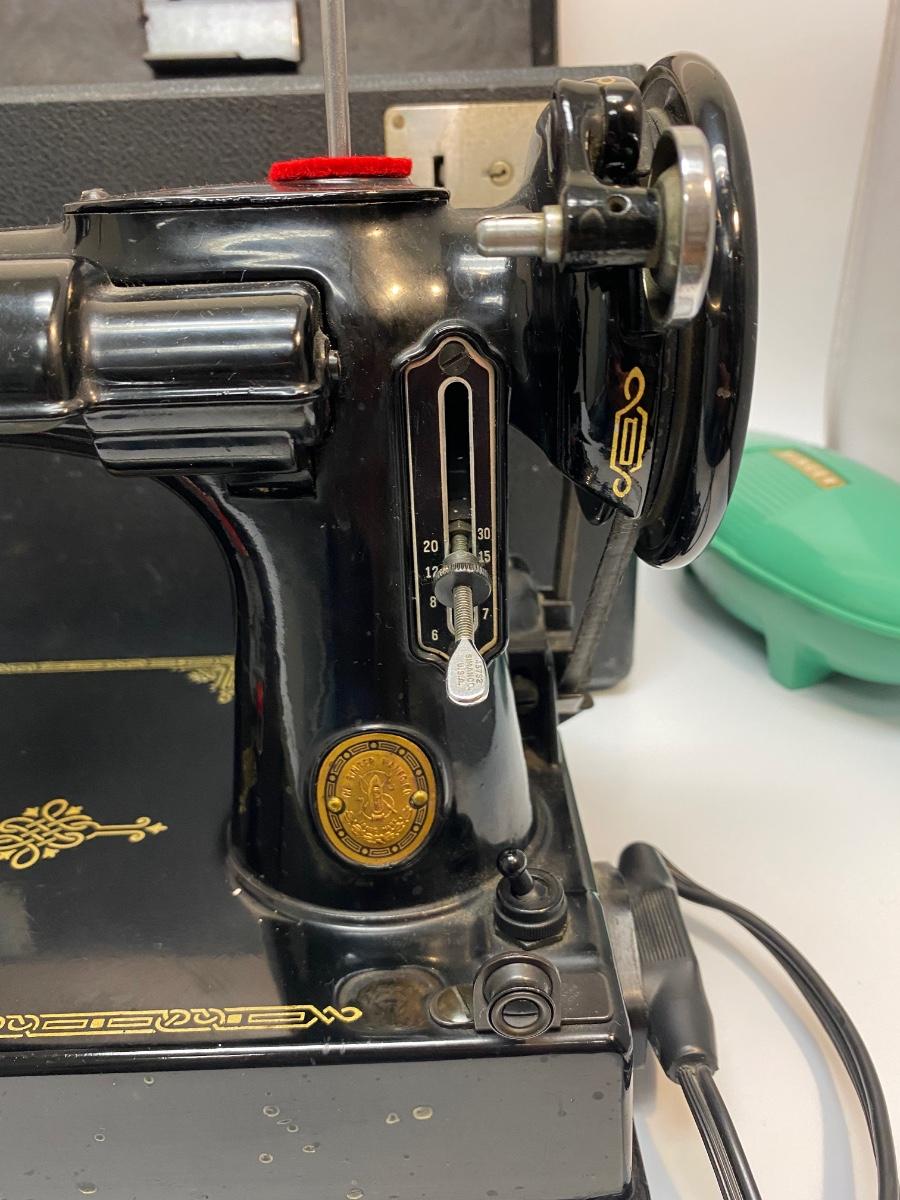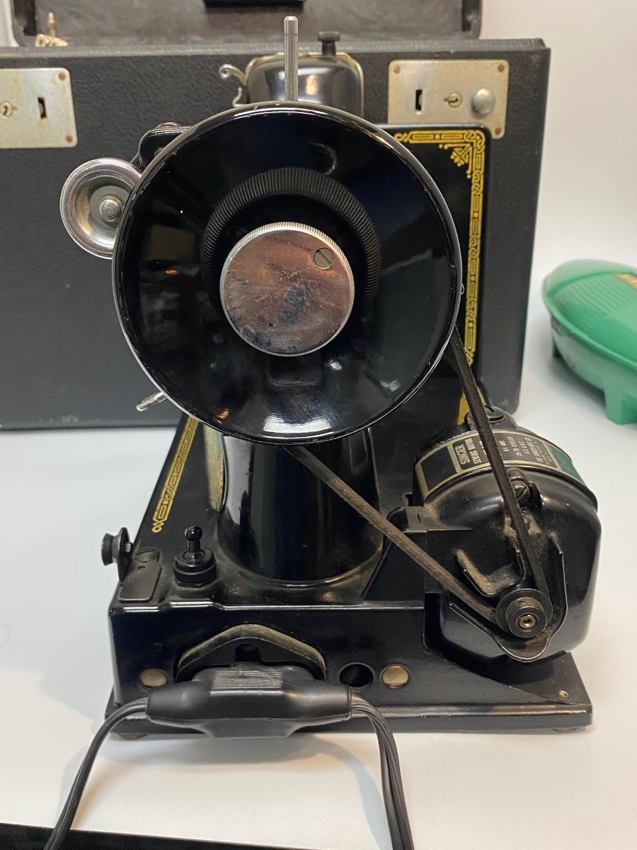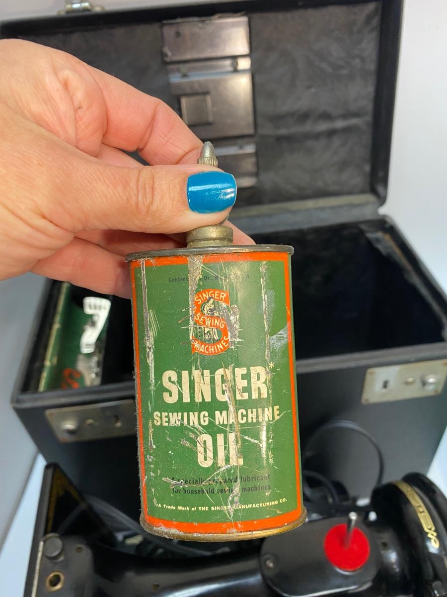 Vintage small electric Featherweight Singer Sewing Machine with carry case and buttonholer. Works! In very good condition. Front folds up to fit in box. Has spot on inside of case lid for foot pedal. Pedal has nice long cord. Has manual and oil, oil feels empty or close to empty. Buttonholer kit looks complete. See photos for condition. Runs smoothly, light comes on. Serial number on bottom is AL169276, putting the manufacture date of machine as December 1952.