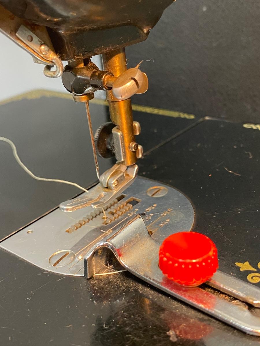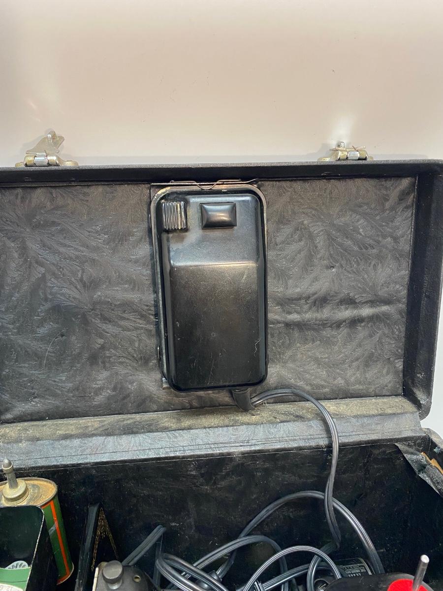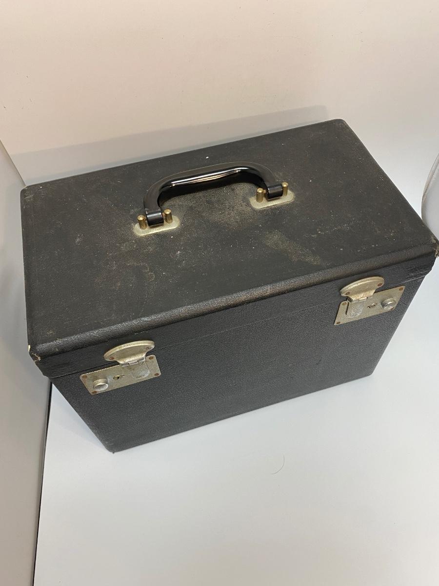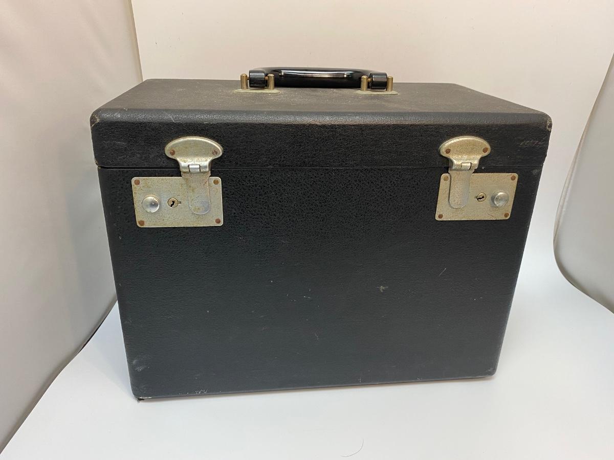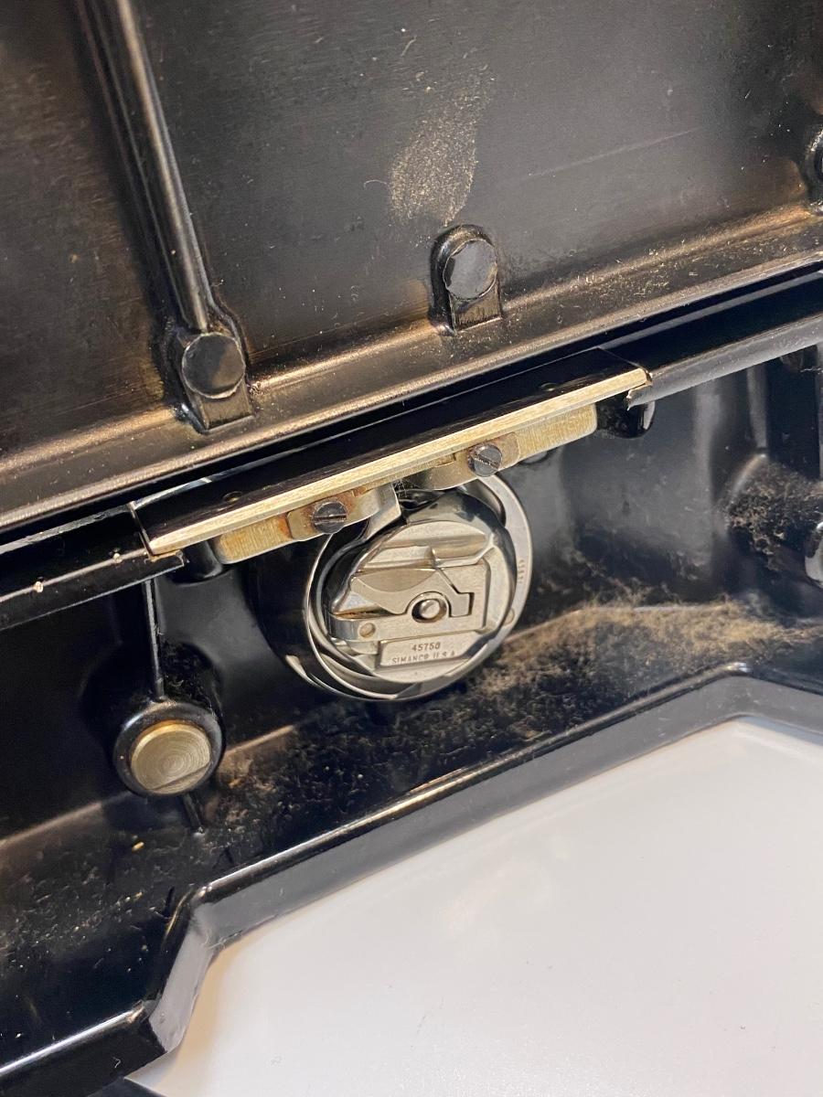 Vintage small electric Featherweight Singer Sewing Machine with carry case and buttonholer. Works! In very good condition. Front folds up to fit in box. Has spot on inside of case lid for foot pedal. Pedal has nice long cord. Has manual and oil, oil feels empty or close to empty. Buttonholer kit looks complete. See photos for condition. Runs smoothly, light comes on. Serial number on bottom is AL169276, putting the manufacture date of machine as December 1952.