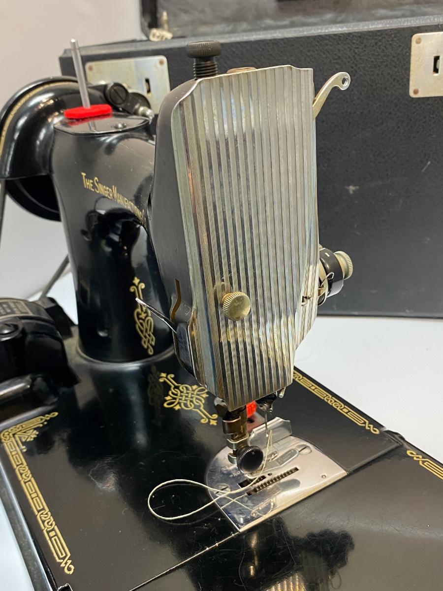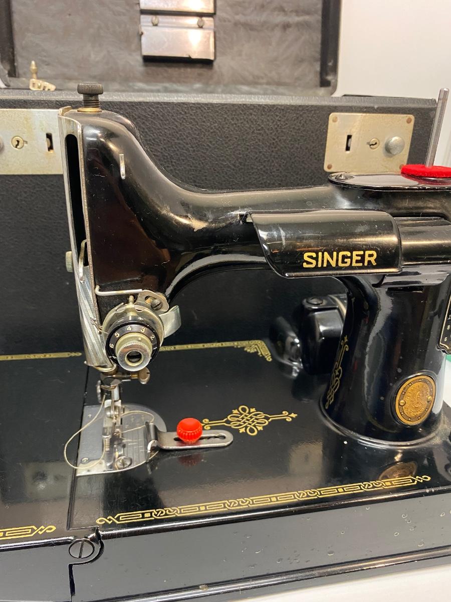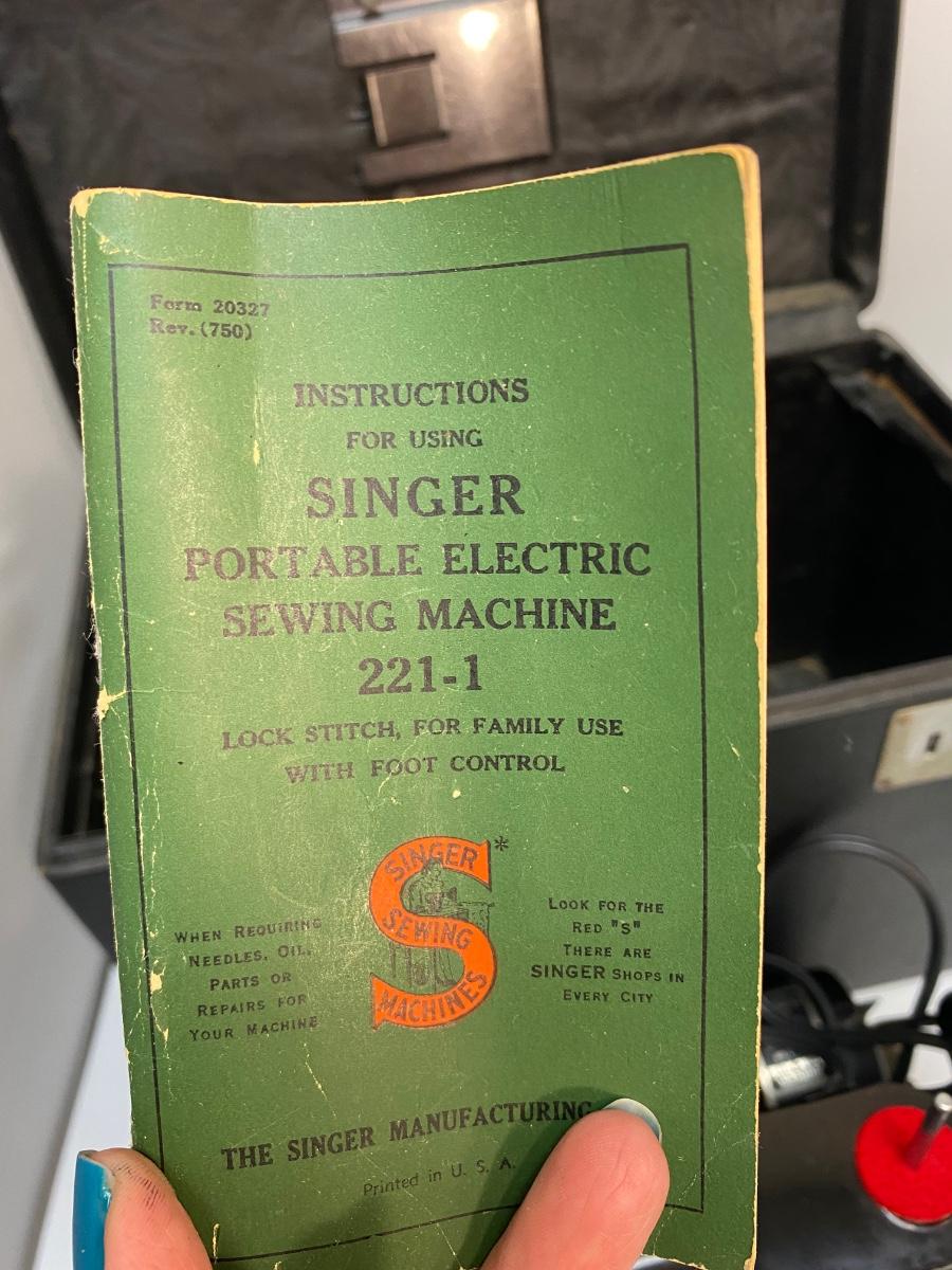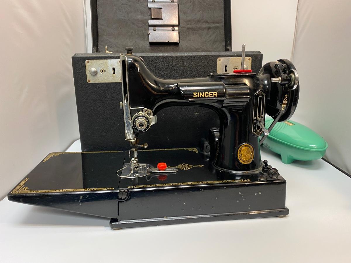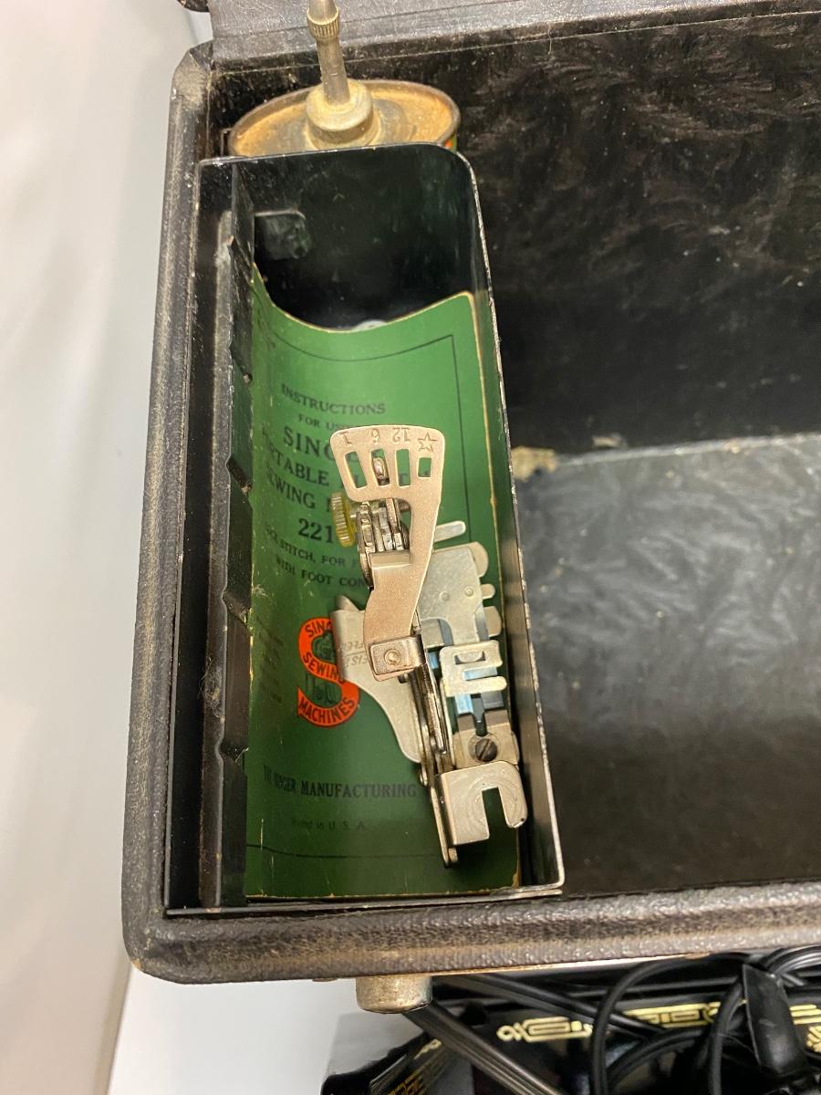 Vintage Small Table Sitting Portable Featherweight Singer Sewing Machine 221-1 with Carry Case and Buttonholer