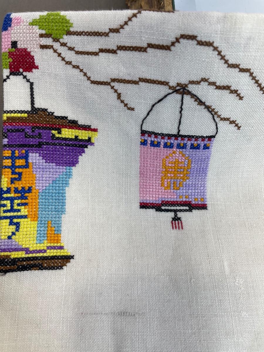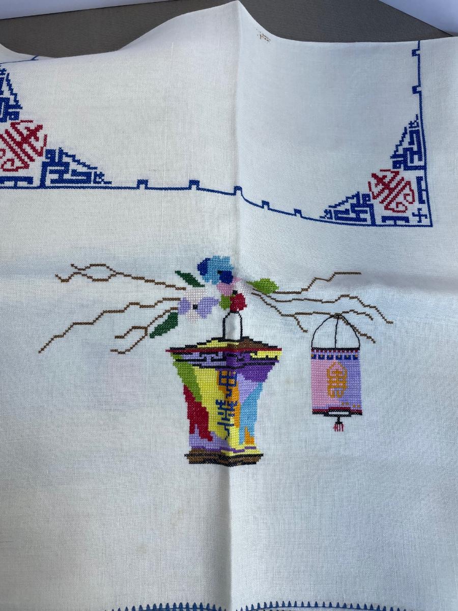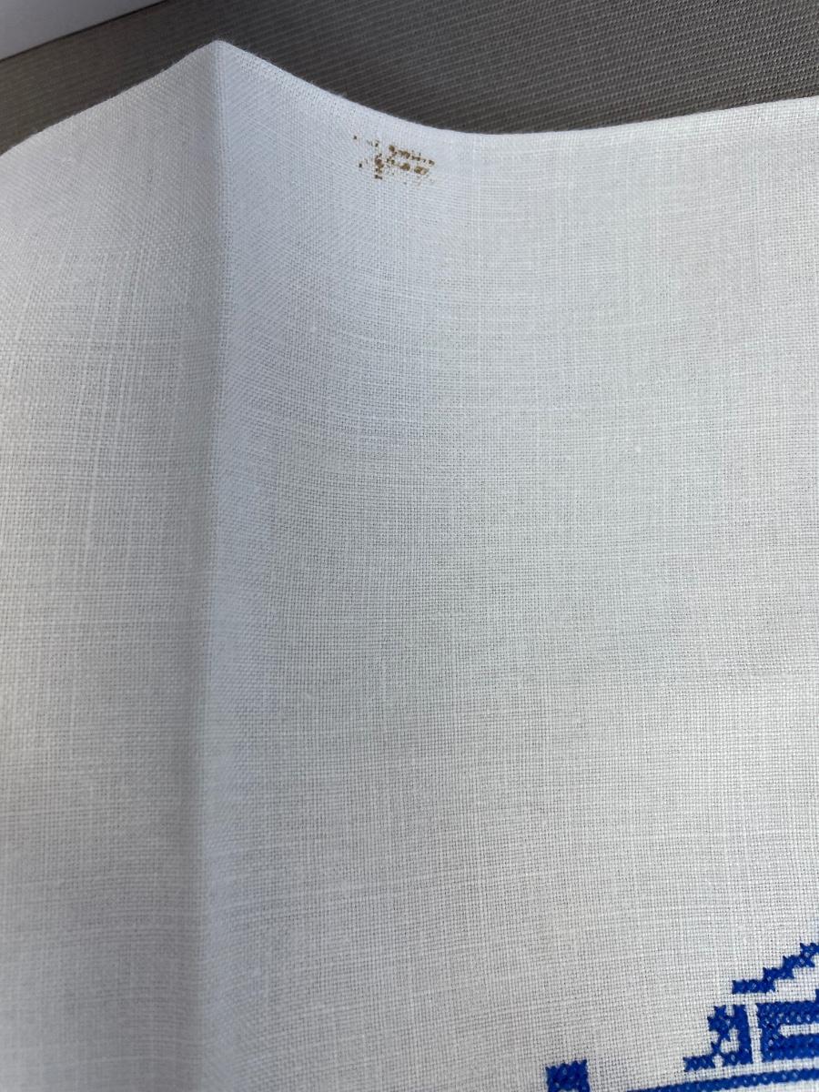 Tablecloth is 38 by 33 inches. Has a spot as shown.