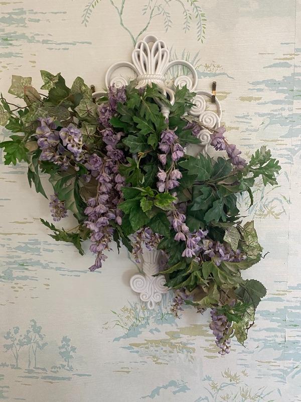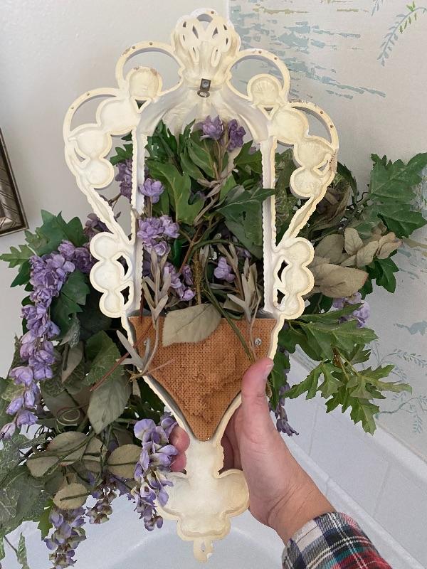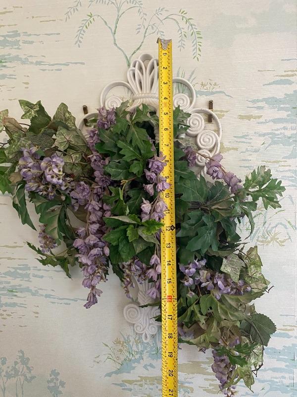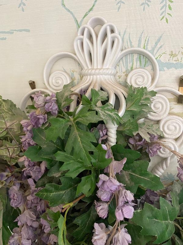 Vintage small white wall cage with purple artificial flowers. Flowers can be removed. Maybe dusty from display. About 18" size.