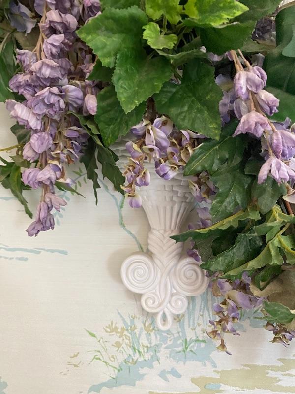 Vintage Small White Plastic Wall Cage with Purple Artificial Flowers