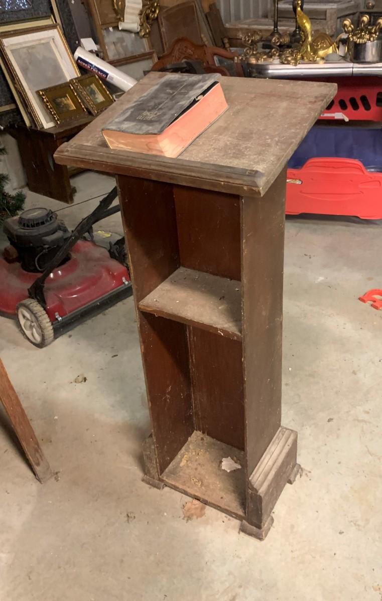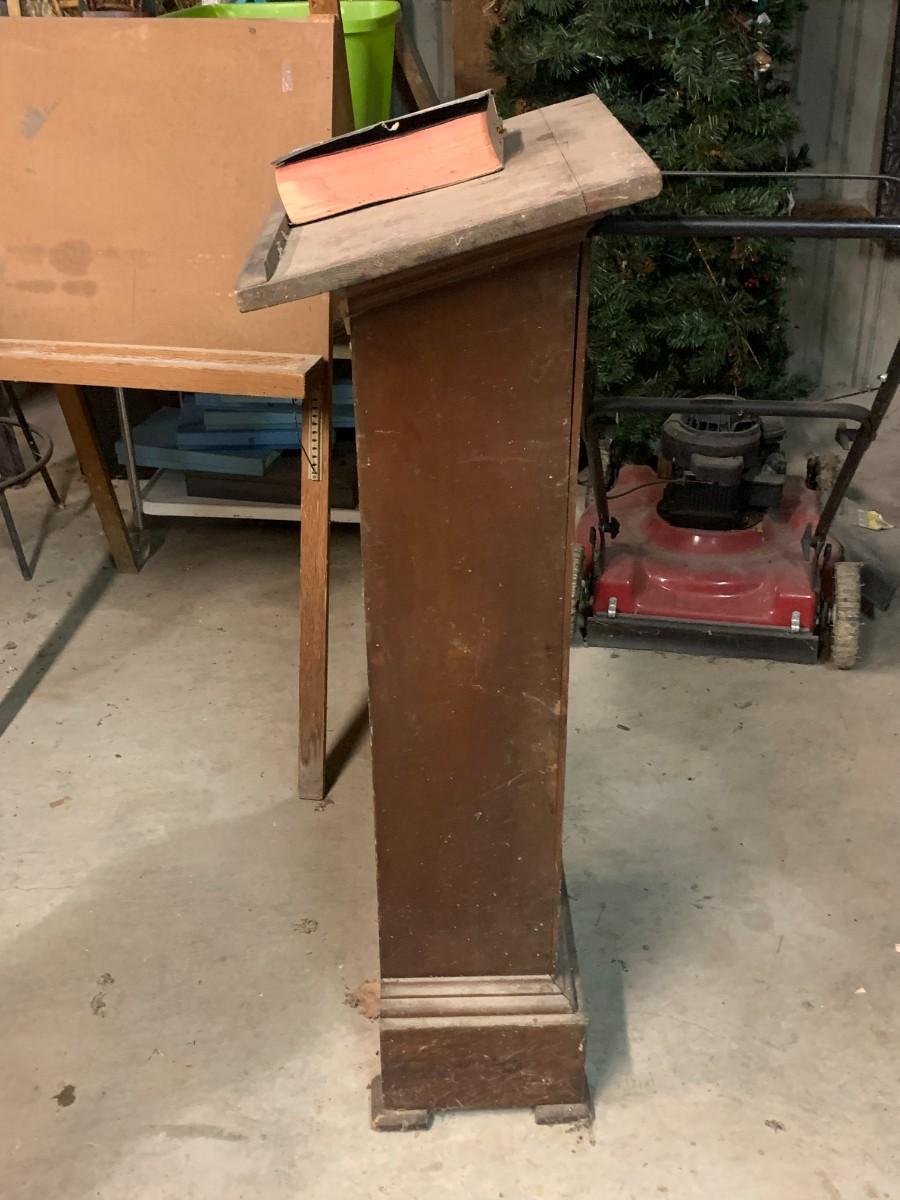 Listed is a vintage small wooden podium from an old church. I needs a good cleaning but seems to be in good condition.'