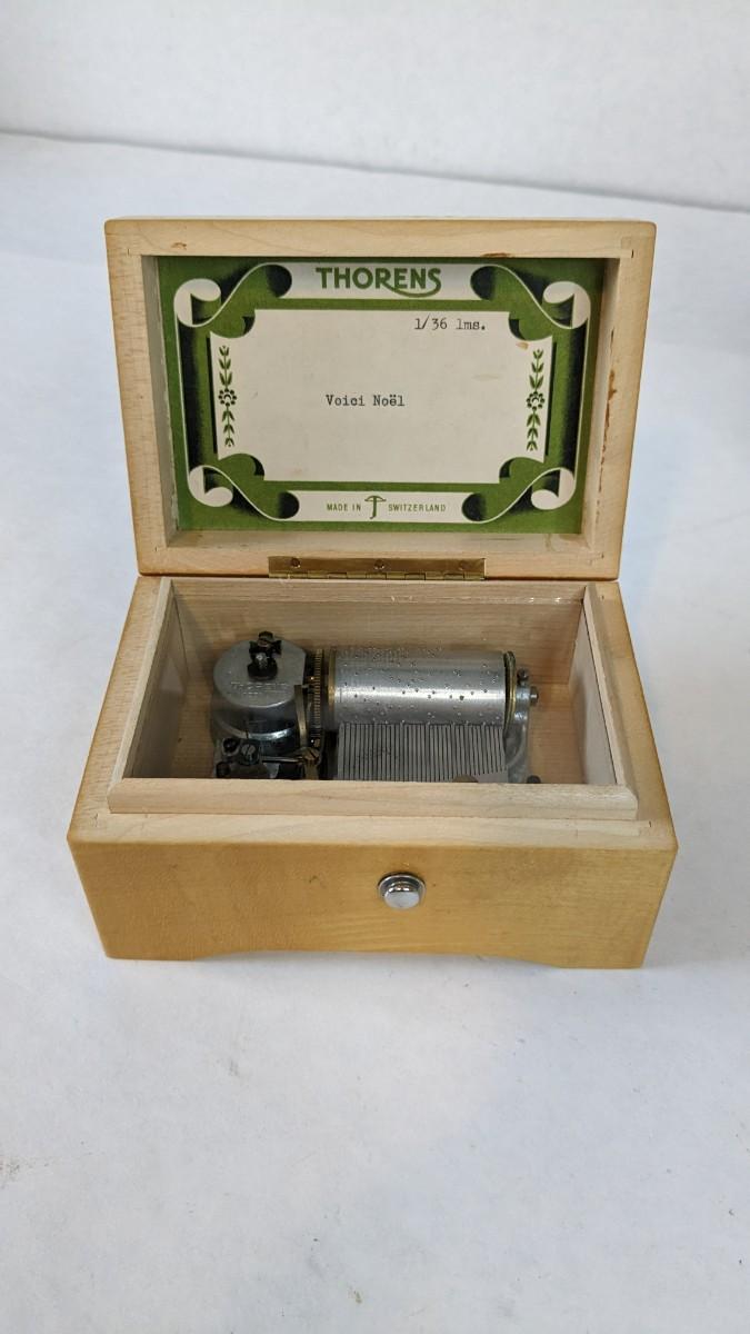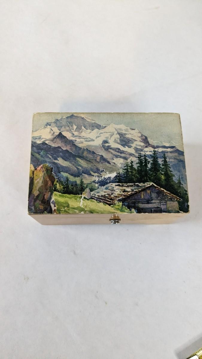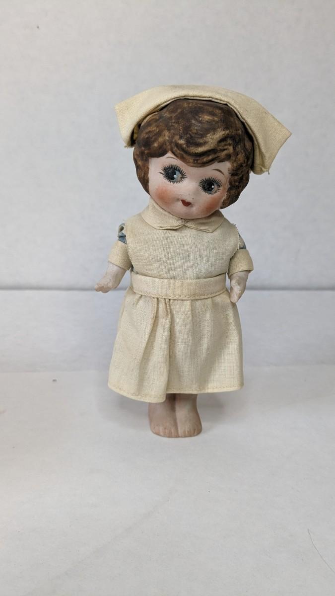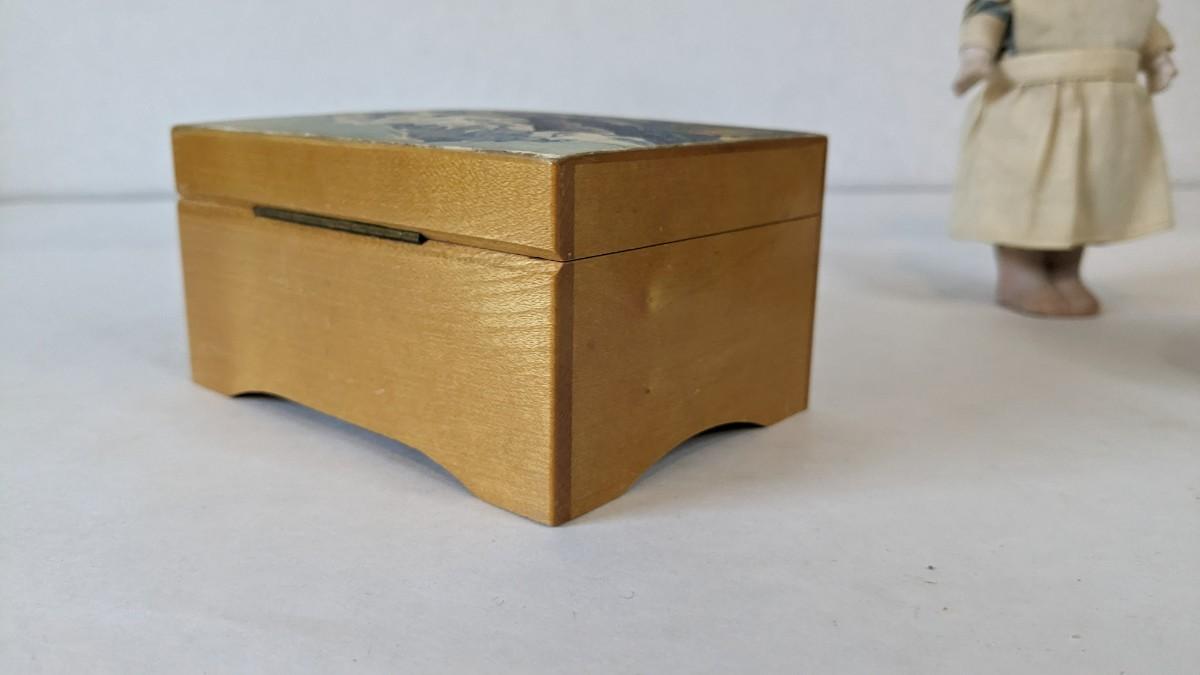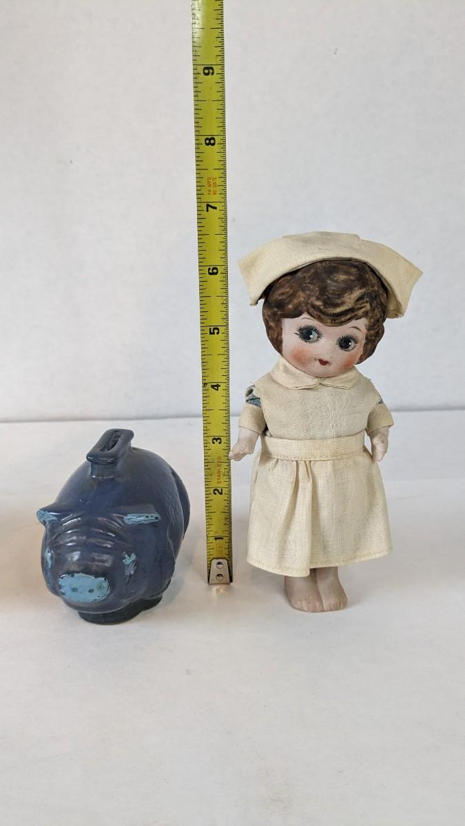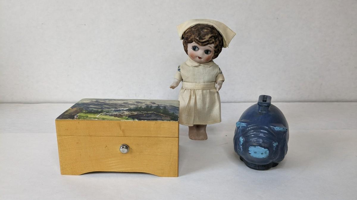 includes beautiful Swiss music box by Thorens. Some surface wear is present to image on lid, please note in photos.Also includes glass piggy bank and bisque porcelain Frozen Charlotte style doll in nurse outfit.