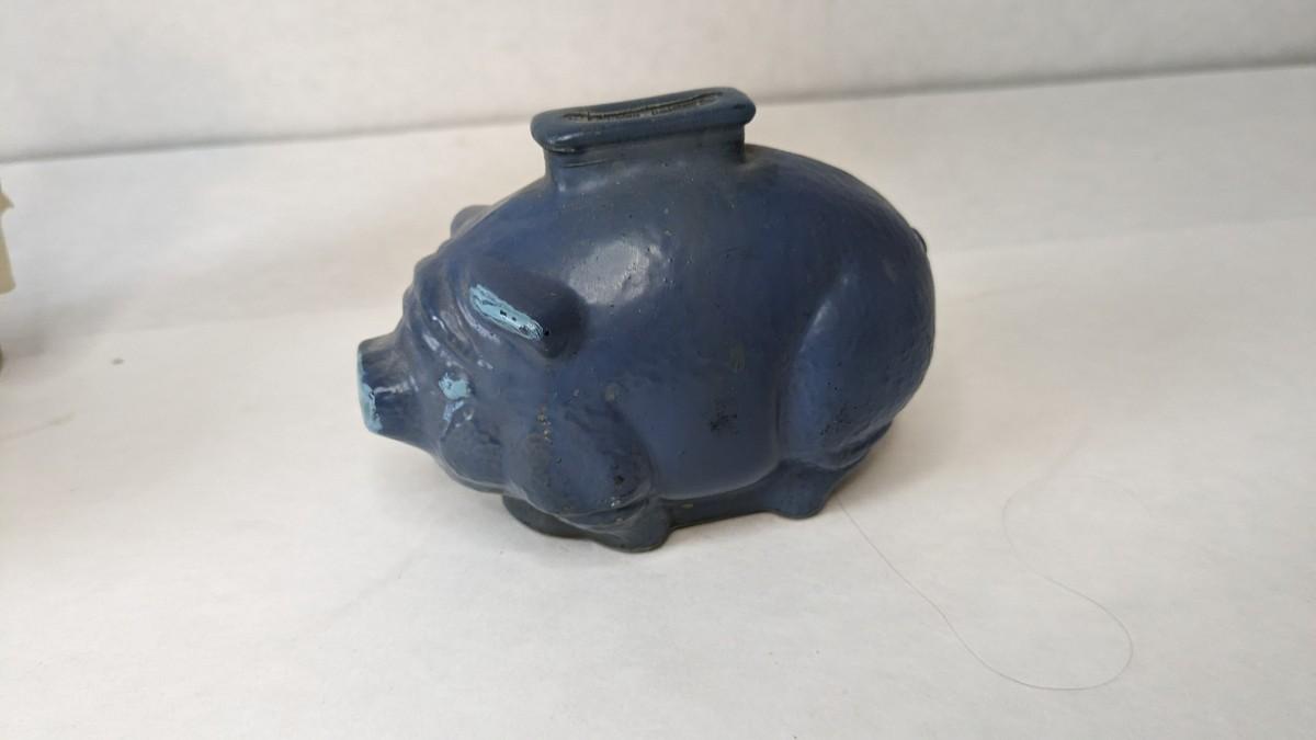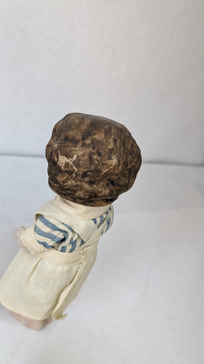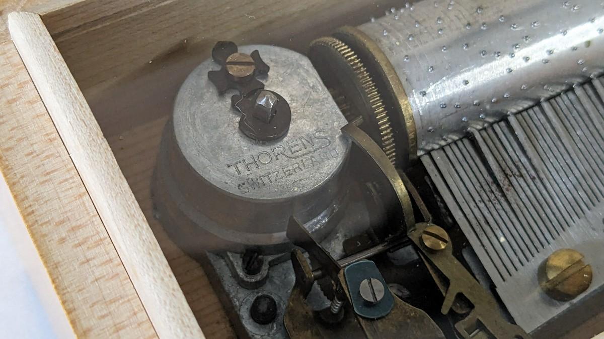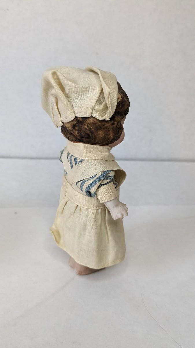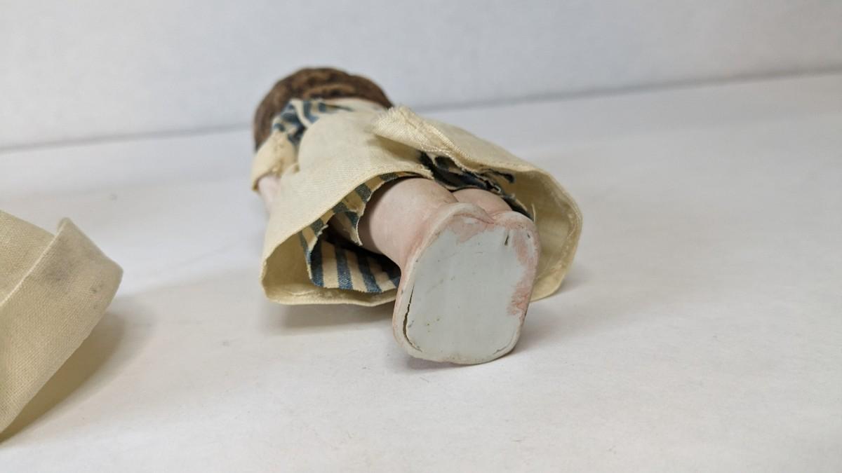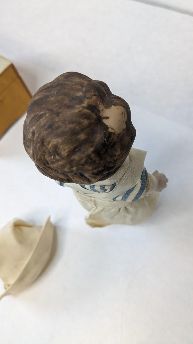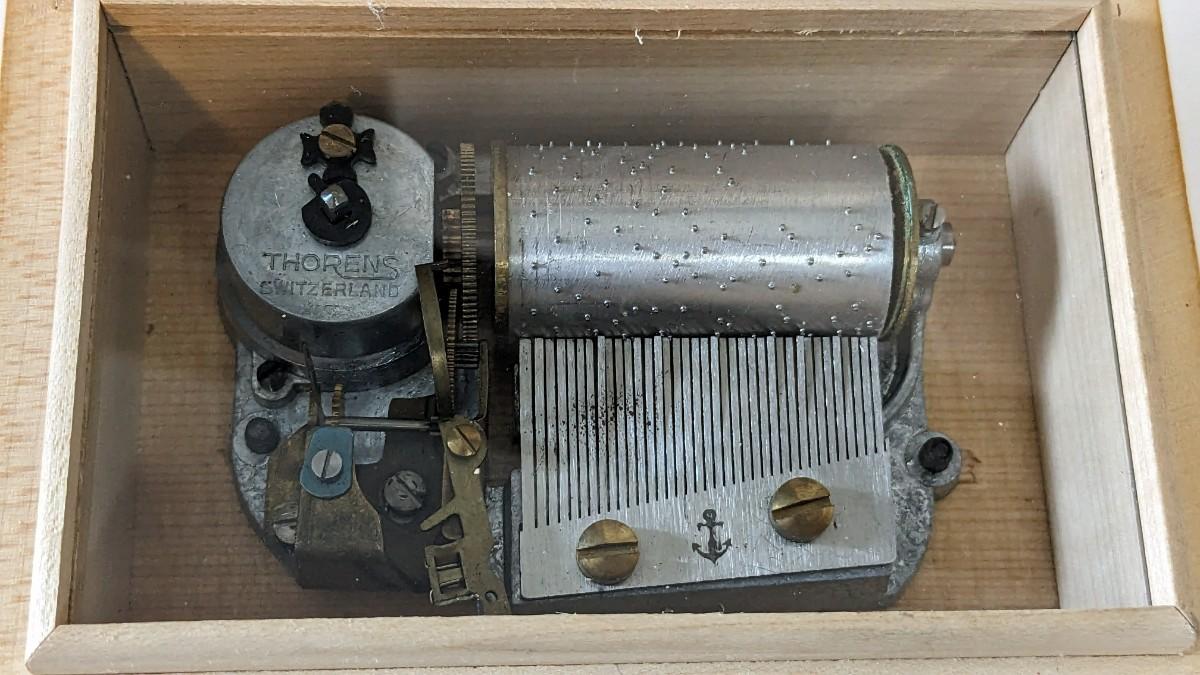 includes beautiful Swiss music box by Thorens. Some surface wear is present to image on lid, please note in photos.Also includes glass piggy bank and bisque porcelain Frozen Charlotte style doll in nurse outfit.