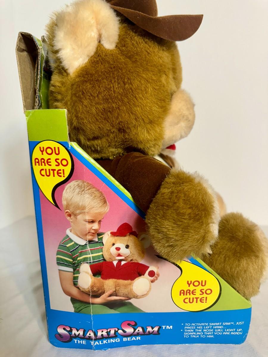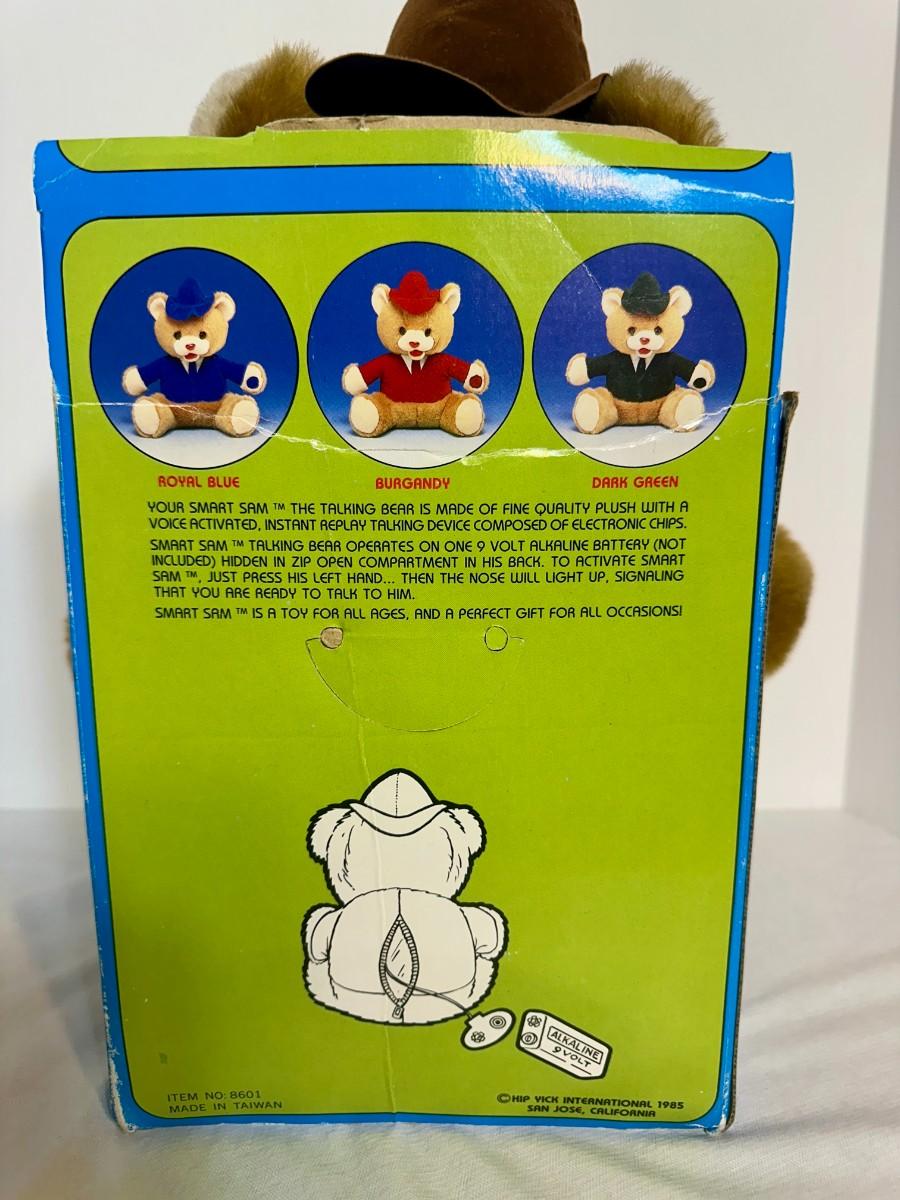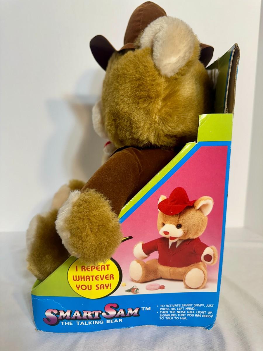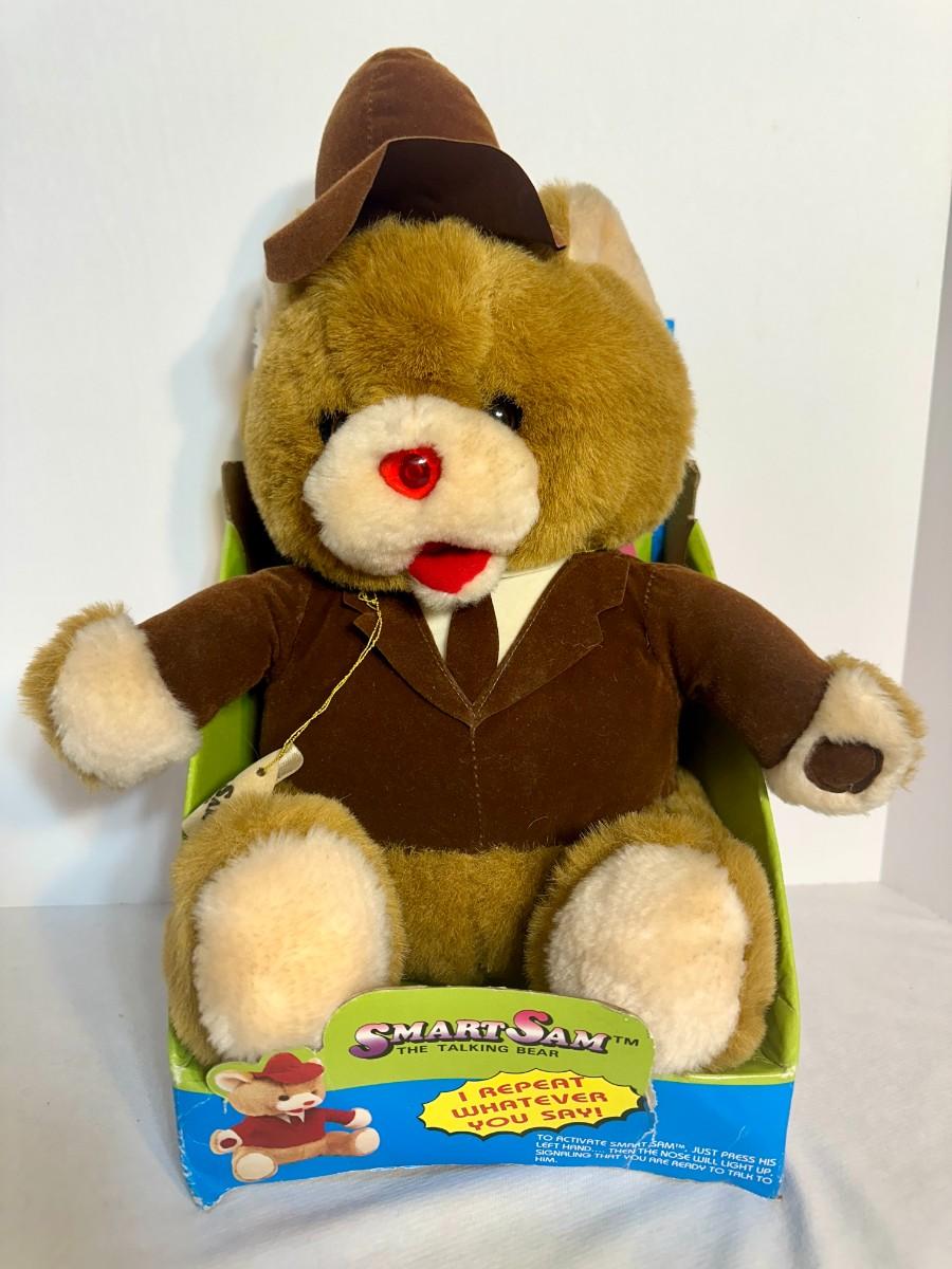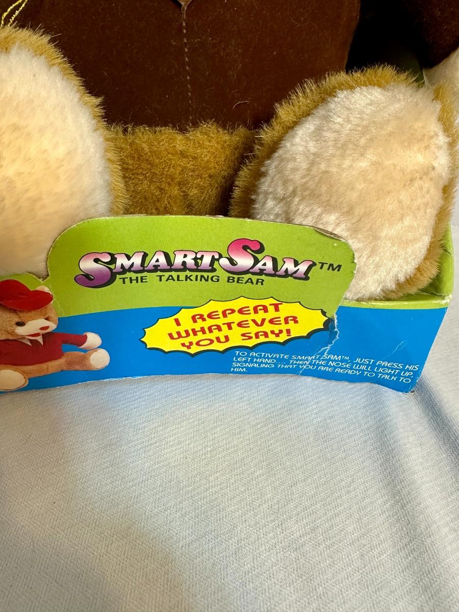 1985 Smart Sam records what you say when pushing on it's hand and then repeats it back. In working condition. Requires 9 volt battery. This is not the melody version.