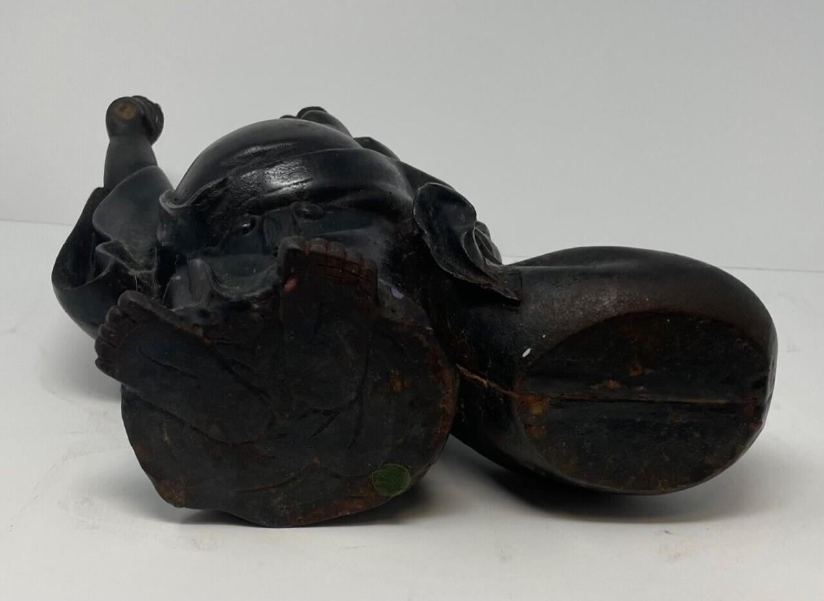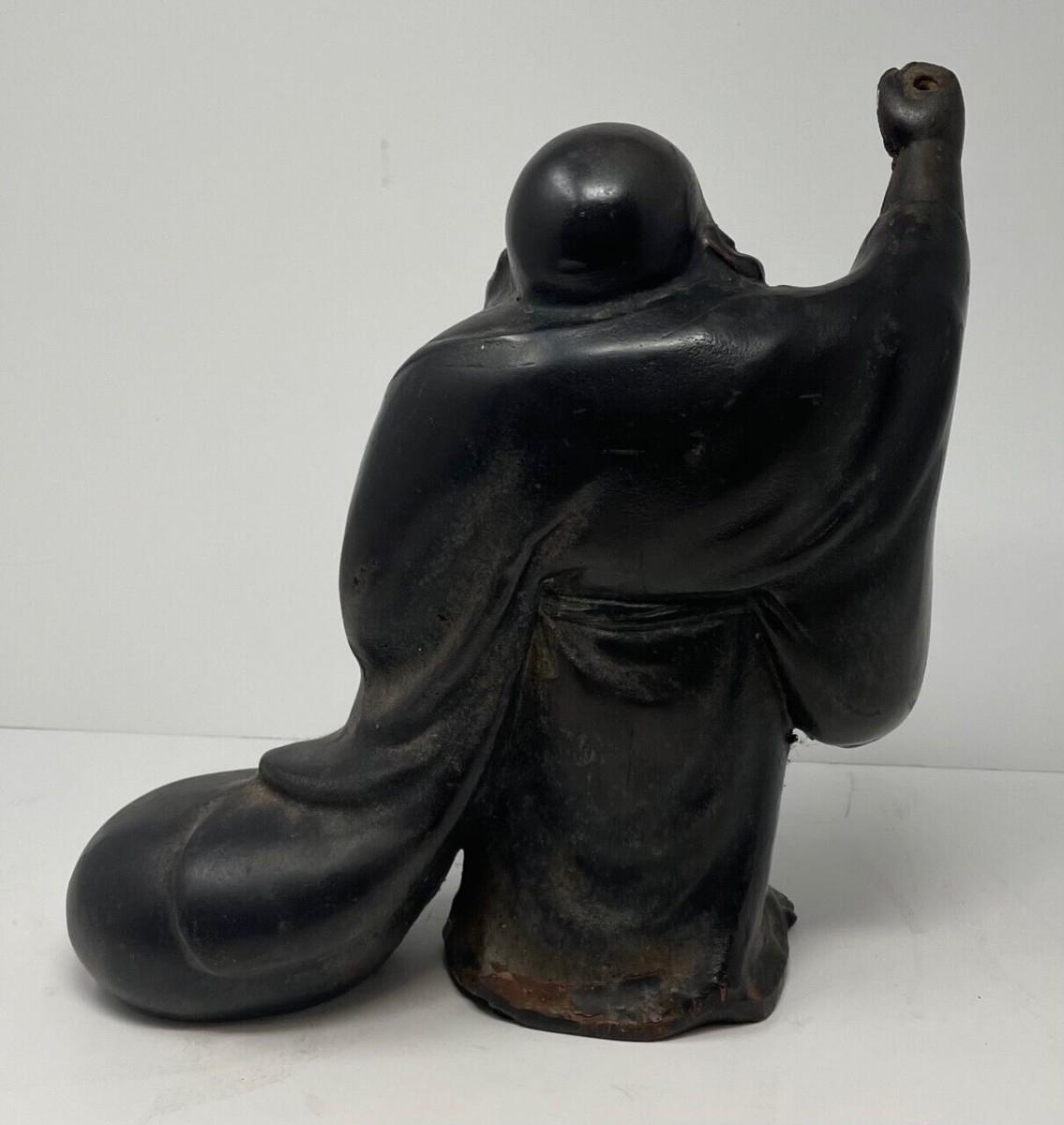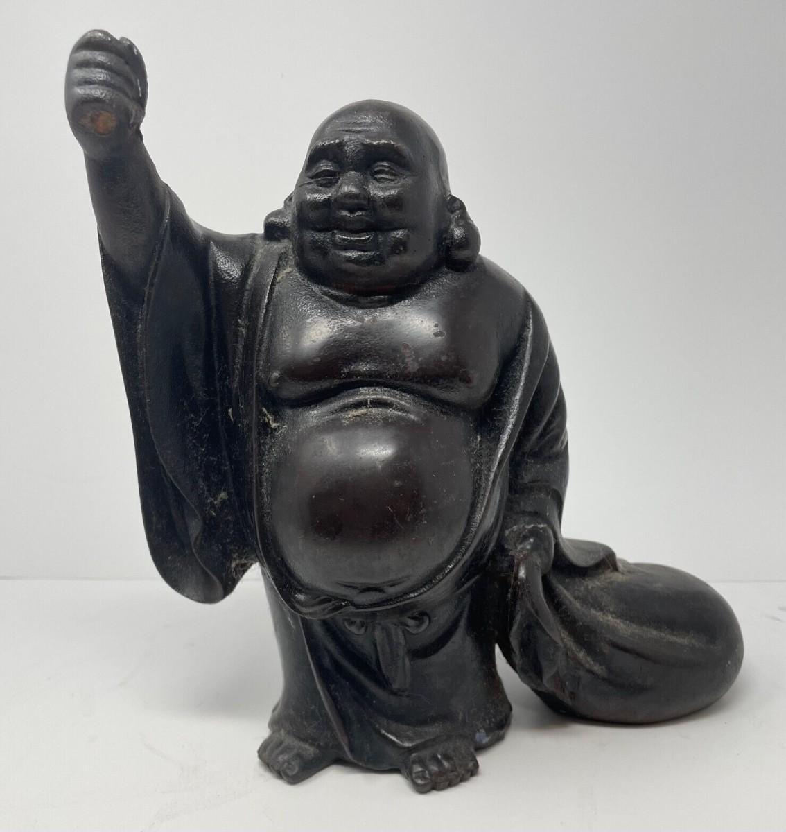 Description: This vintage Smiling Buddha statue is a beautiful addition to any collection. The craftsmanship is remarkable, with intricate details that showcase the artistry of Chinese culture. It is a perfect representation of Buddhism, with a serene expression that brings a sense of peace to any space. The weight of the statue adds to its authenticity and makes it a sturdy, long-lasting piece that will stay with you for years to come. Whether you are a collector or a spiritual enthusiast, this statue is a must-have item; Material: Metal; Measurement approximate: 10 H (Inches).