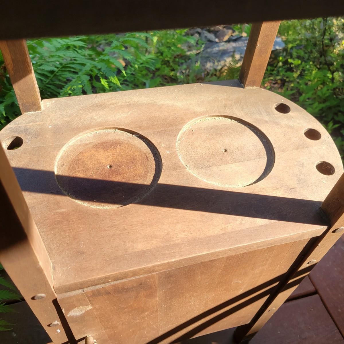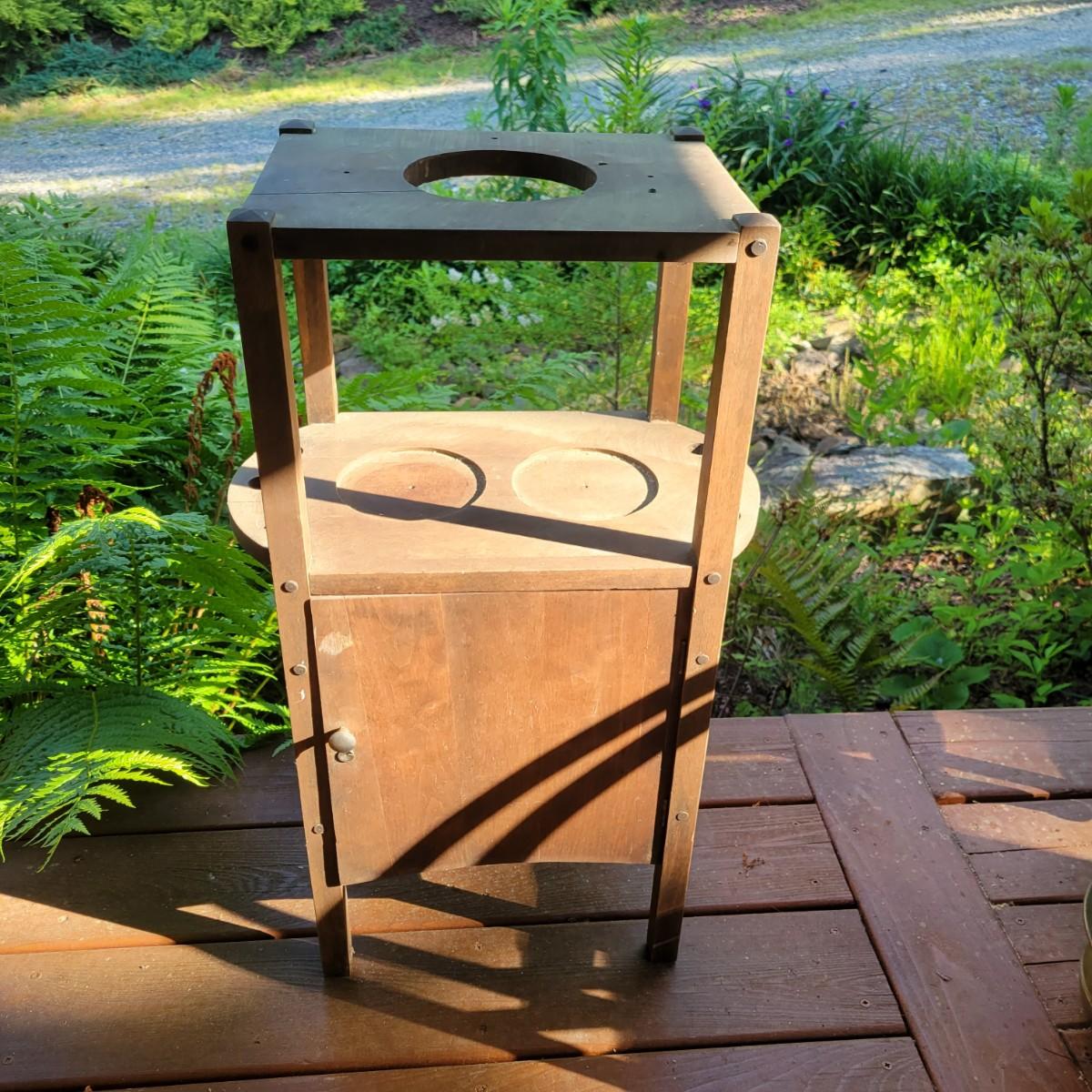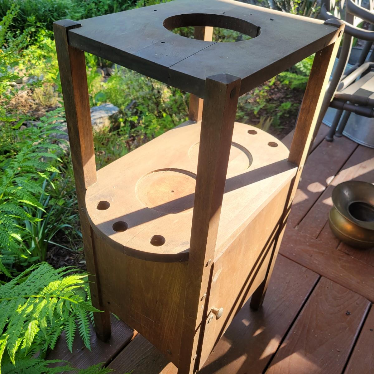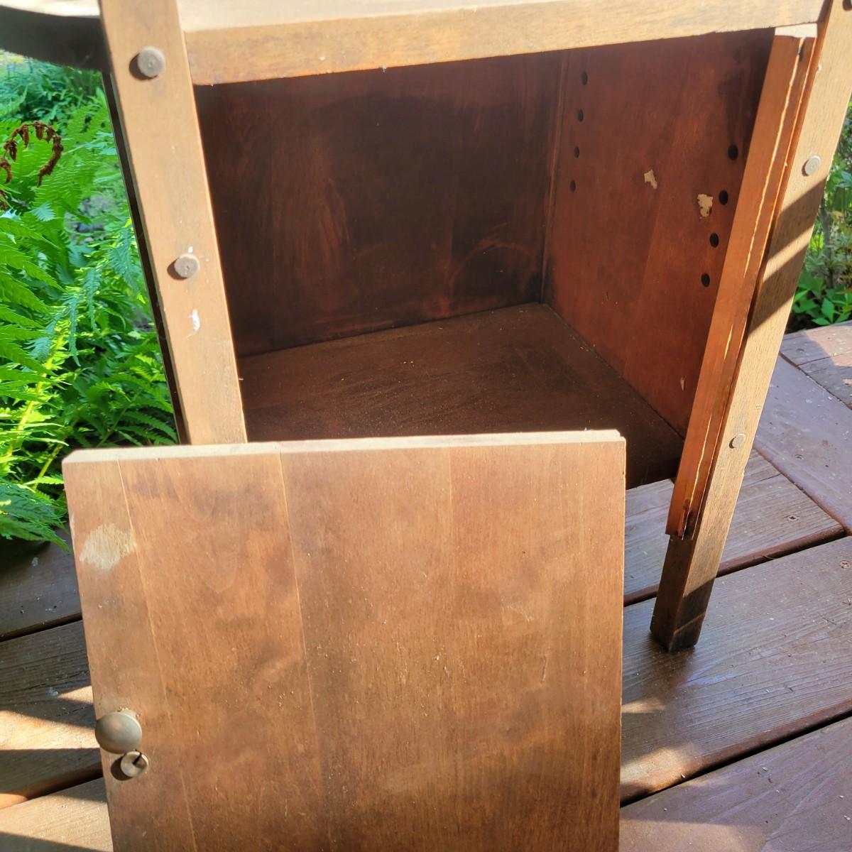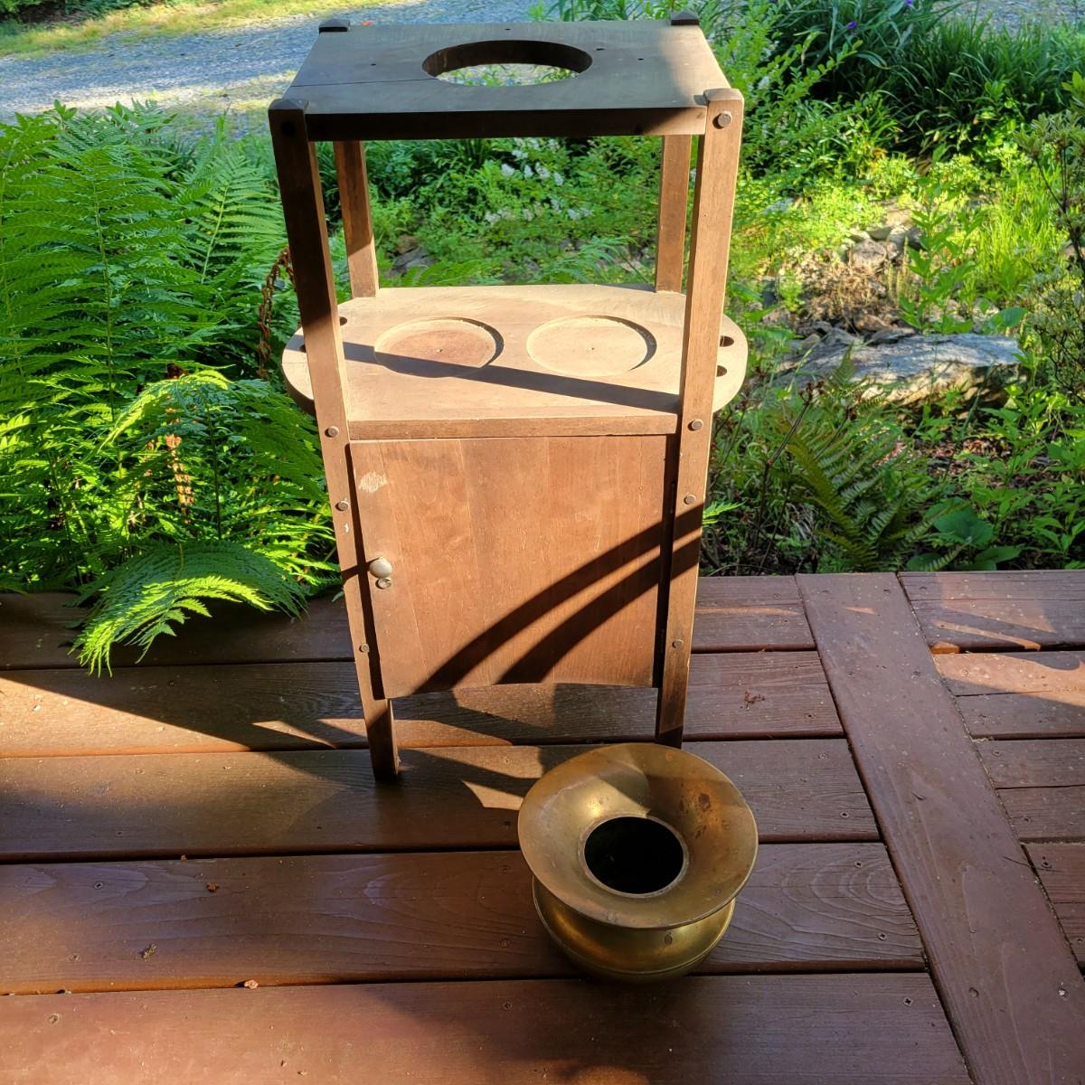 A solid wood, vintage smoking table with a medium brown stain. The table measures approximately 17" x 10.5" x 28"H. This table does have some blemishes and is a bit dirty. The cabinet door will require repair. Also included is a brass spittoon that has some dents and dings. Local pickup only