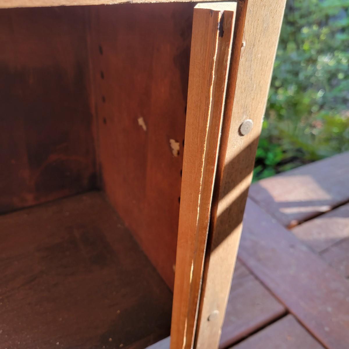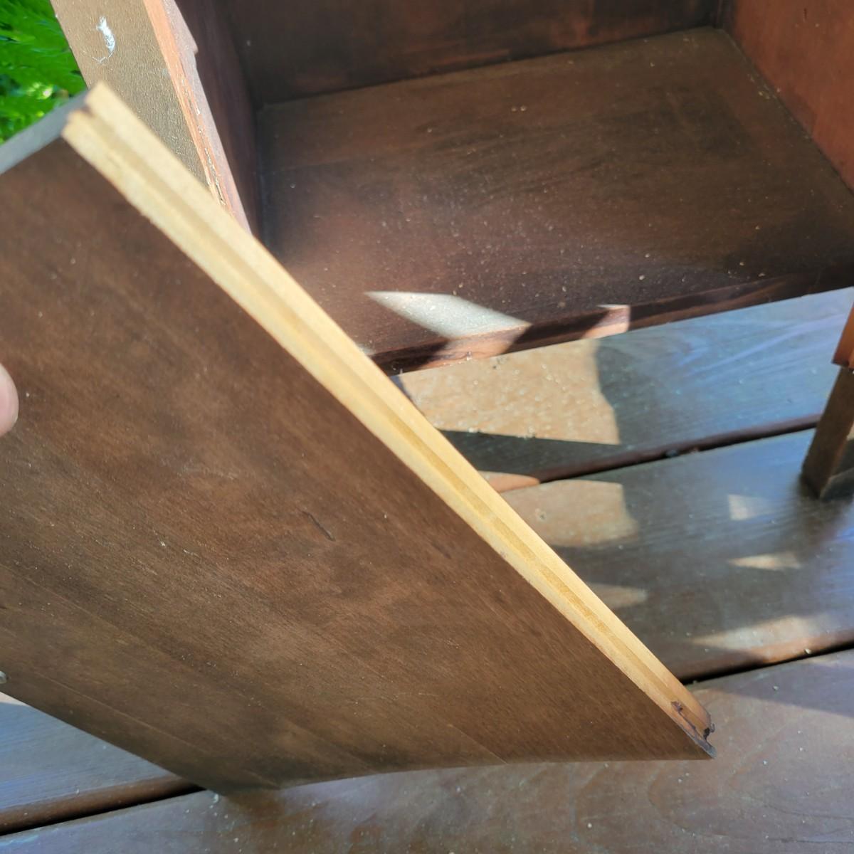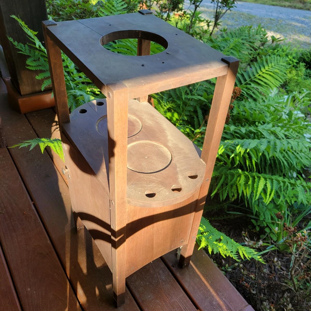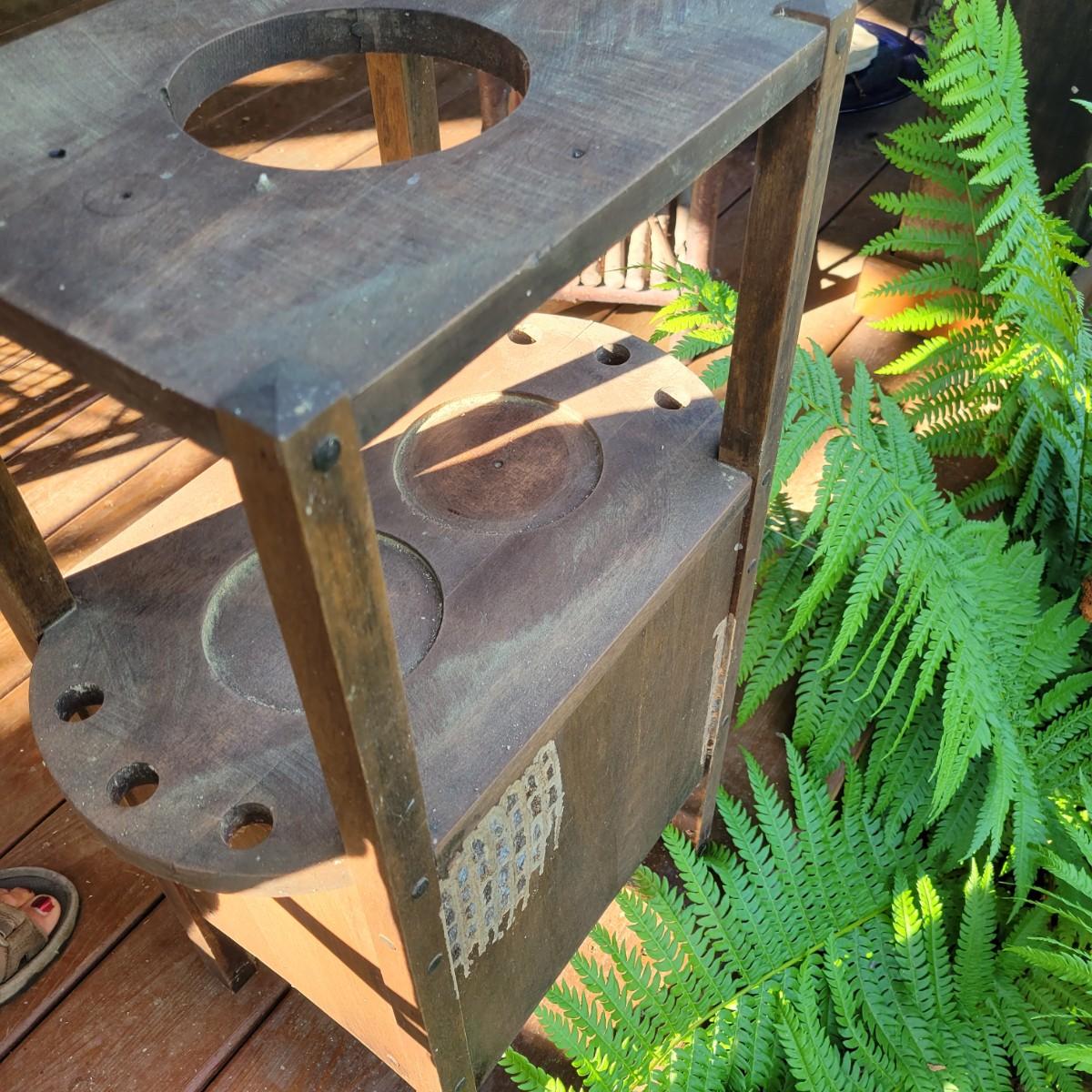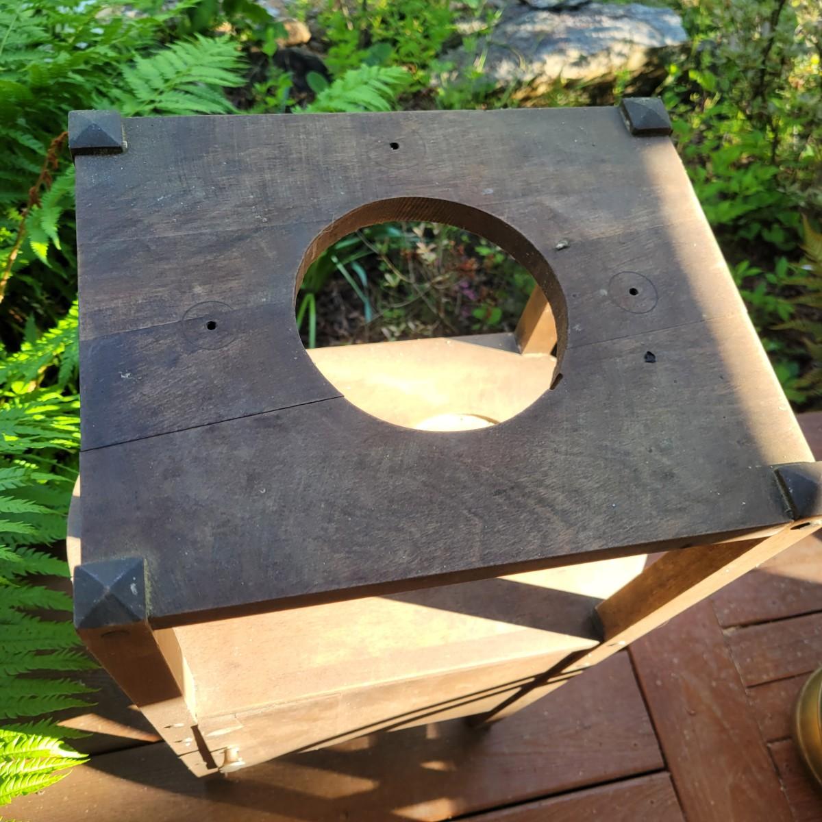 A solid wood, vintage smoking table with a medium brown stain. The table measures approximately 17" x 10.5" x 28"H. This table does have some blemishes and is a bit dirty. The cabinet door will require repair. Also included is a brass spittoon that has some dents and dings. Local pickup only