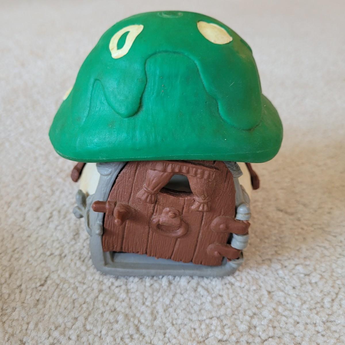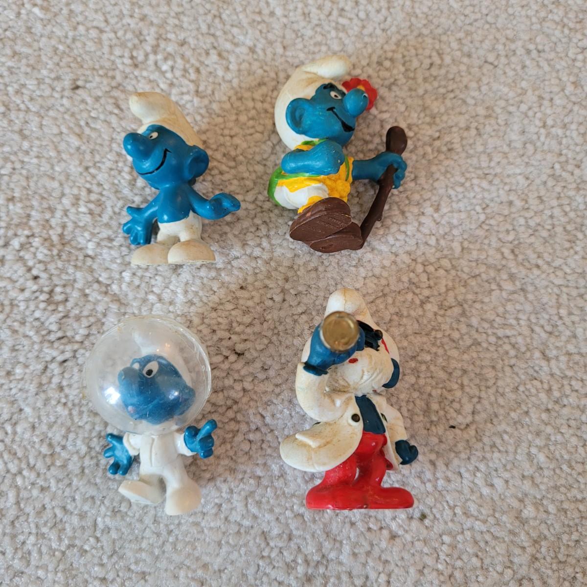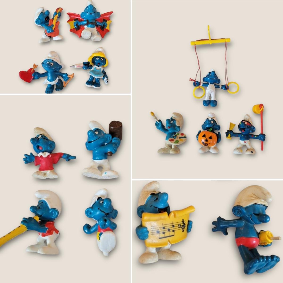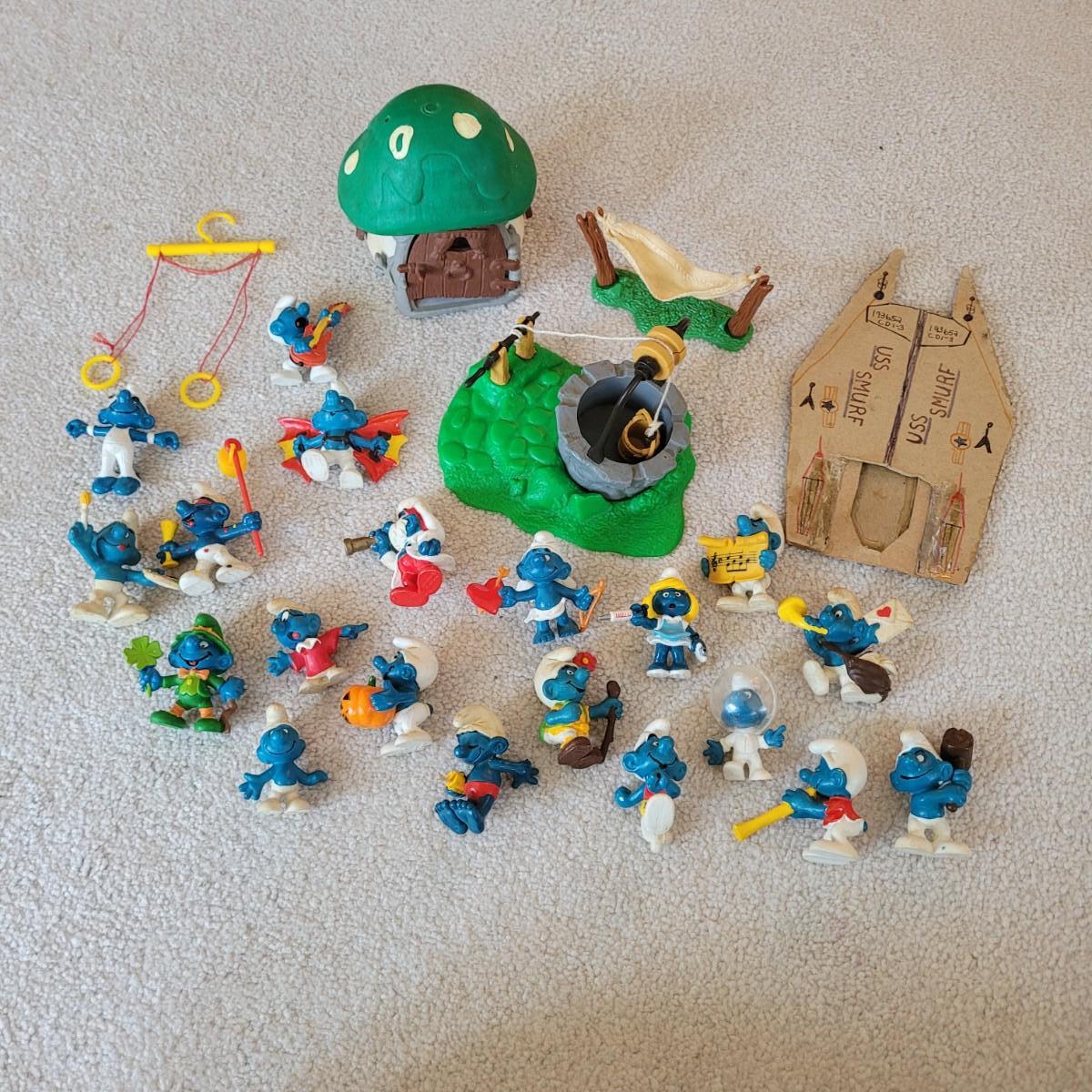 This lot includes a collection of vintage Smurfs toys and figurines. Included are a mushroom house, a well, a hammock, and a home made cardboard spaceship. Different types of Smurf figurines include: the gymnast, guitarist, pirate, artist, leprechaun, hiker, cupid, doctor, astronaut, mail person, and musician. One of the figurines appears to be missing its prop. The astronauts helmet is taped.