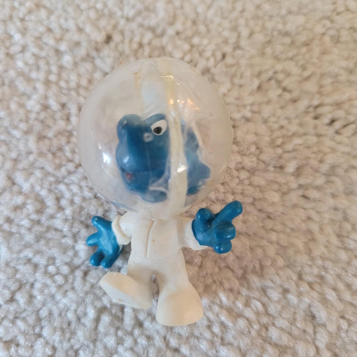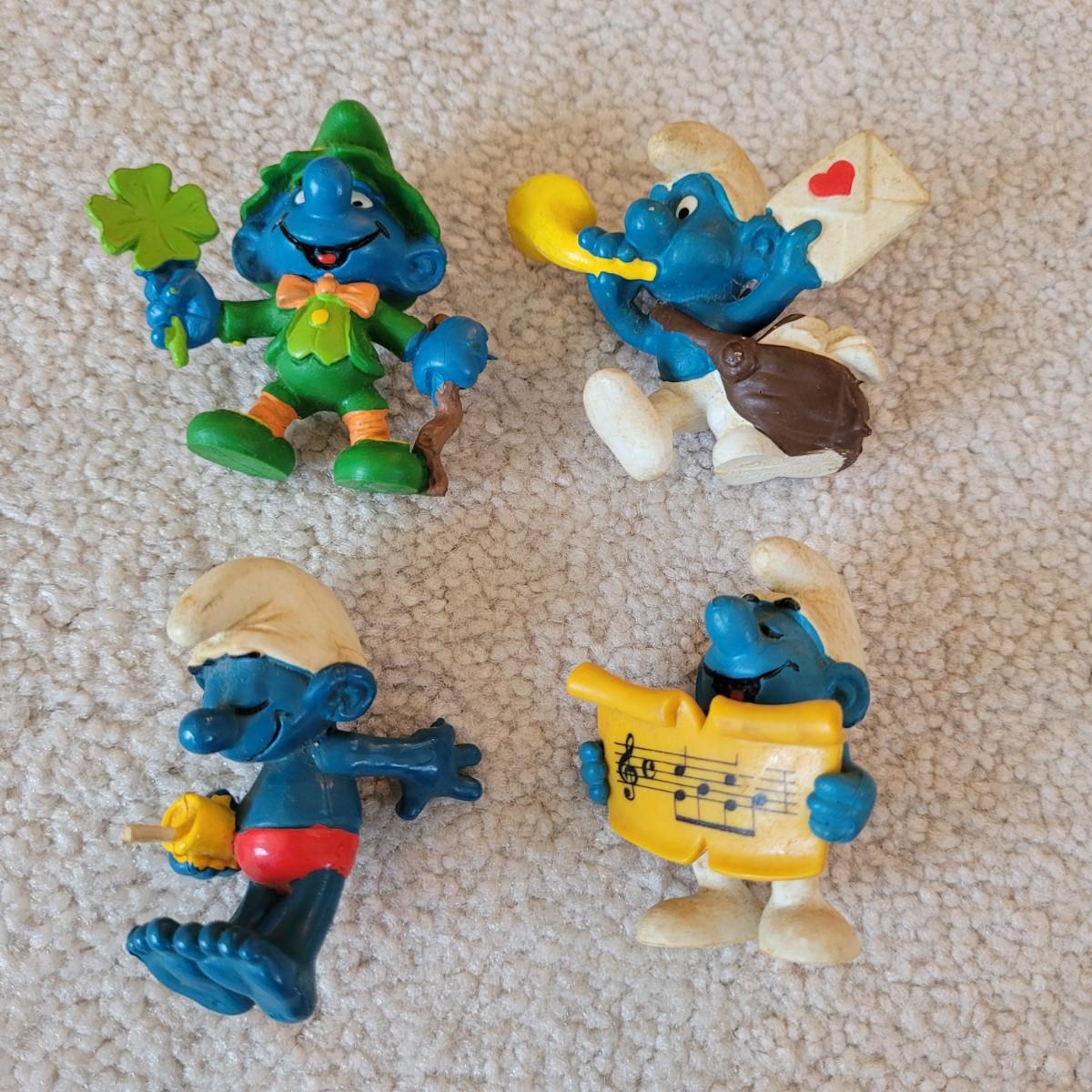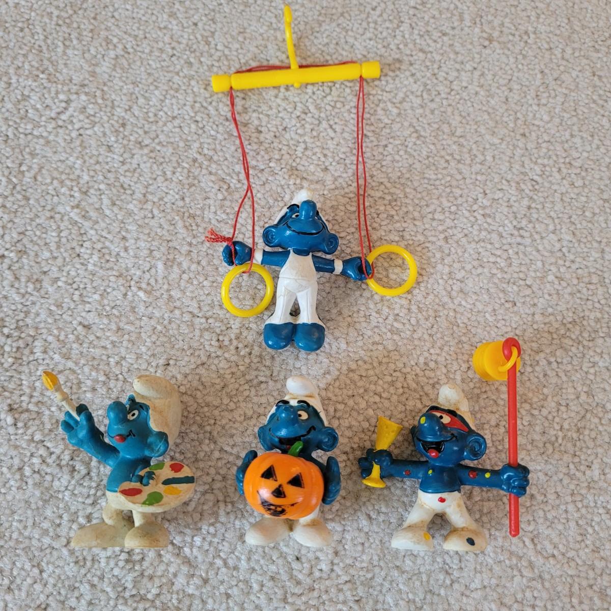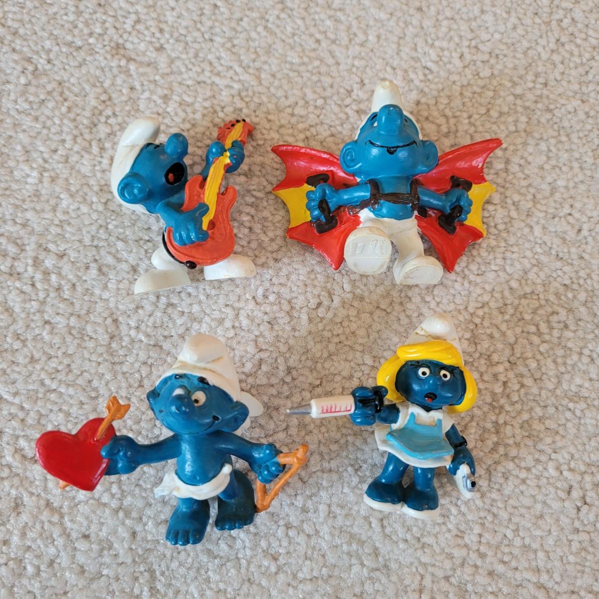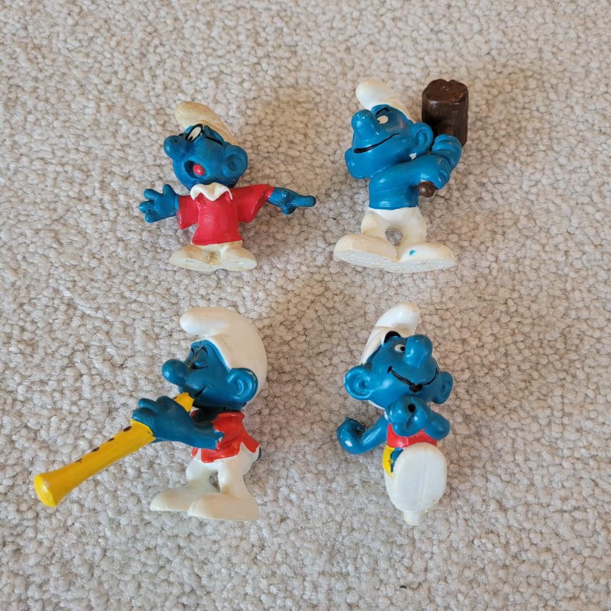 This lot includes a collection of vintage Smurfs toys and figurines. Included are a mushroom house, a well, a hammock, and a home made cardboard spaceship. Different types of Smurf figurines include: the gymnast, guitarist, pirate, artist, leprechaun, hiker, cupid, doctor, astronaut, mail person, and musician. One of the figurines appears to be missing its prop. The astronauts helmet is taped.