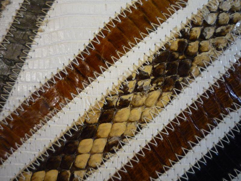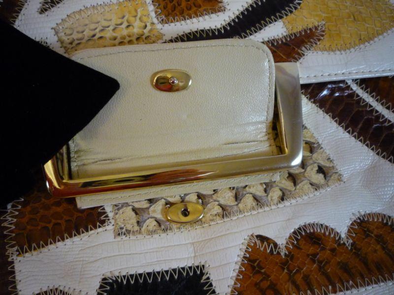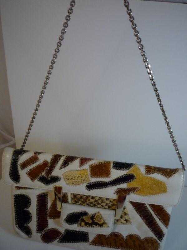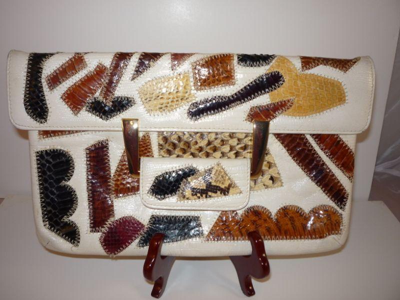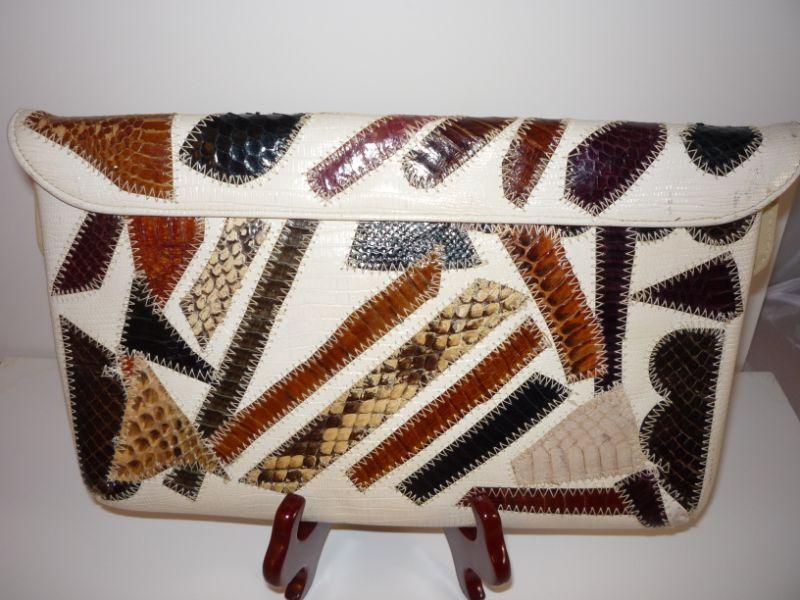 Vintage, unique clutch or shoulder bag (has attached silver chain with can stay in bag) Fold over tab snap closure. Snakeskin - very unique bag. Measures 11 inches by 7 inches -- zipper interior pocket.