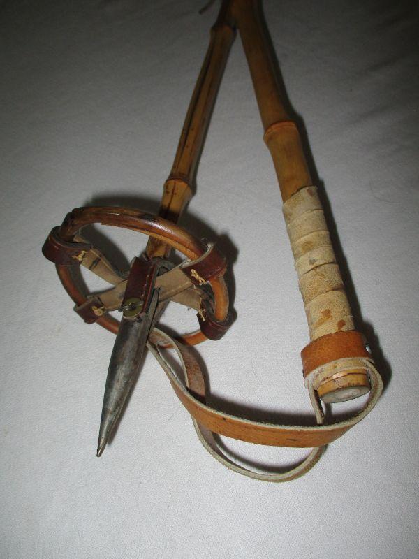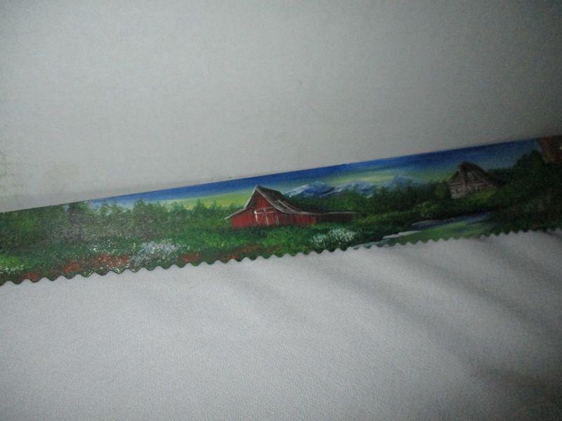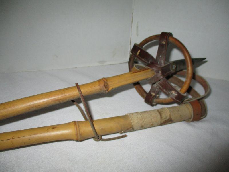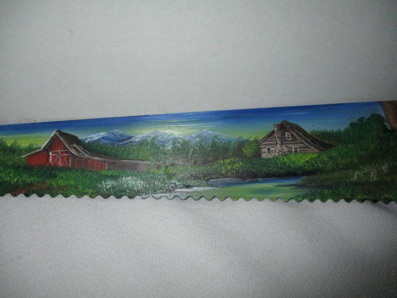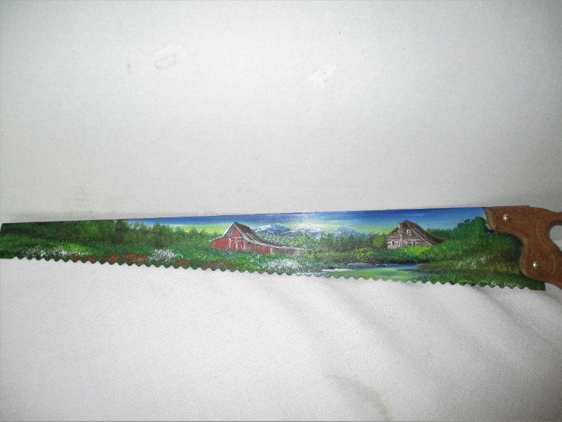 *BAMBOO POLES WITH LEATHER WRAPPED BOTTOM AND HANDLES, NICELY PAINTED COUNTRY SCENERY ON SAW