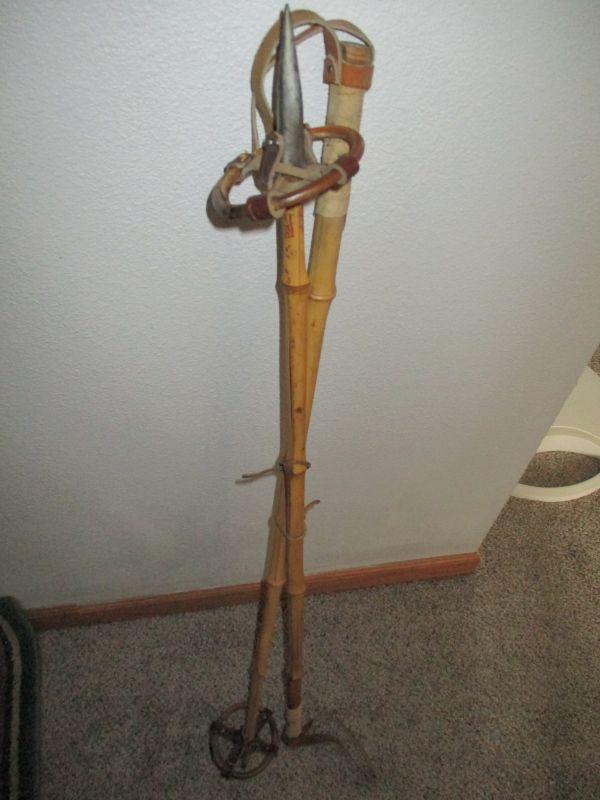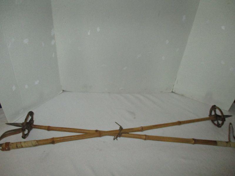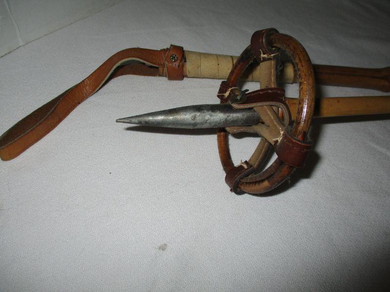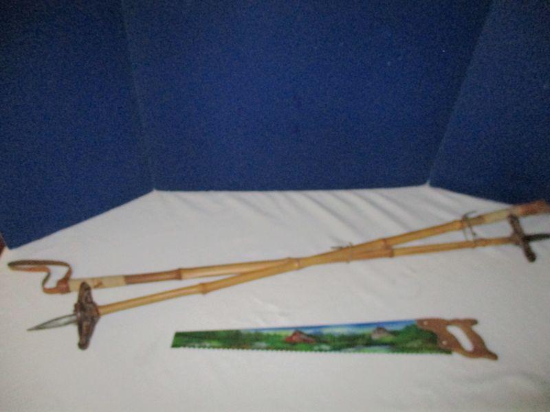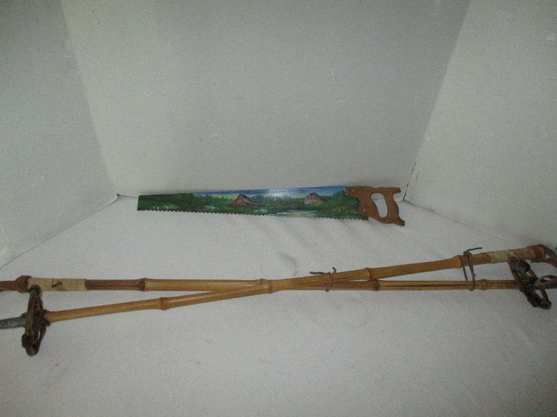 VINTAGE SNOW POLES & HAND PAINTED SAW