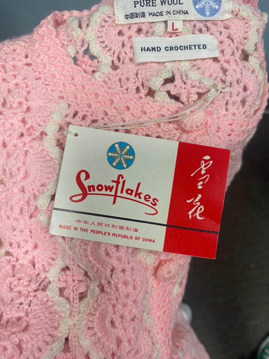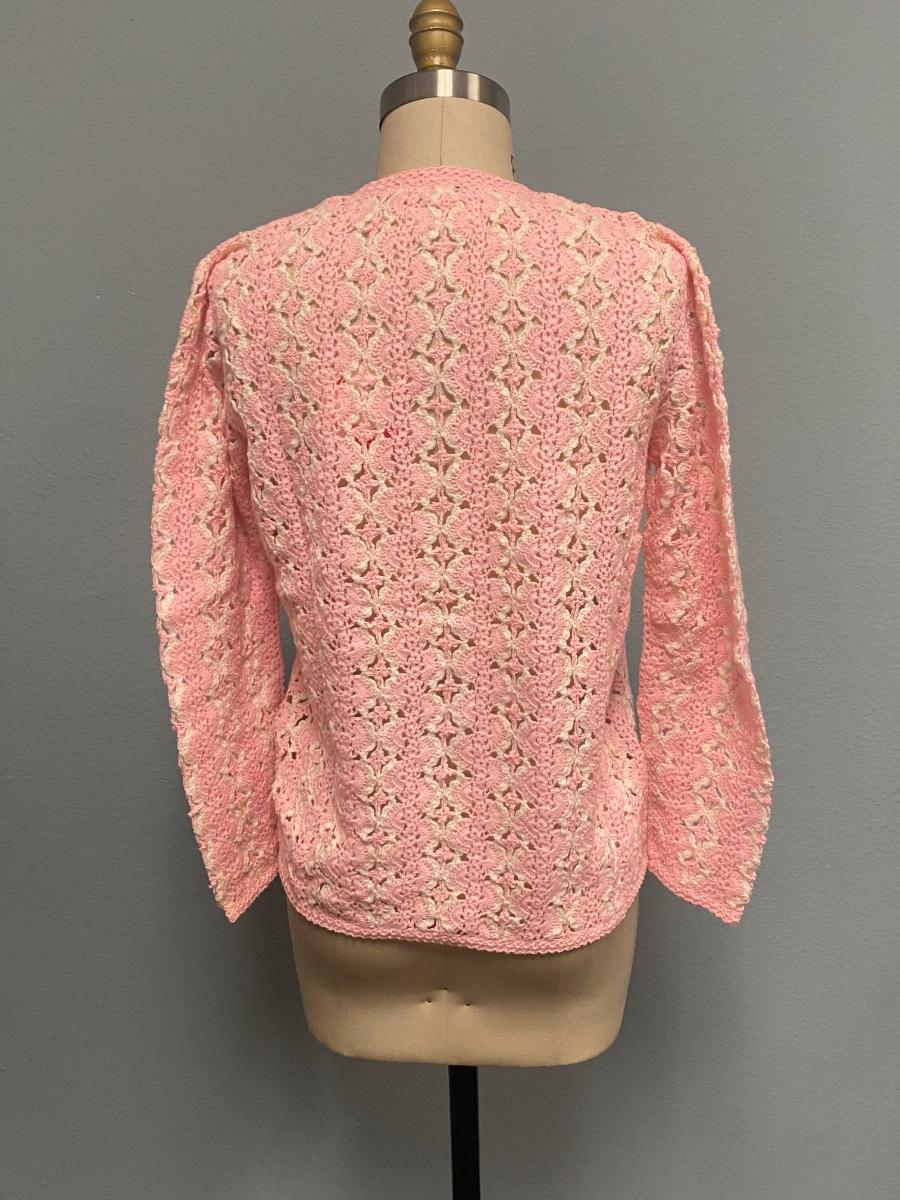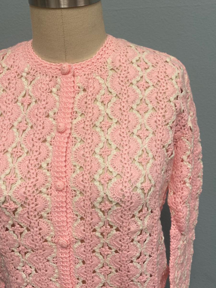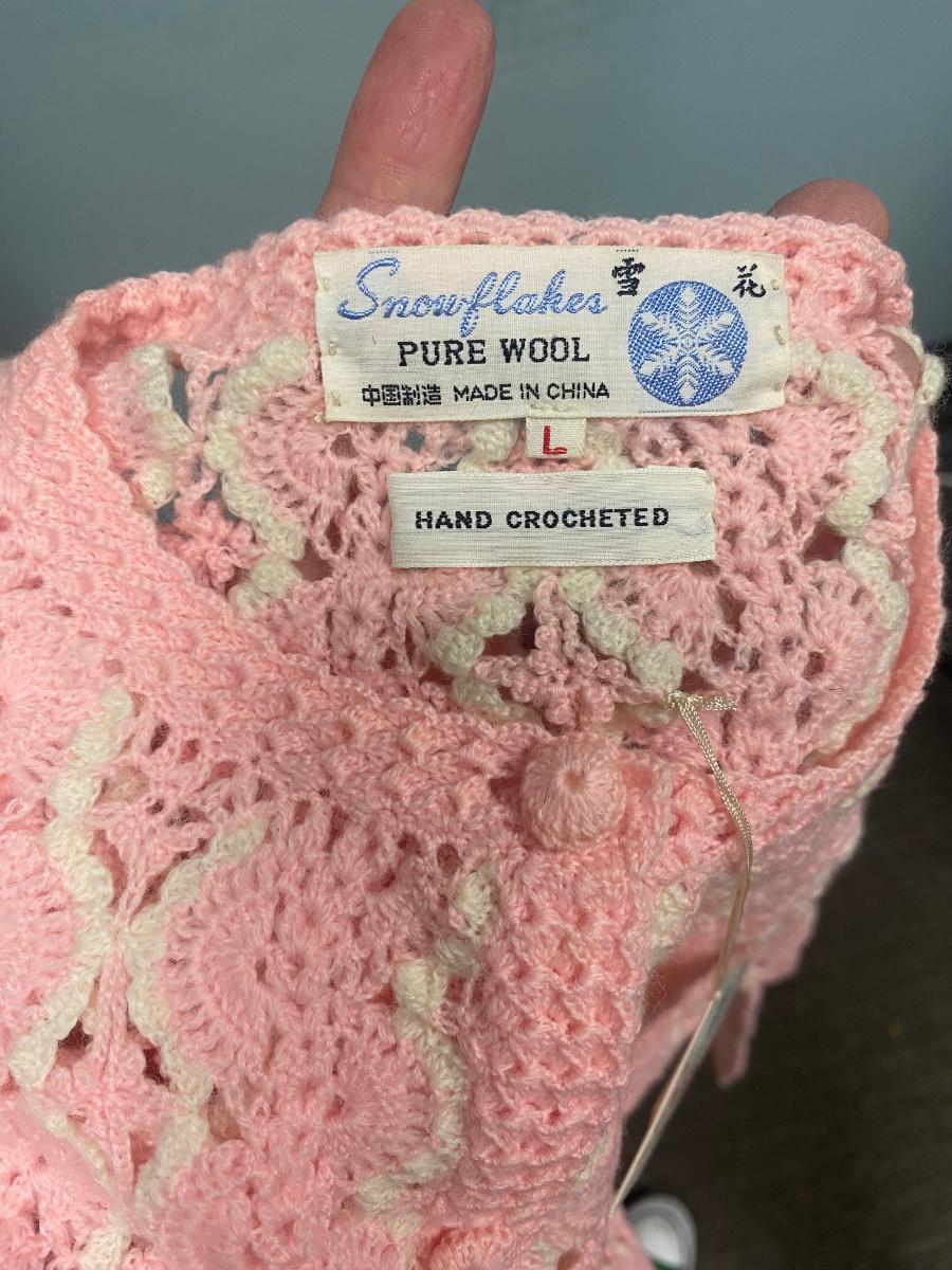 Vintage Snowflakes Hand Crocheted Pure Wool Large Pink Button Up Sweater
