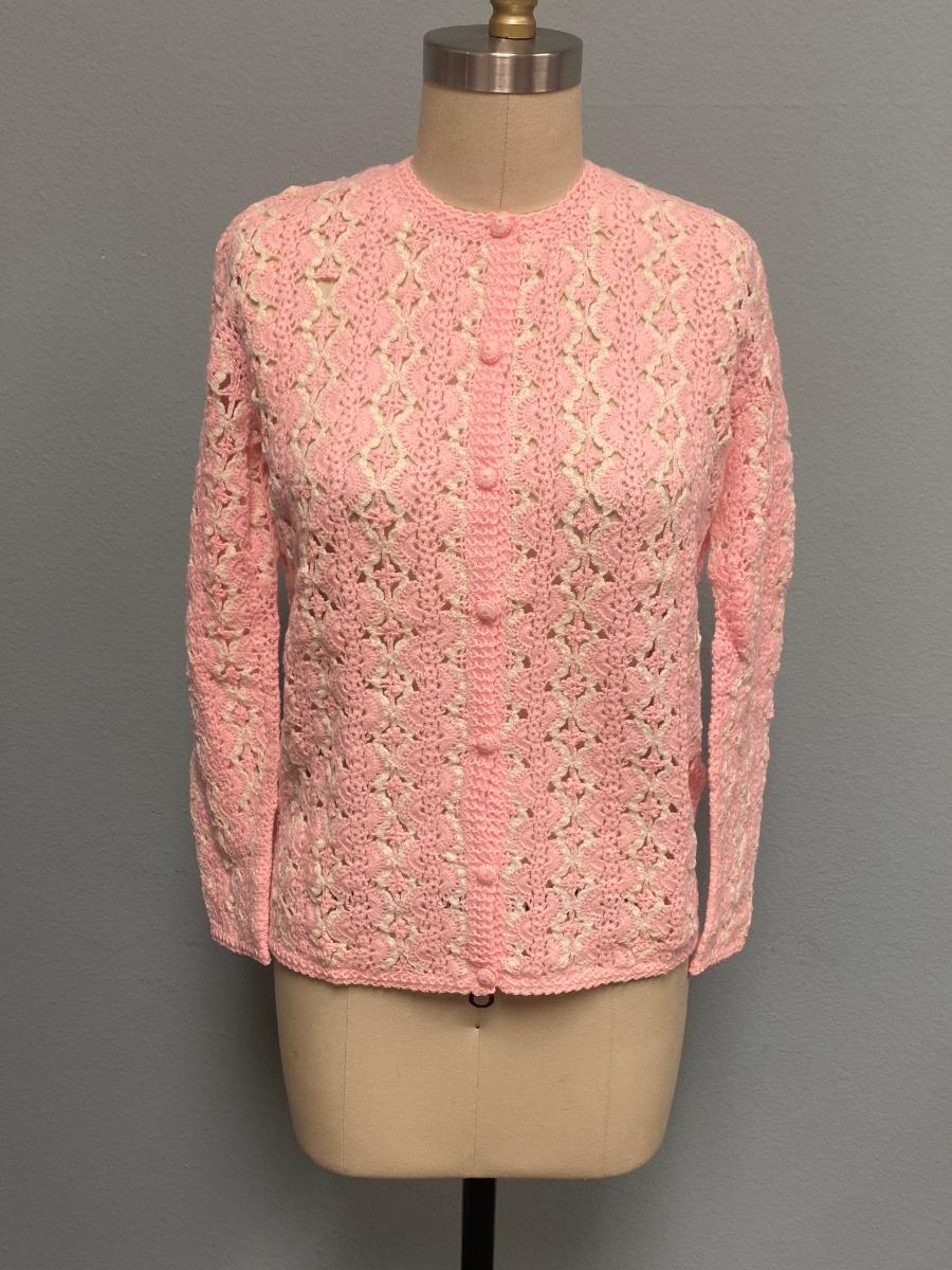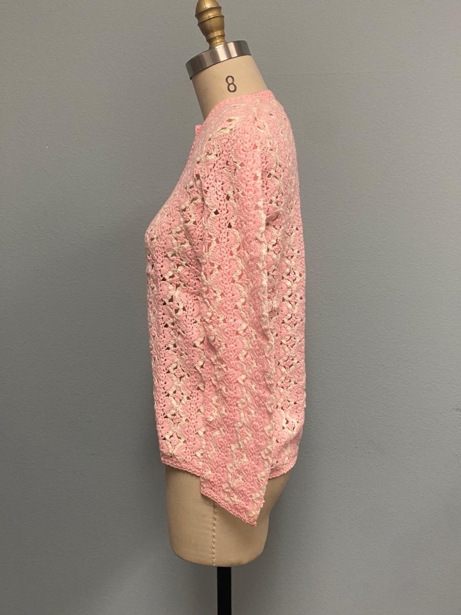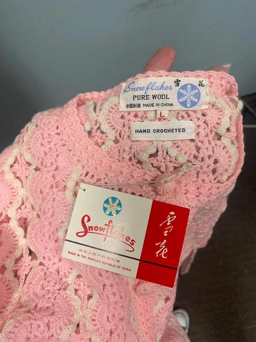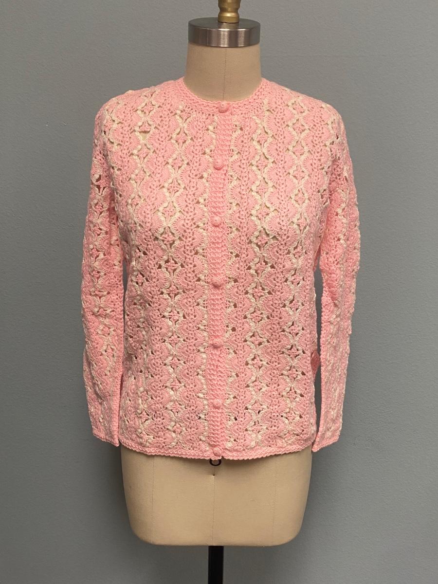 Vintage Snowflakes Hand Crocheted Pure Wool Large Pink Button Up Sweater