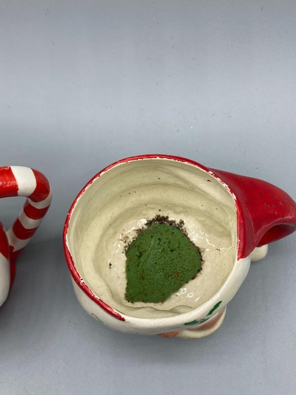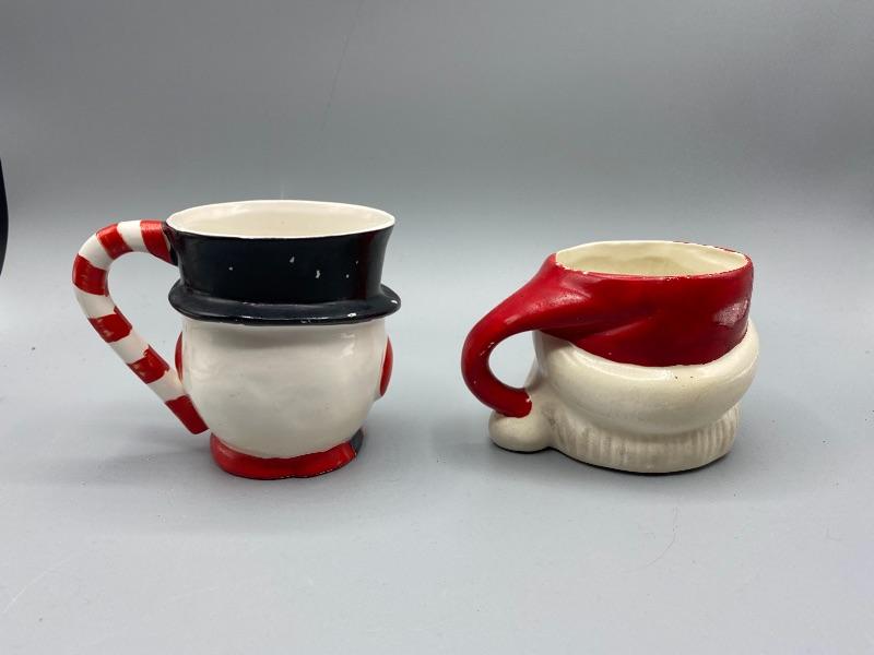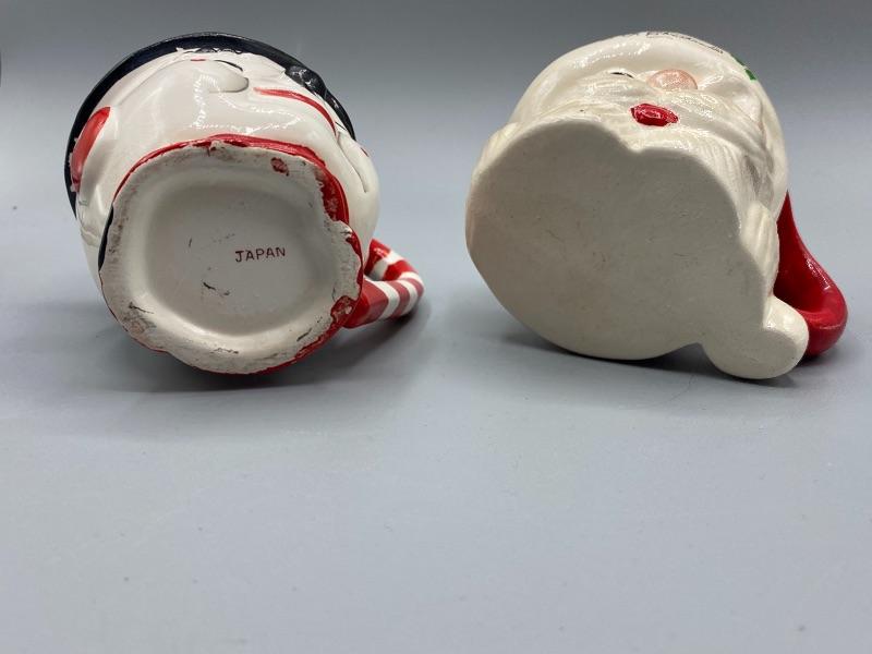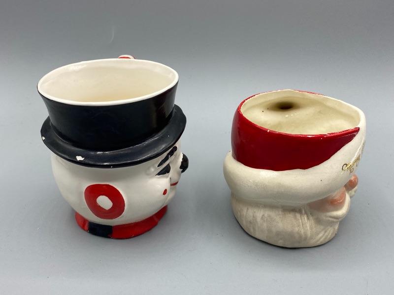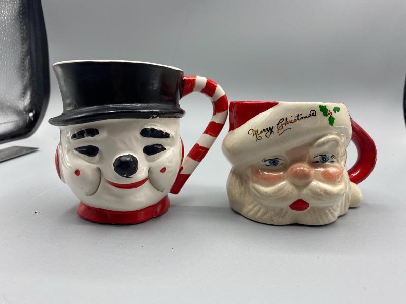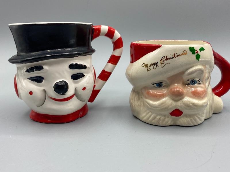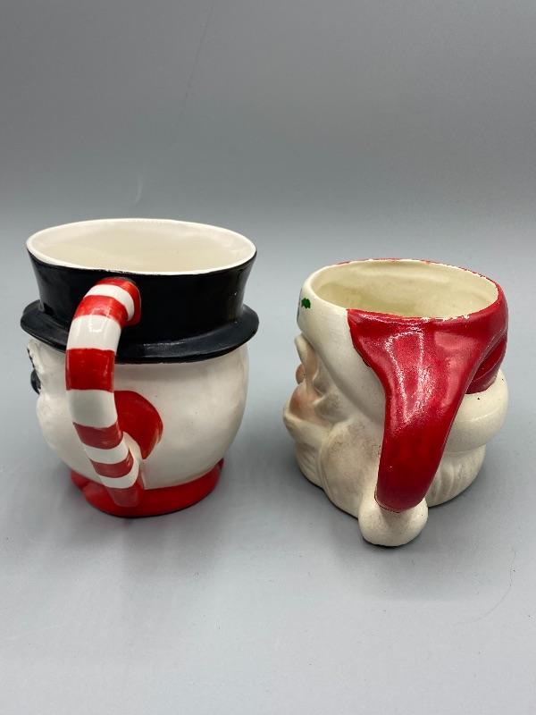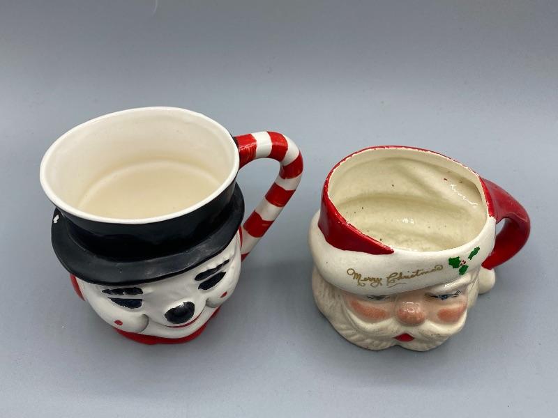 Pair of vintage holiday coffee cups. Frosty the Snowman and Santa Claus. Frosty is marked Japan on the bottom. Good vintage condition. No chips. Previous owner had something stuck in Santa, he has old putty in the bottom. Around 3" tall.