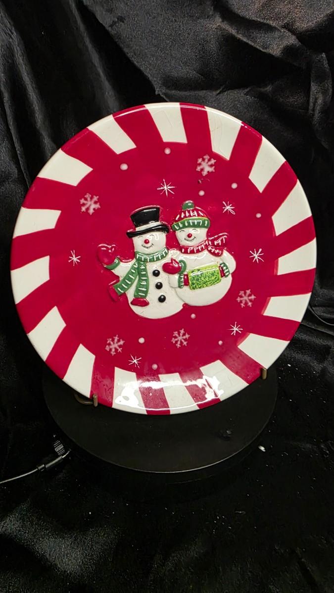 In the hush of a winter's eve, where snowflakes twirl like forgotten dreams, two figures emerge from the frost—a dapper snowman in his top hat and striped green scarf, arm linked with his beaming companion, clutching a verdant gift wrapped in holiday promise. Their world unfolds on this glossy ceramic canvas, eight inches across, painted in bold crimson stripes that radiate like candy canes caught in a northern glow, dotted with delicate white flakes that seem to shimmer under the hearth's light. Crafted from high-fired clay kissed with lead-free glazes, this piece whispers of timeless gatherings, its raised reliefs inviting fingers to trace the joyful contours of scarves and smiles, evoking the warmth of shared stories by the fire.