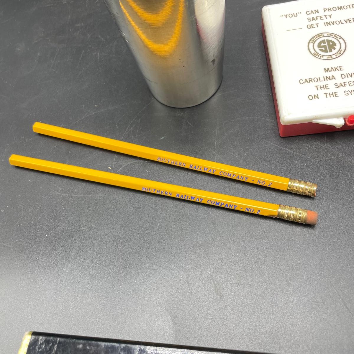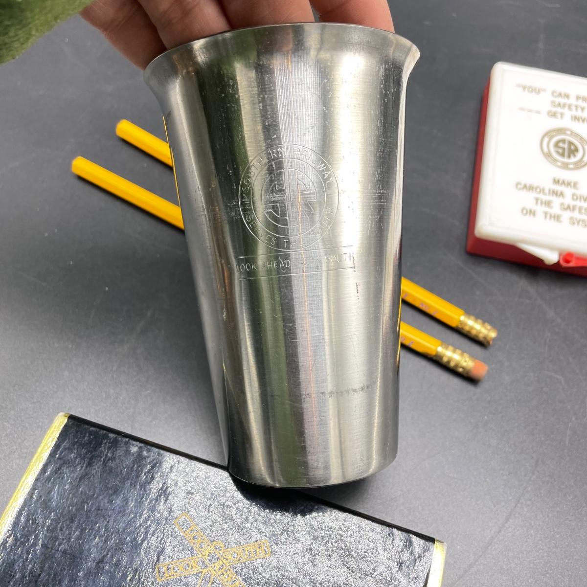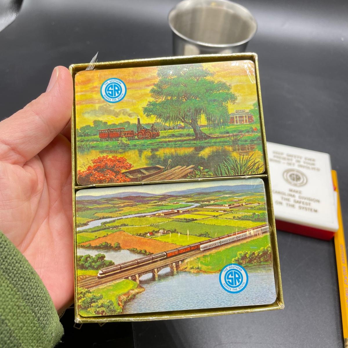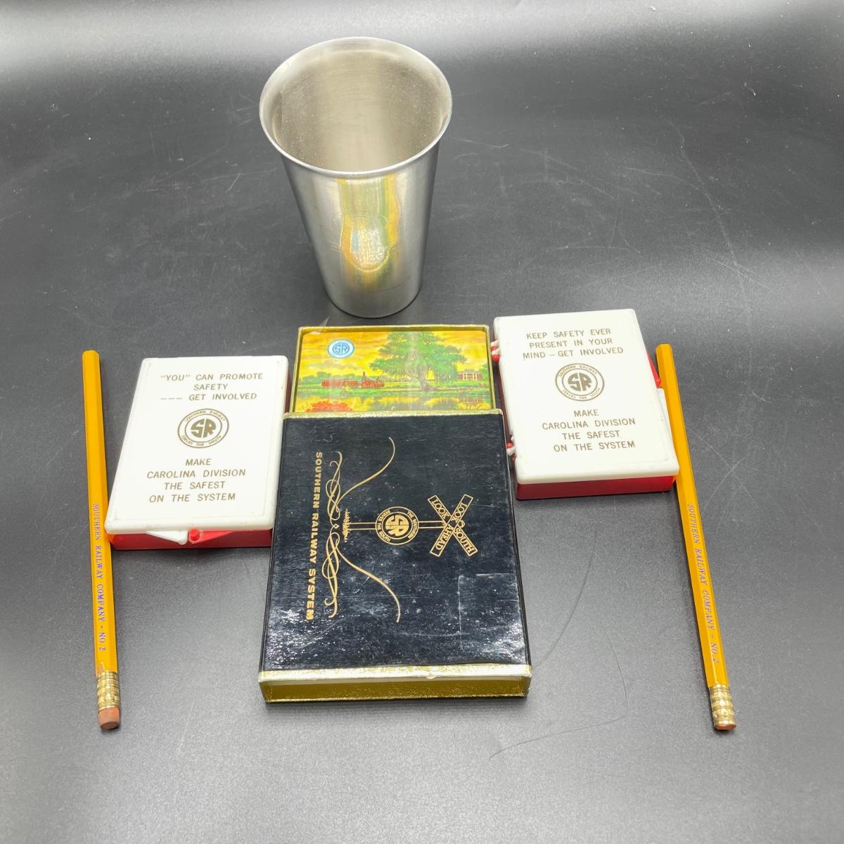 Two decks of cards with RR scenes, appearing to be wrapped in original plastic. Two open first aid kits to “Make Carolina Division the Safest on the System” Two #2 pencils - one is missing it’s eraser and a stainless steel tumbler that stands about 4.5” tall. Shipping available.