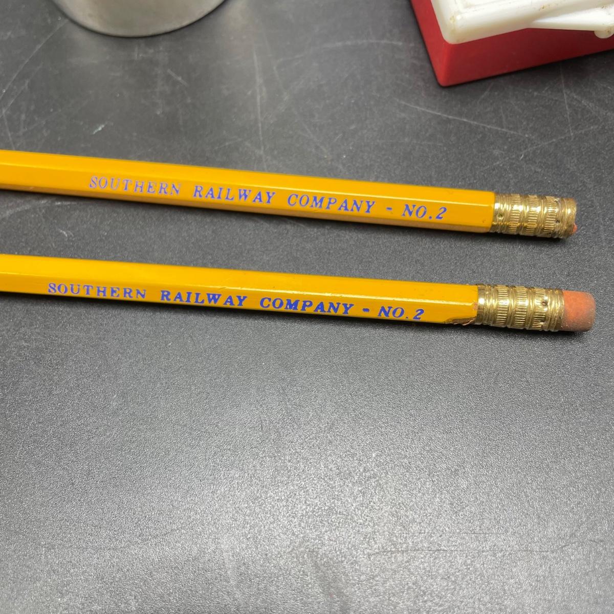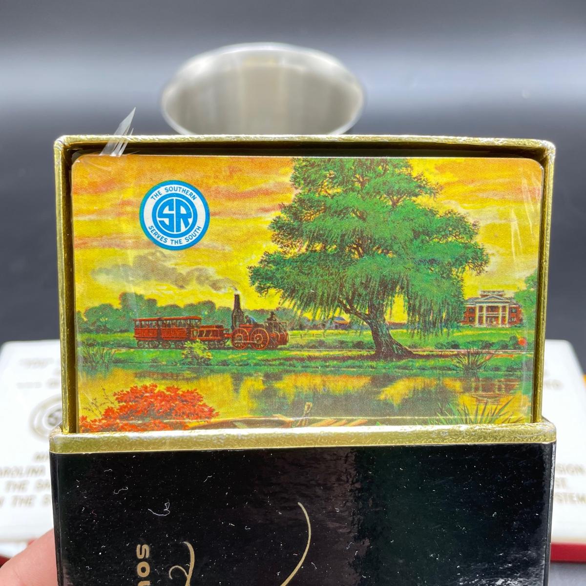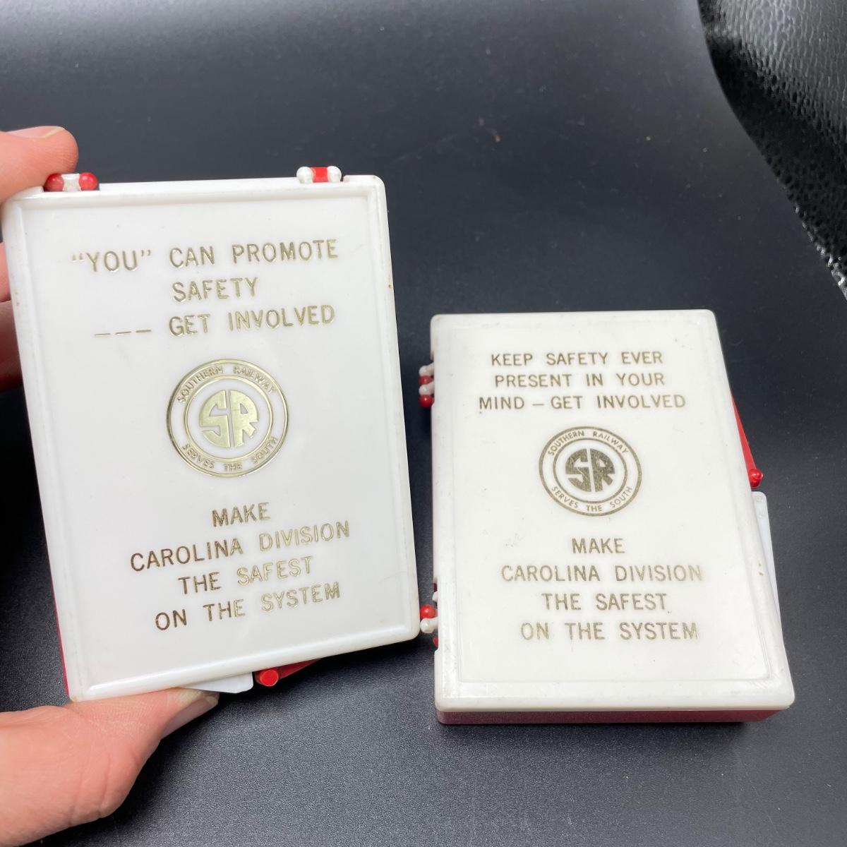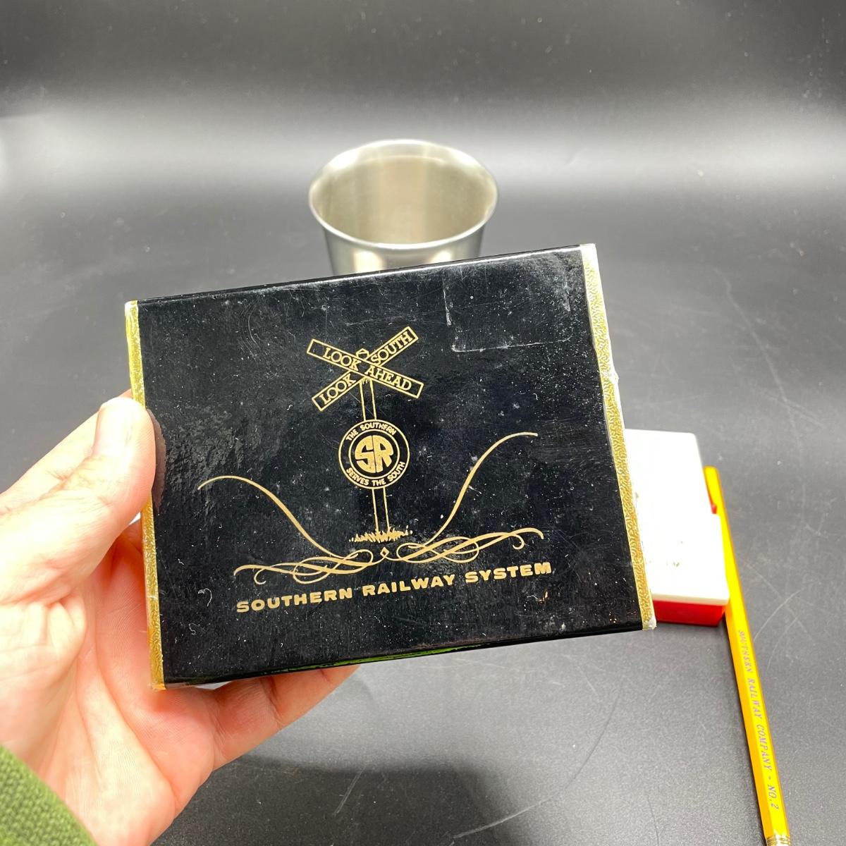 Two decks of cards with RR scenes, appearing to be wrapped in original plastic. Two open first aid kits to “Make Carolina Division the Safest on the System” Two #2 pencils - one is missing it’s eraser and a stainless steel tumbler that stands about 4.5” tall. Shipping available.