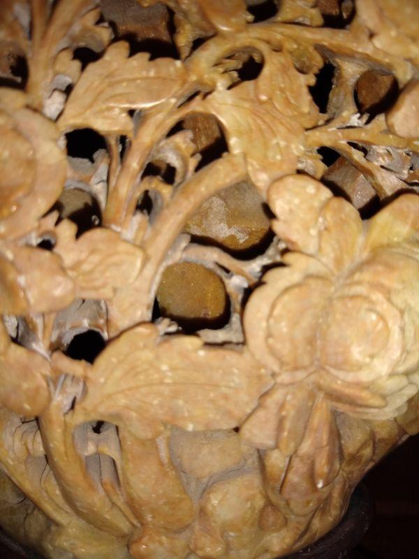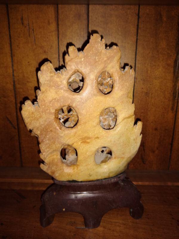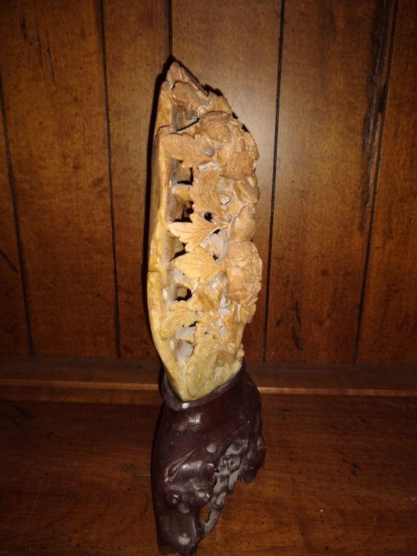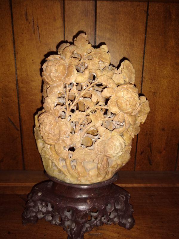 Soap Stone flower carvings on base of wood, A chrysanthemum plant with buds leaves and flowers.