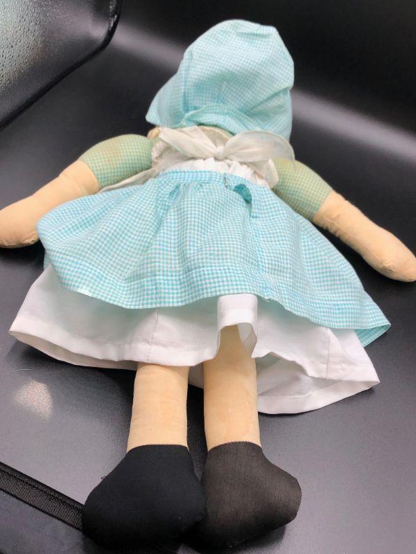 Vintage soft body cloth doll. "Blonde" braided yarn hair and a hand stitched face. She is in good condition with no holes, but does have some discoloring and spots.